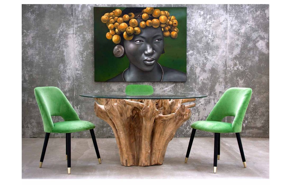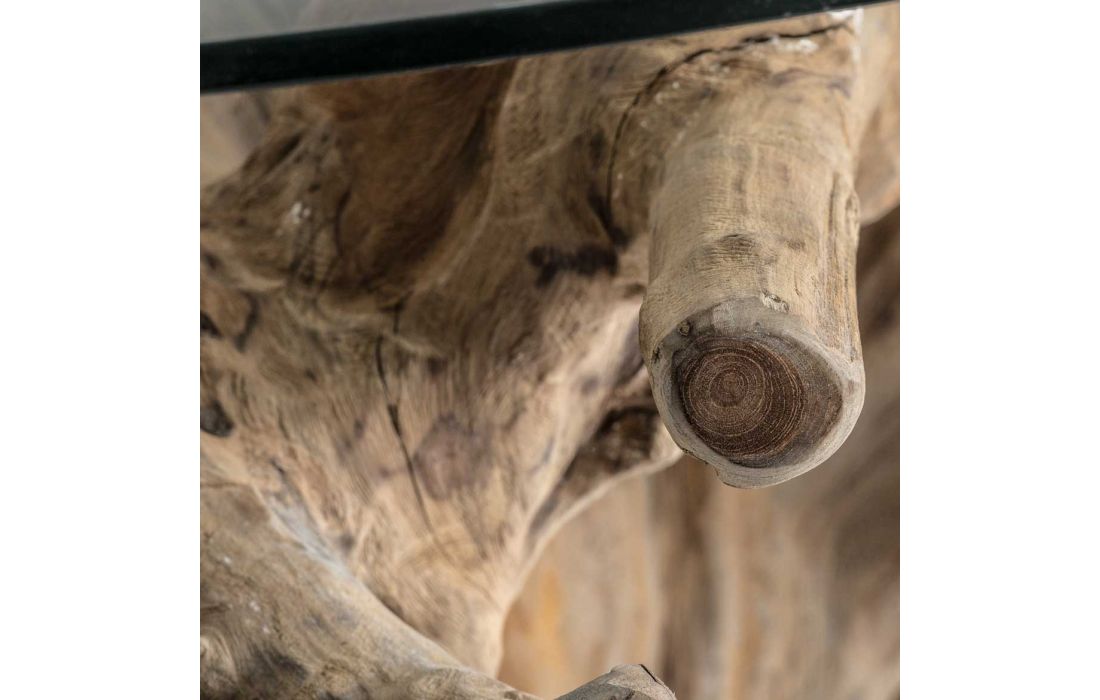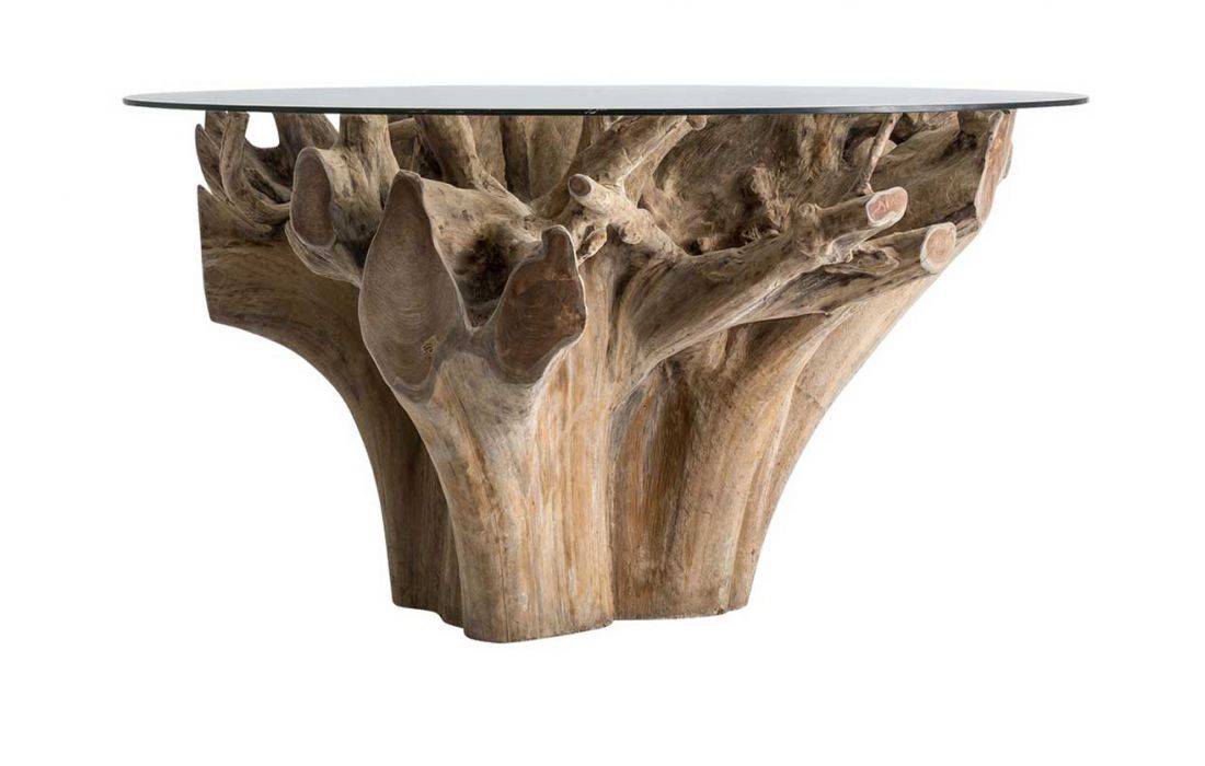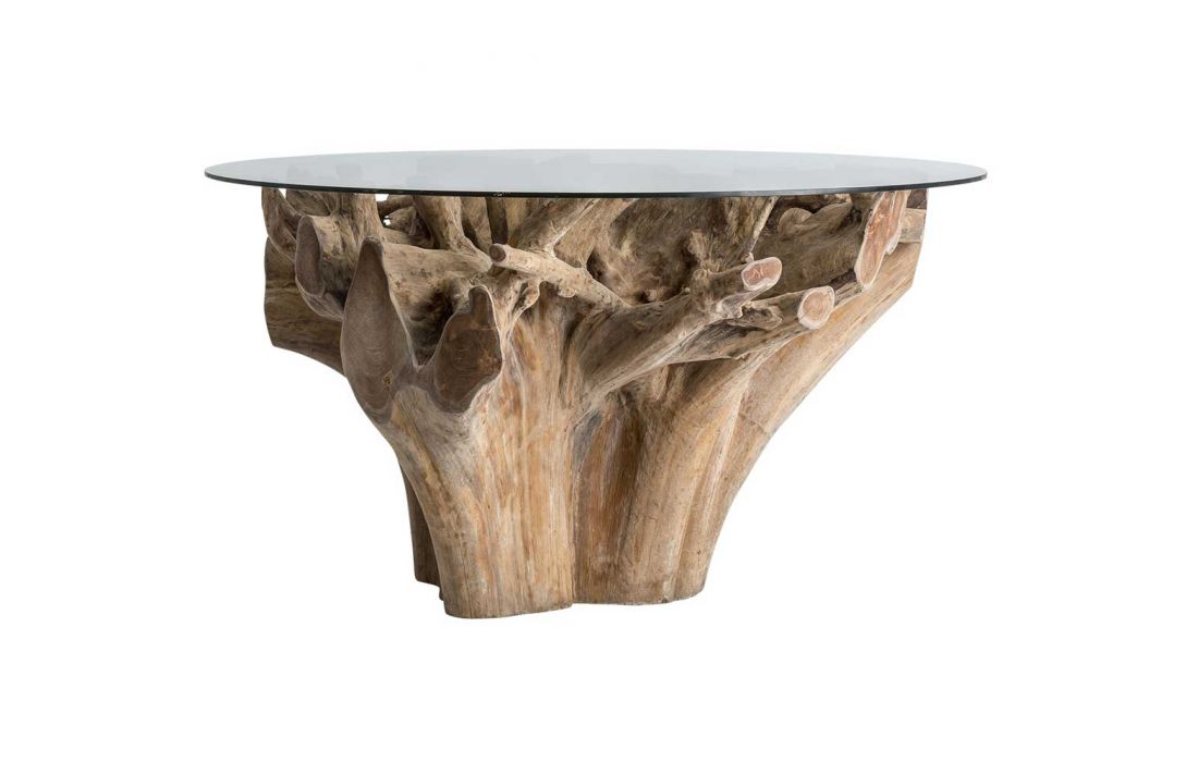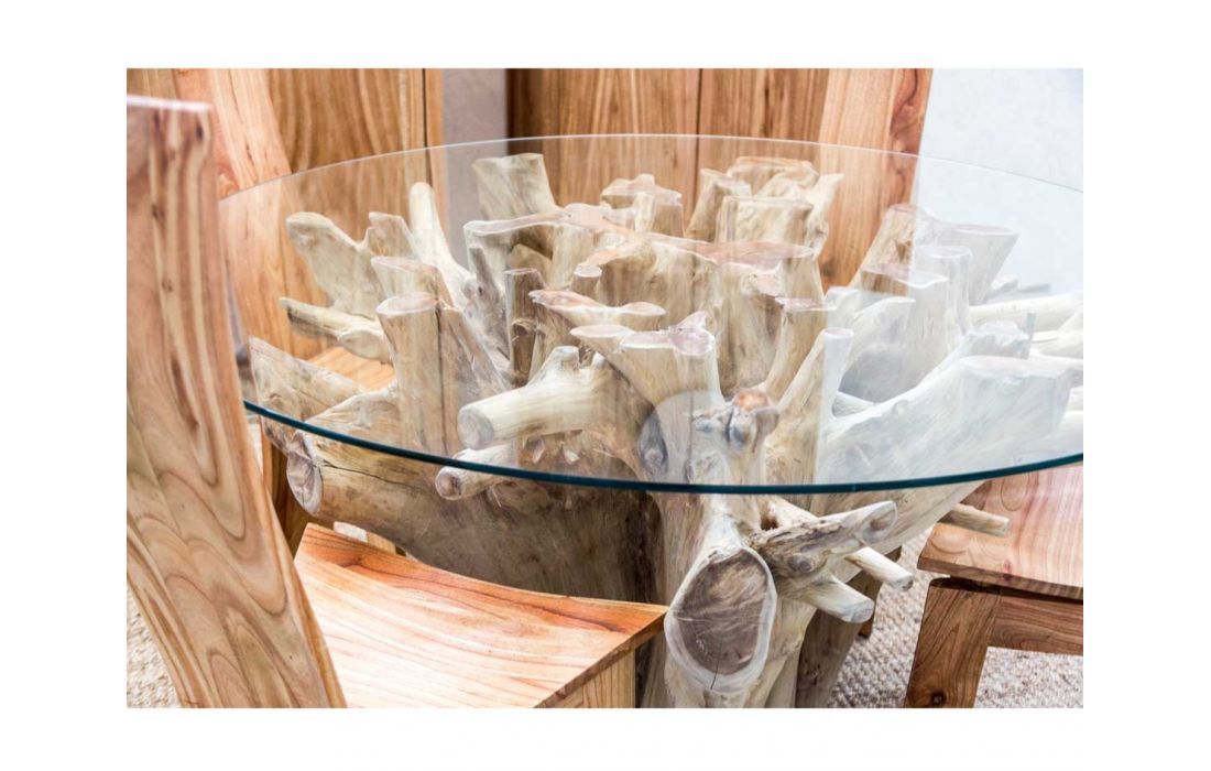Mesa de jantar de cor natural, estilo étnico, feita em raiz de teka vidro.
