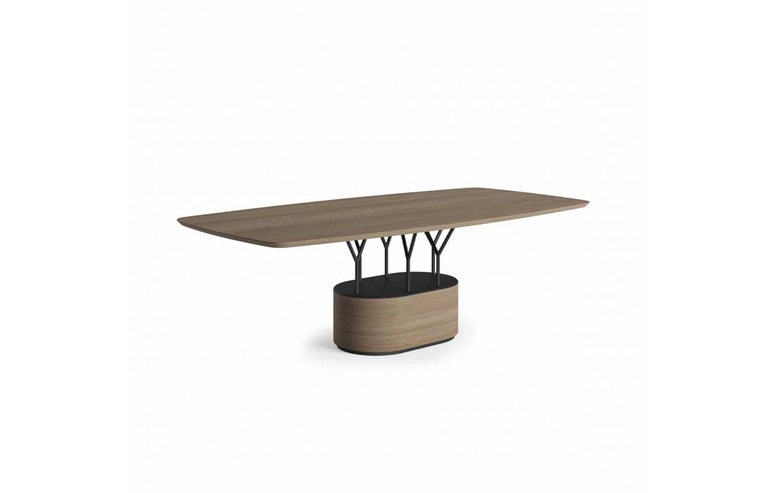 Mesa de Jantar retangular com tampo em MDF folheado a nogueira e pé combinado de nogueira e ferro lacado.