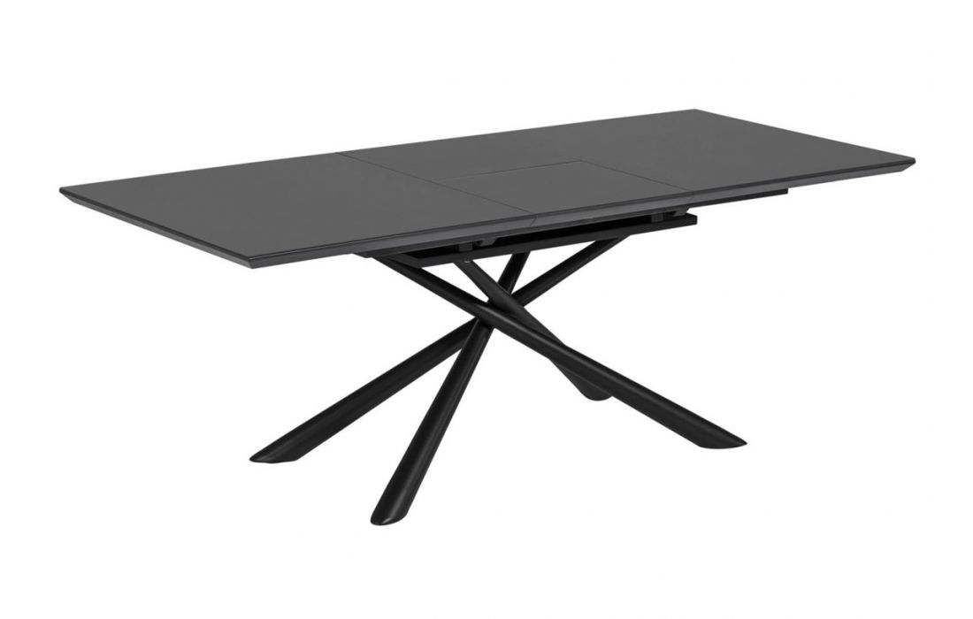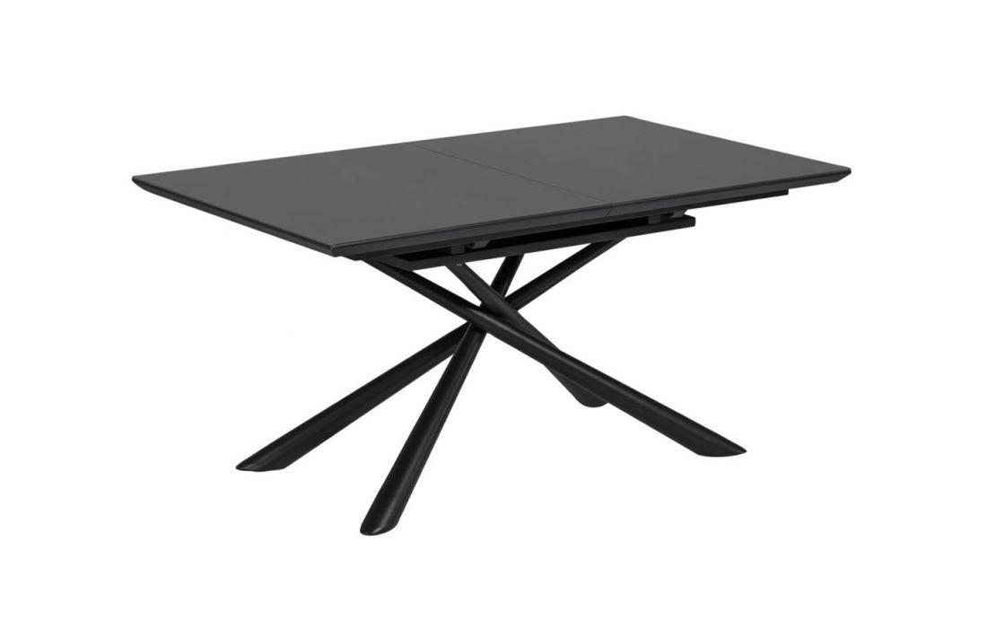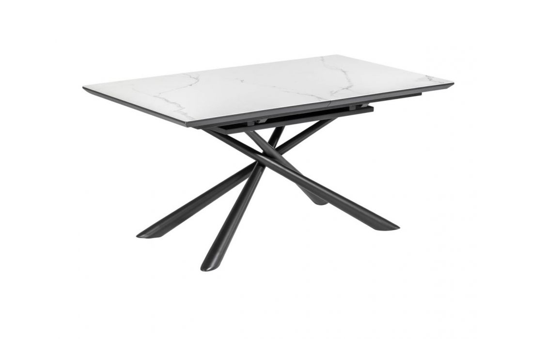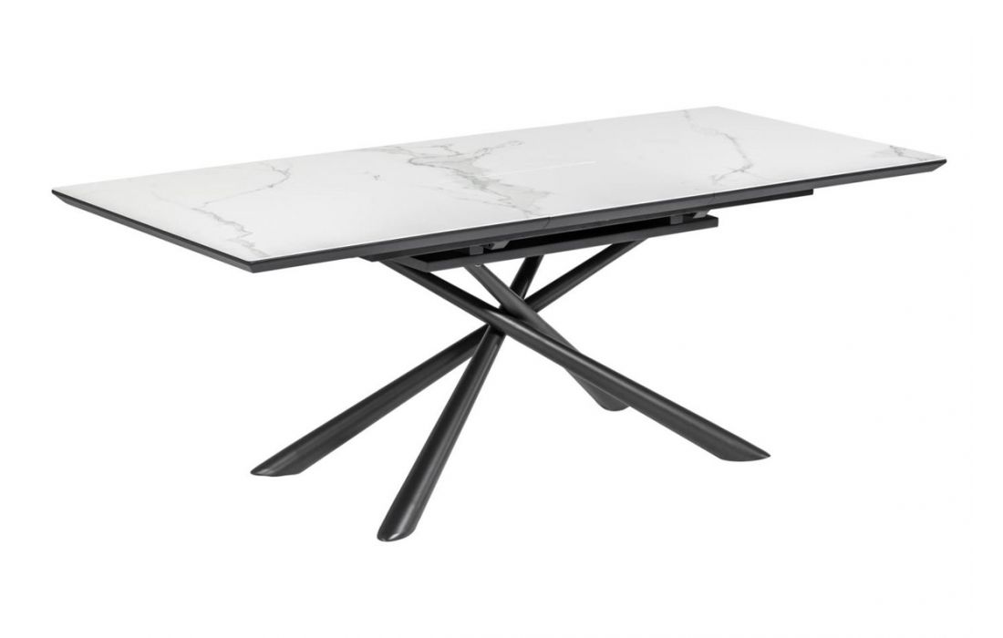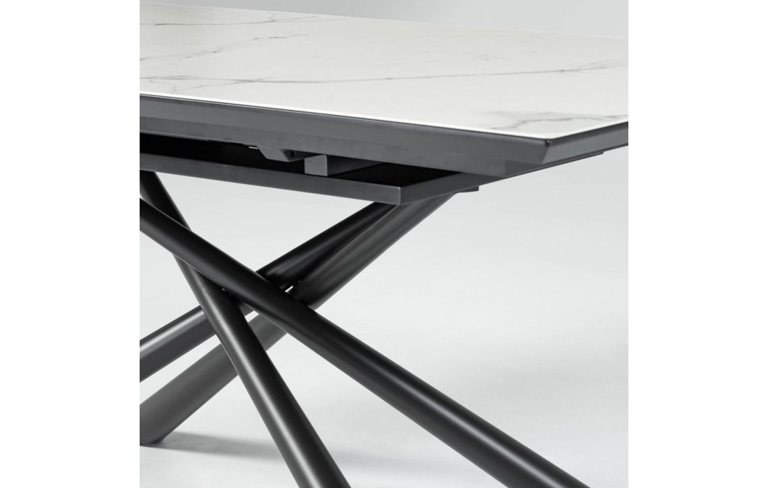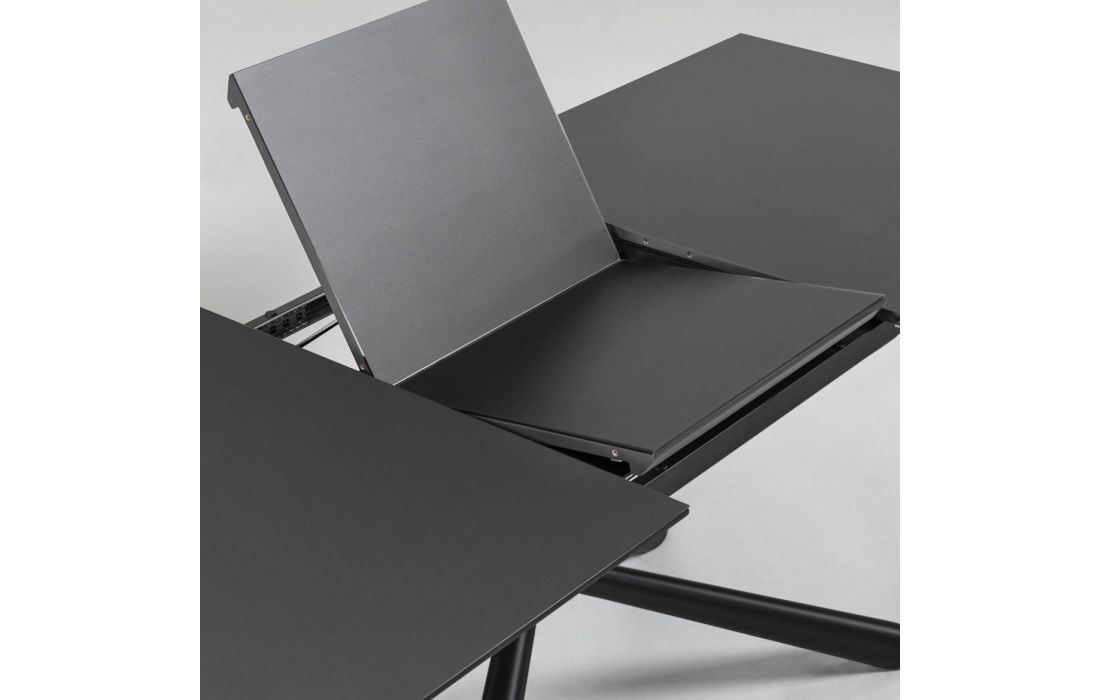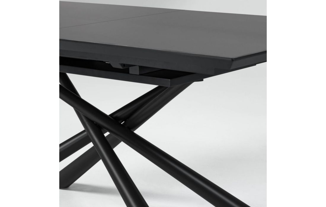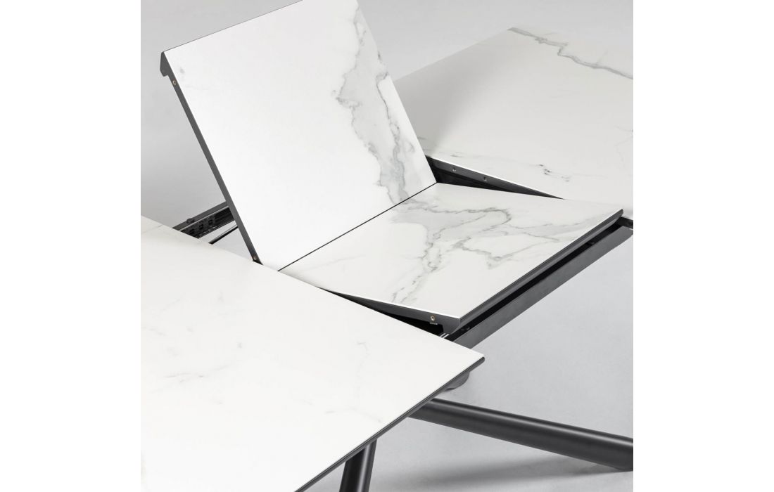 Mesa de jantar extensível com estrutura em metal, com tampo em cerâmica ou vidro.