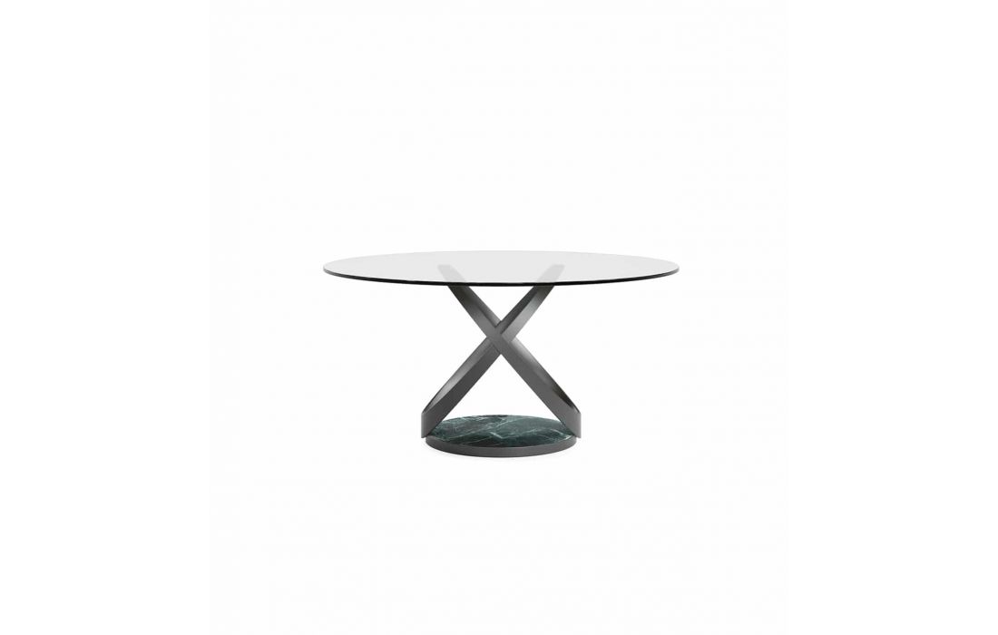 Mesa de jantar redonda com tampo em vidro e pés em ferro pintado de preto apoiados numa base em pedra Guatemala.