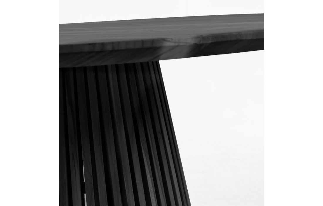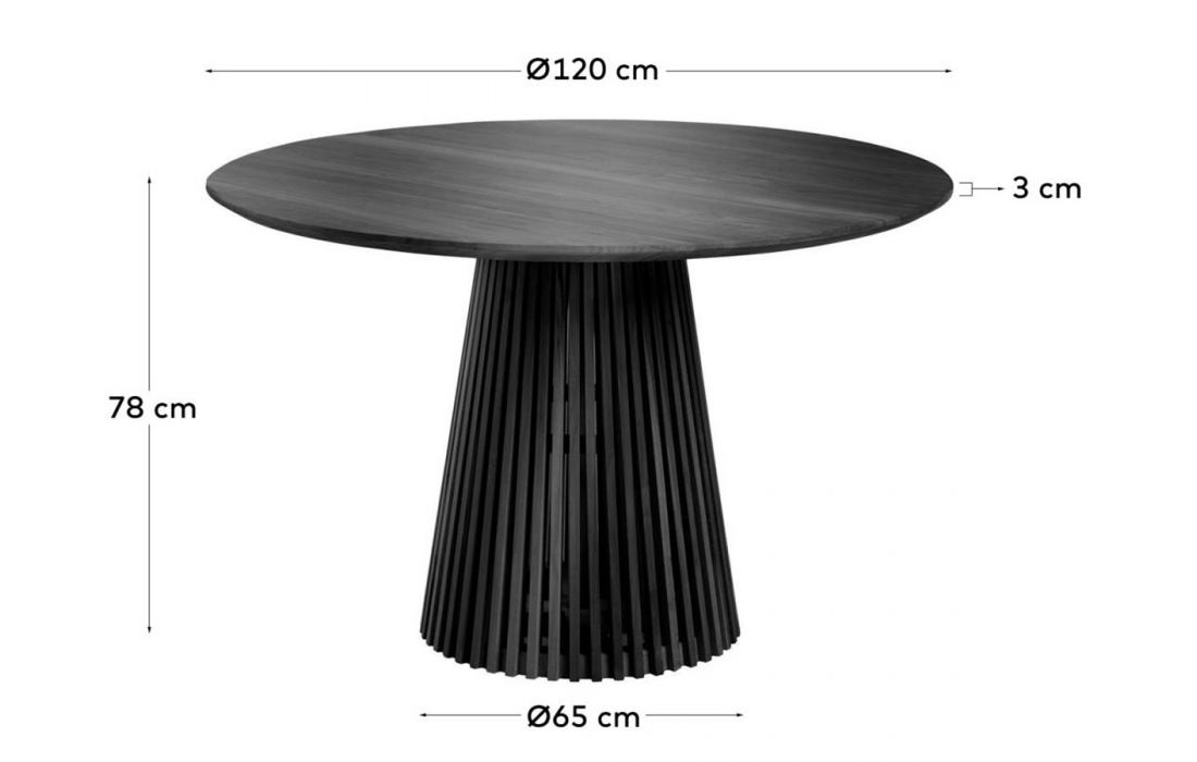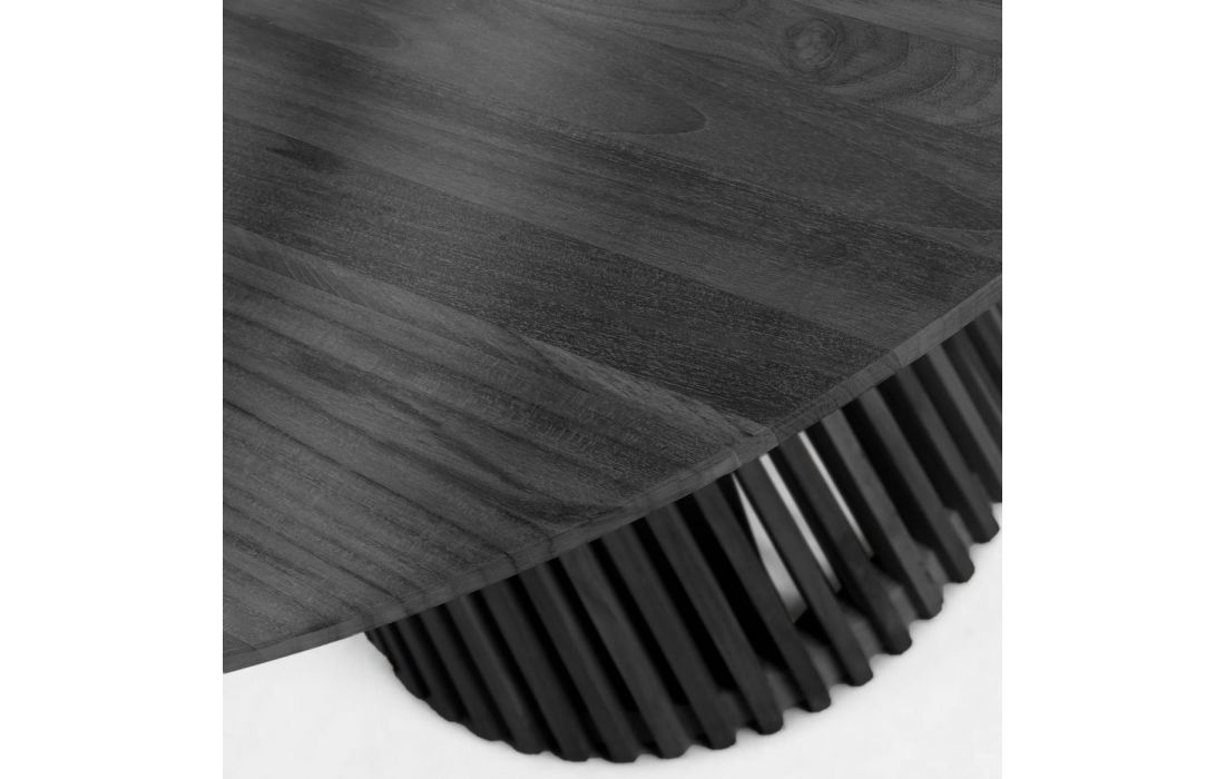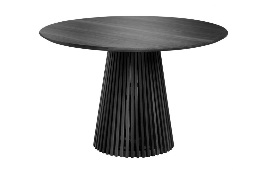 Mesa de jantar redonda em madeira de mindi com acabamento preto.