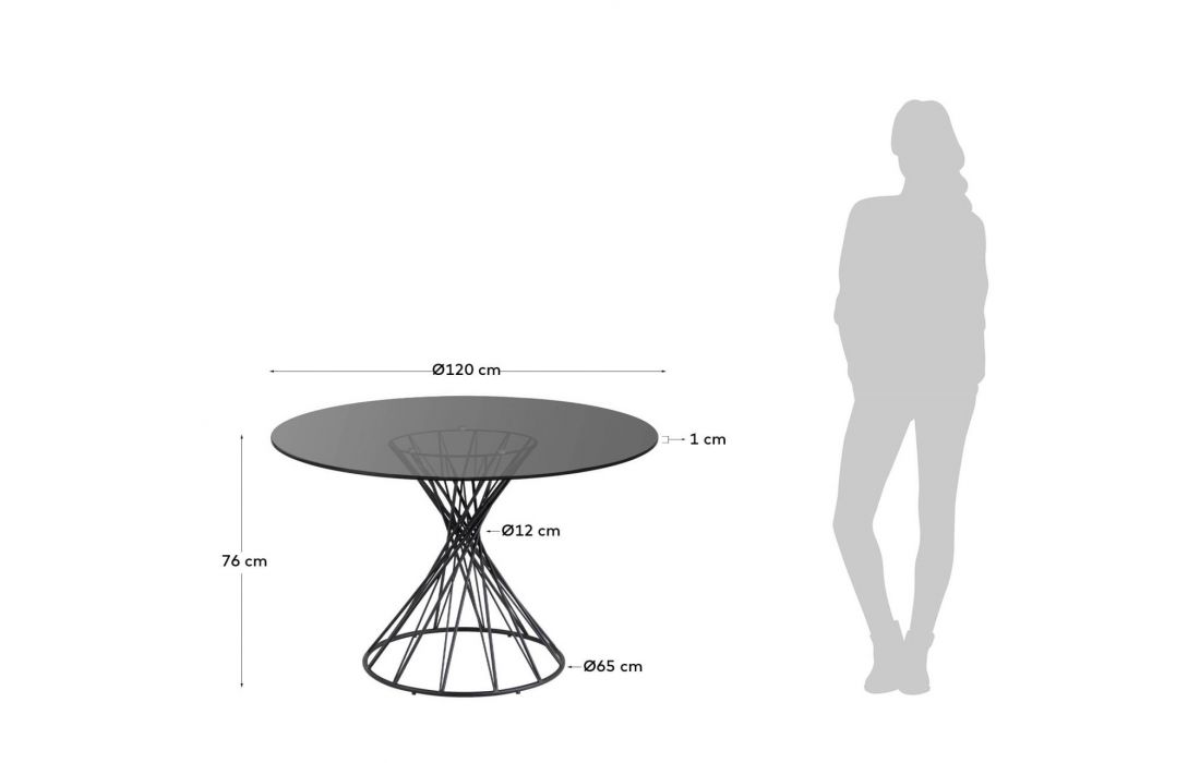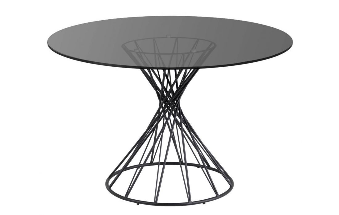 Mesa redonda com estrutura em aço e tampo de vidro temperado.