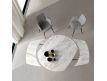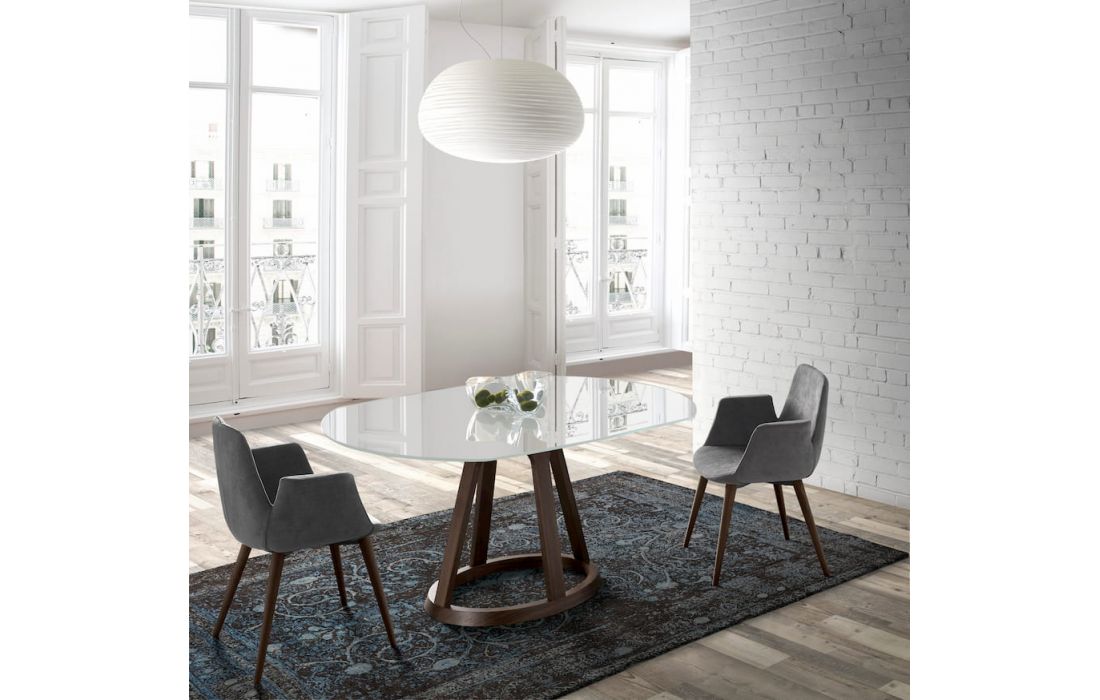 Mesa oval de extensão automática de tampo em vidro lacobel Branco 10mm com tampo Porcelánico de 3mm + 10mm e possibilidade de pernas em acabamento à cor de madeira ou lacado