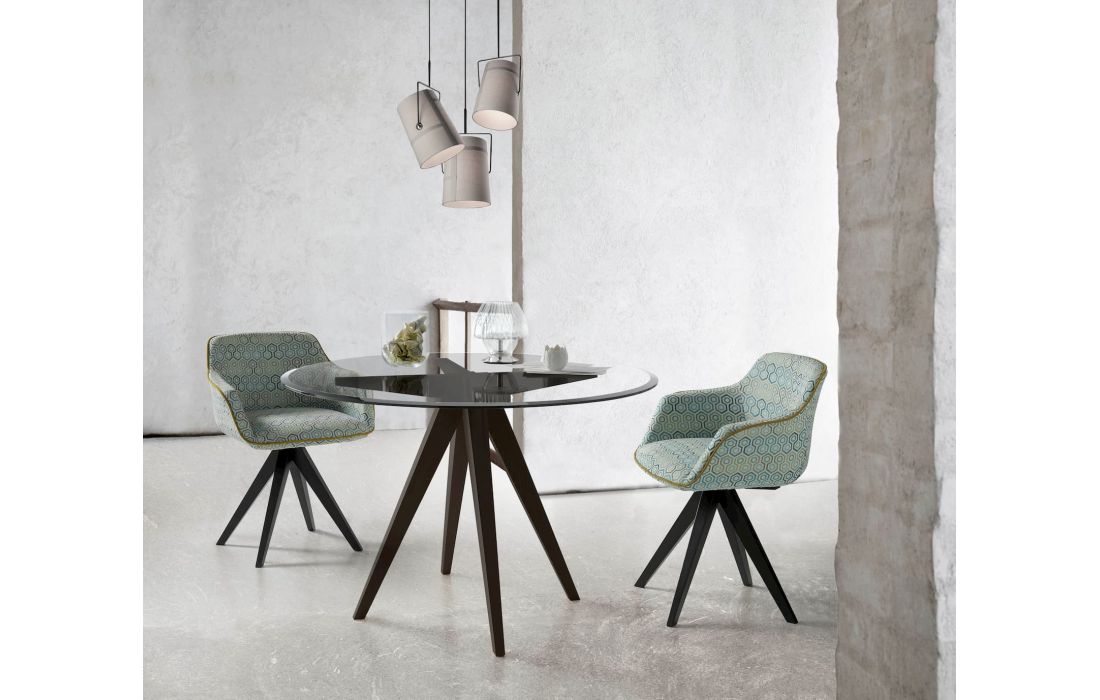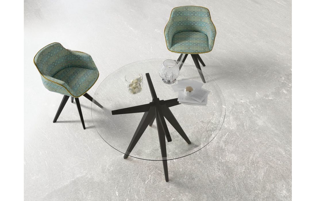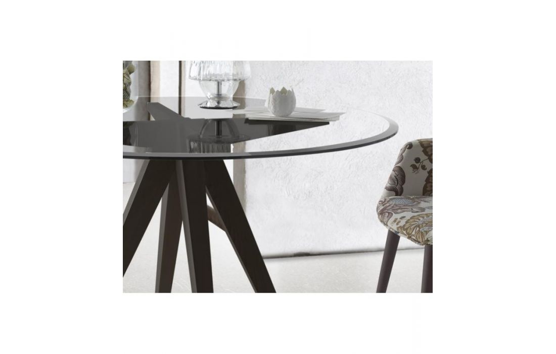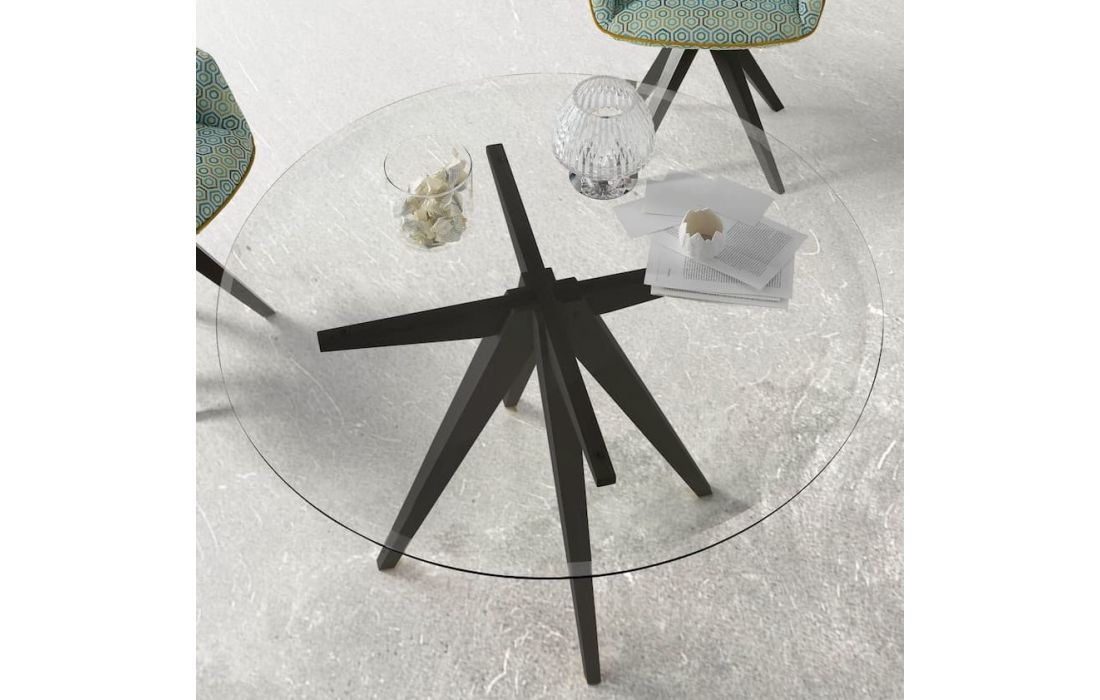 Mesa redonda, em 3 tamanhos, de vidro transparente de 12mm ou tampo em mármore de 12mm e possibilidade de pernas em acabamento à cor de madeira ou lacado