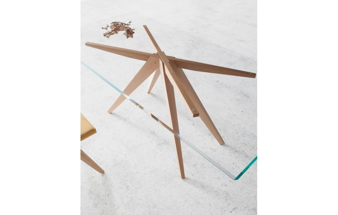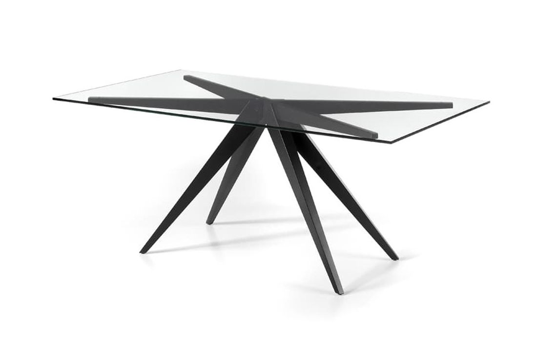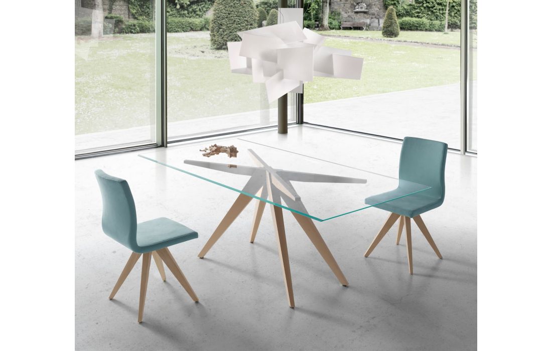 Mesa retangular em 3 tamanhos e um tamanho em oval, de vidro transparente de 10mm e possibilidade de pernas em acabamento à cor de madeira ou lacado