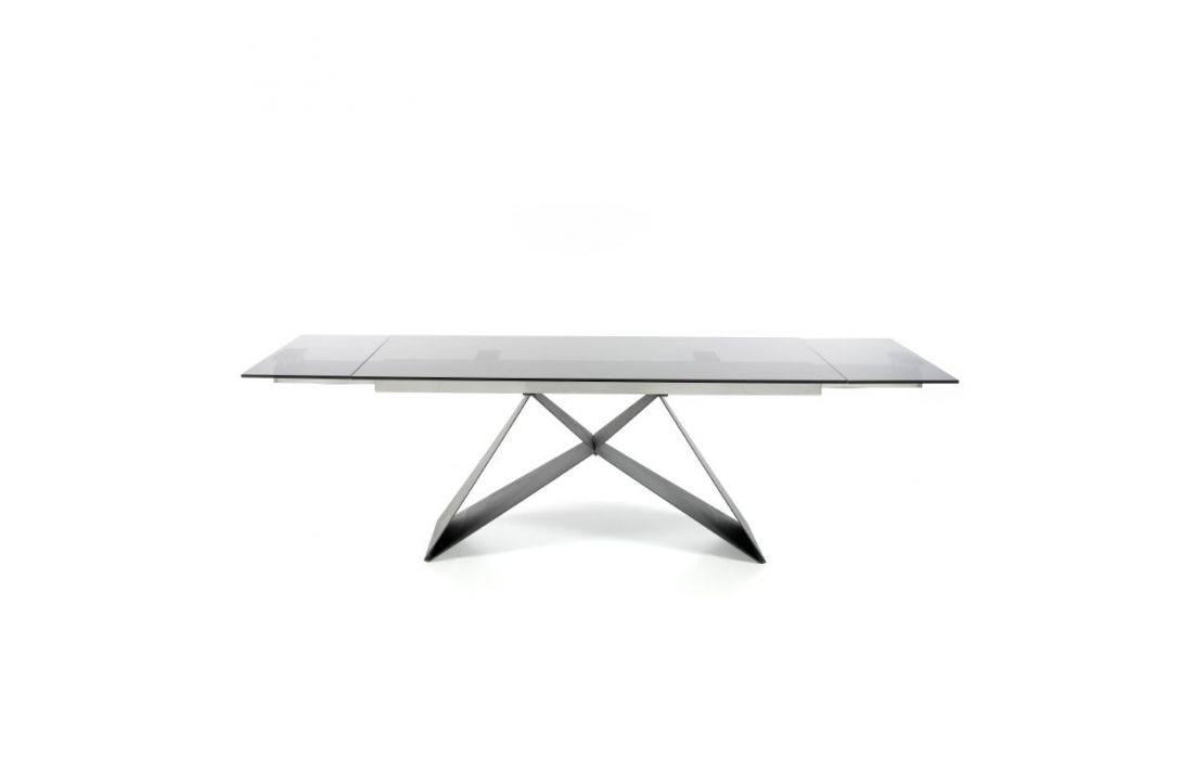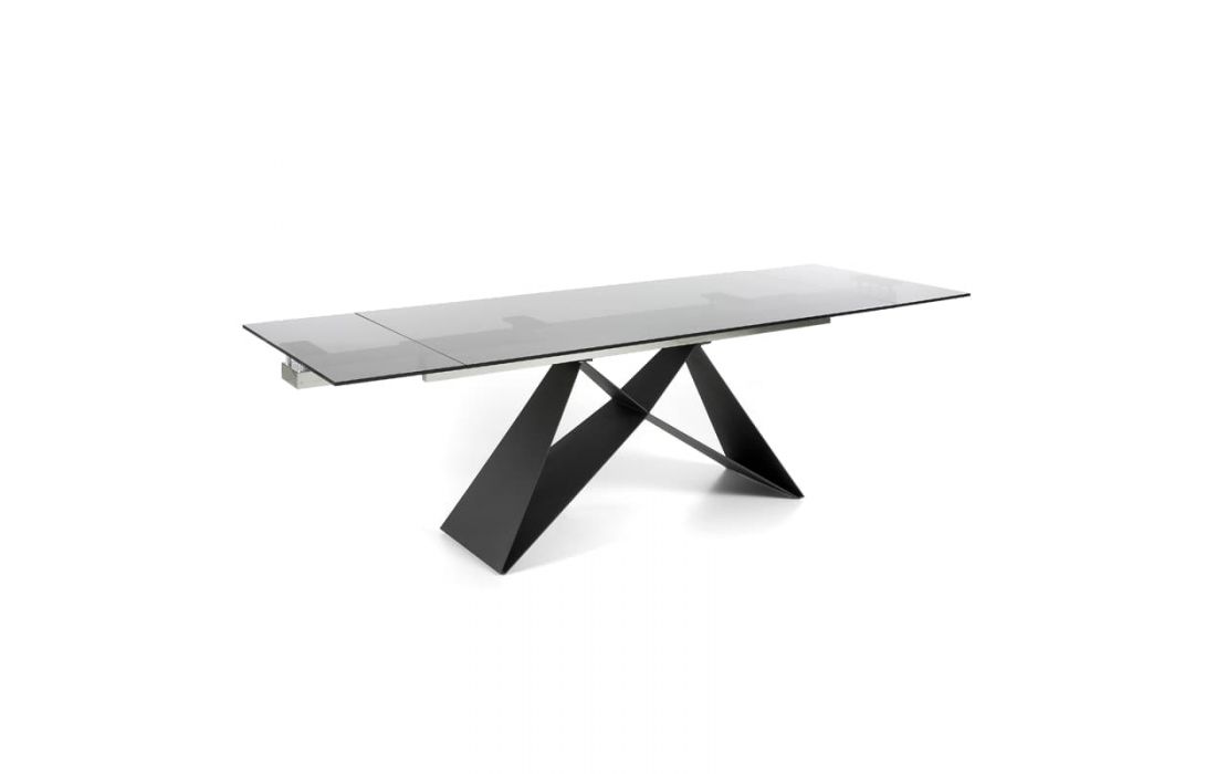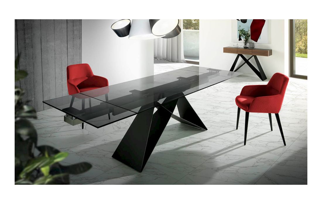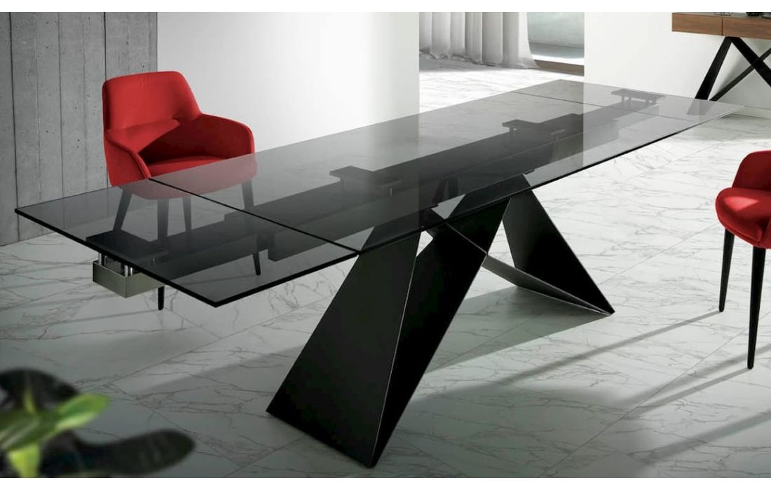 Mesa retangular extensível, em 2 tamanhos, de tampo vidro transparente ou cinzento de 12mm e possibilidade de pernas em acabamento lacado