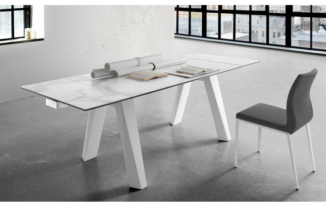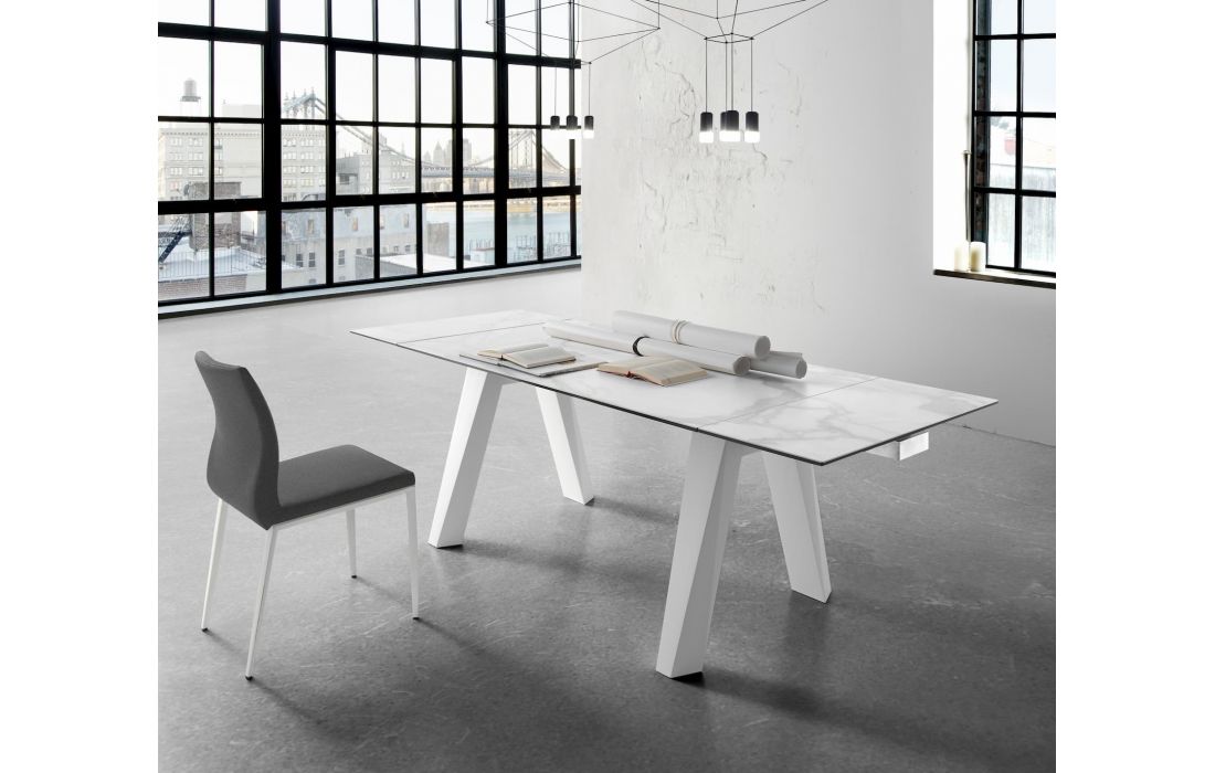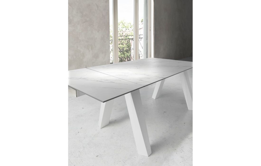 Mesa retangular extensível, em 2 tamanhos, com tampo porcelánico 3mm+12mm e possibilidade de pernas em acabamento à cor de madeira ou lacado
