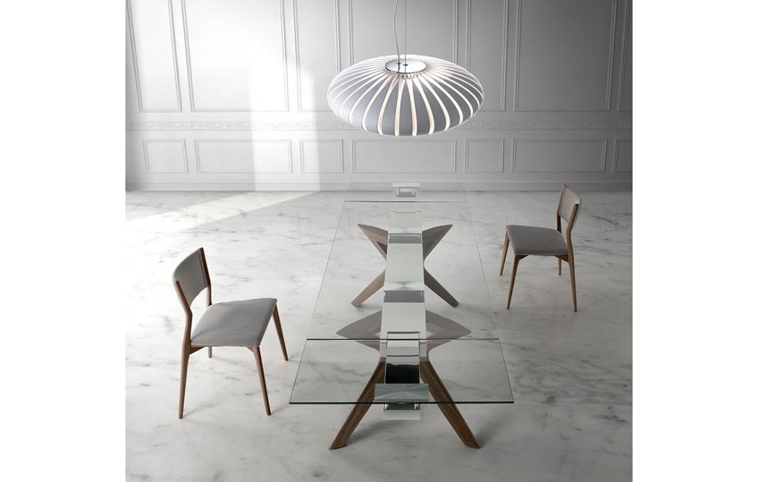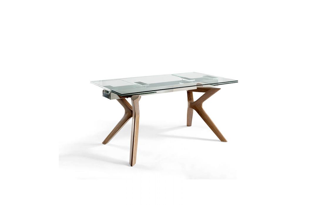 Mesa retangular extensível, em 3 tamanhos, de tampo vidro transparente ou cinzento de 12mm e possibilidade de pernas em acabamento à cor de madeira ou lacado