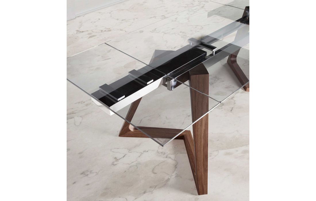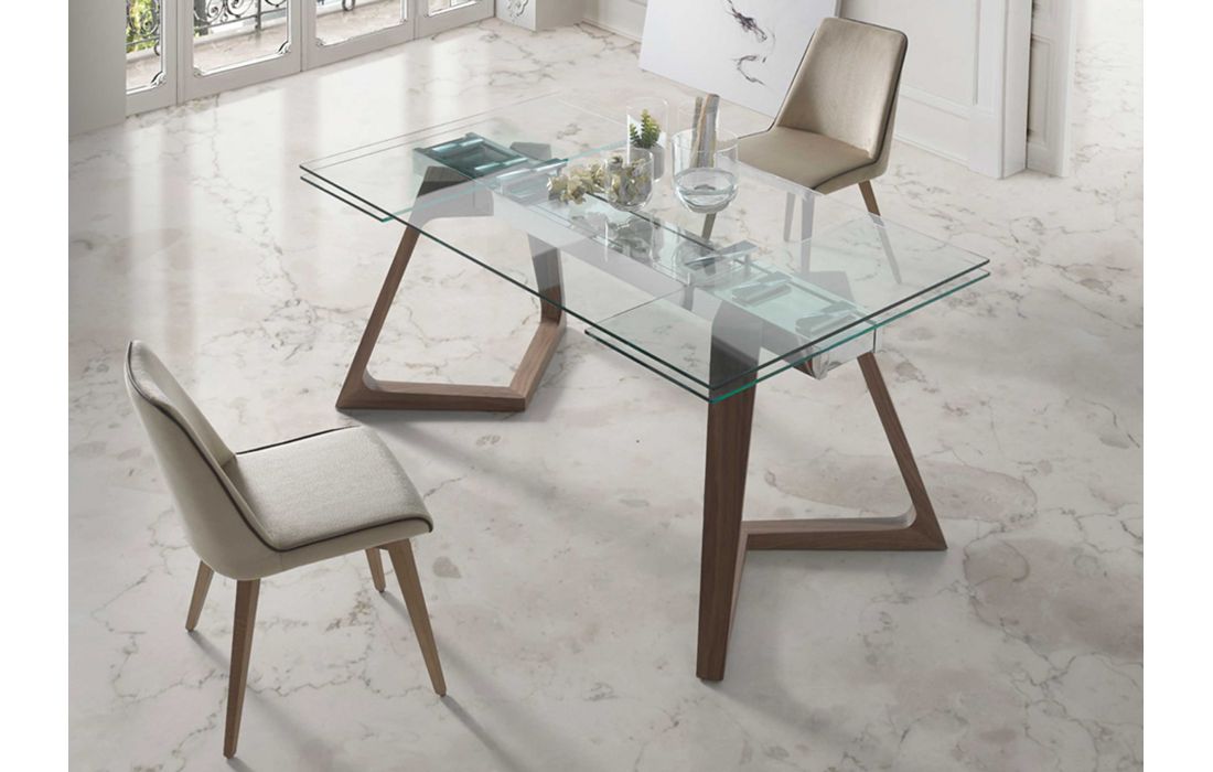 Mesa retangular extensível, em 2 tamanhos, de tampo vidro transparente ou cinzento de 12mm e possibilidade de pernas em acabamento à cor de madeira ou lacado