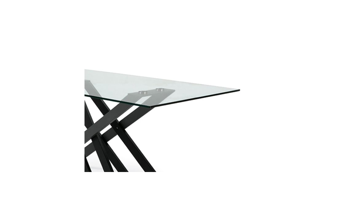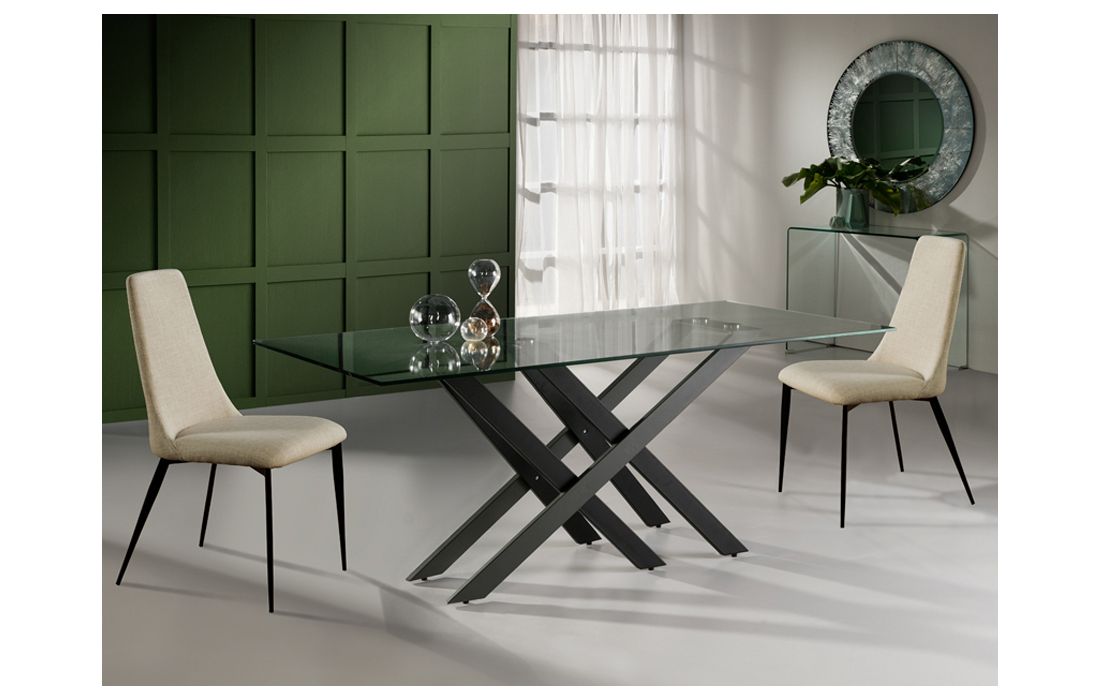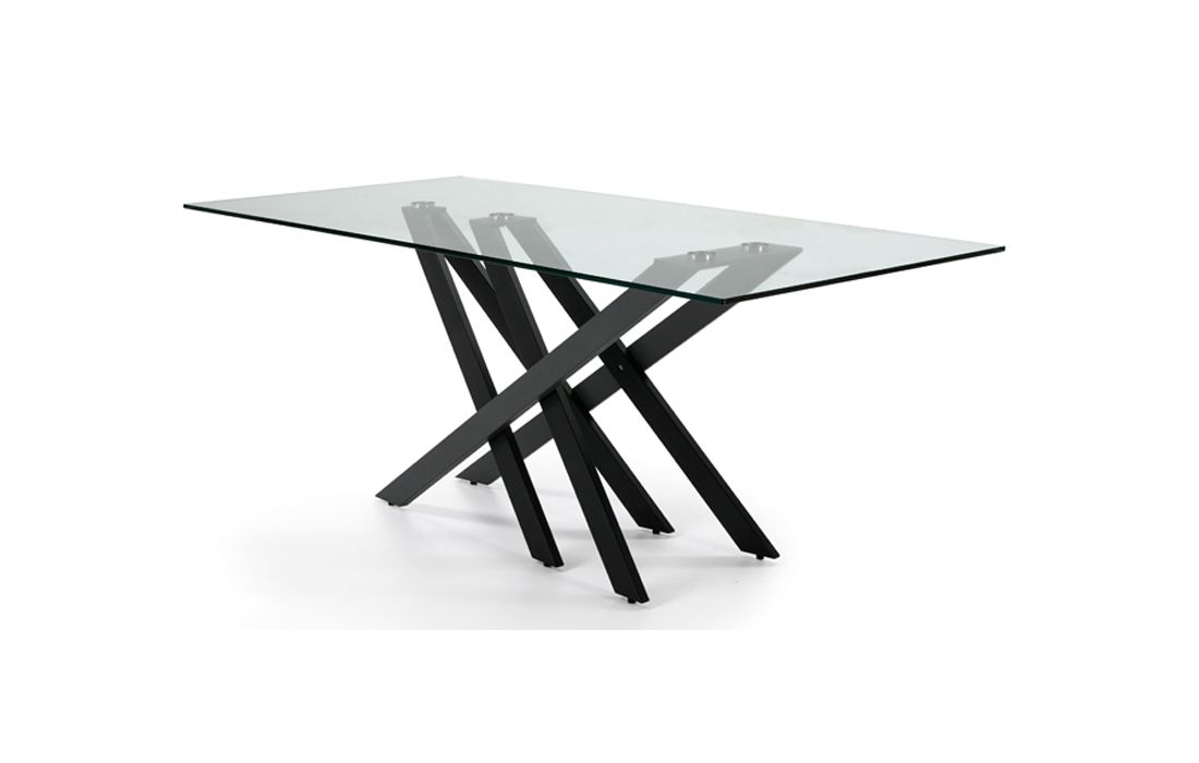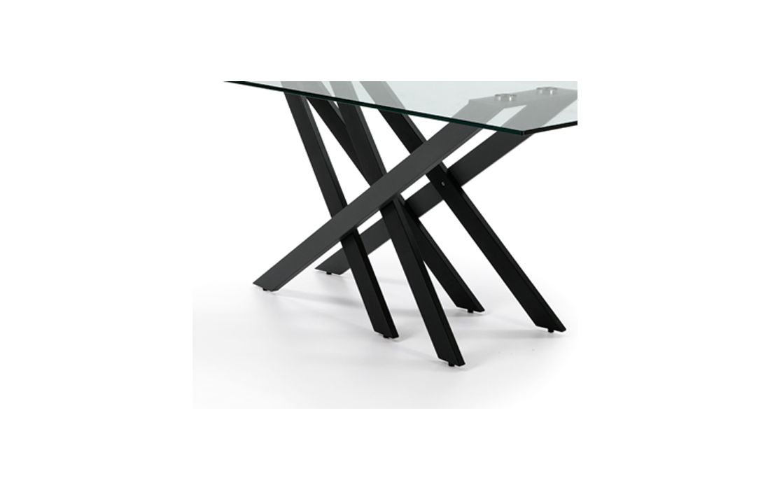 Mesa de jantar em metal lacado em cinzento e preto mate e tampo de vidro transparente de 12 mm.