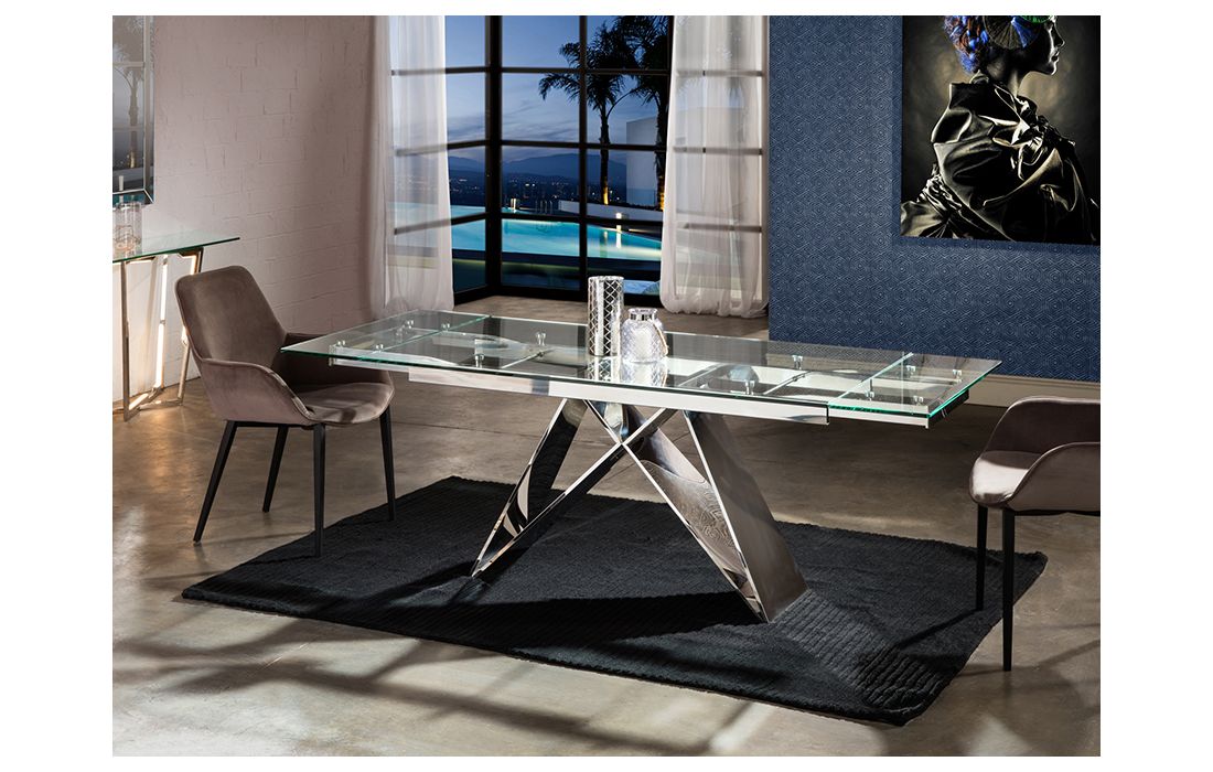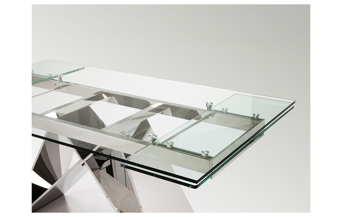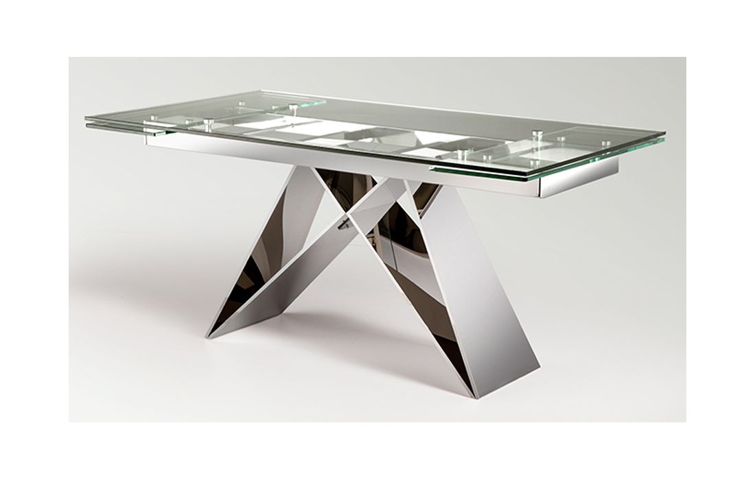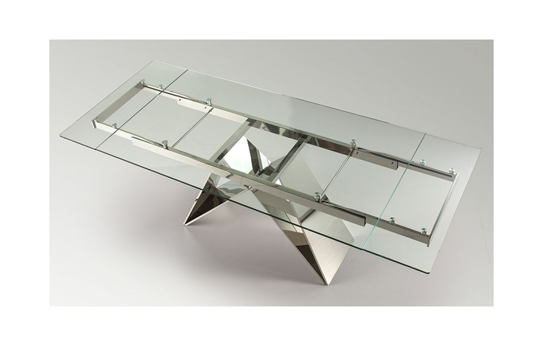 Mesa de jantar extensível em aço inoxidável, acabamento alto brilho e tampo com vidro de 12 mm, cantos polidos.