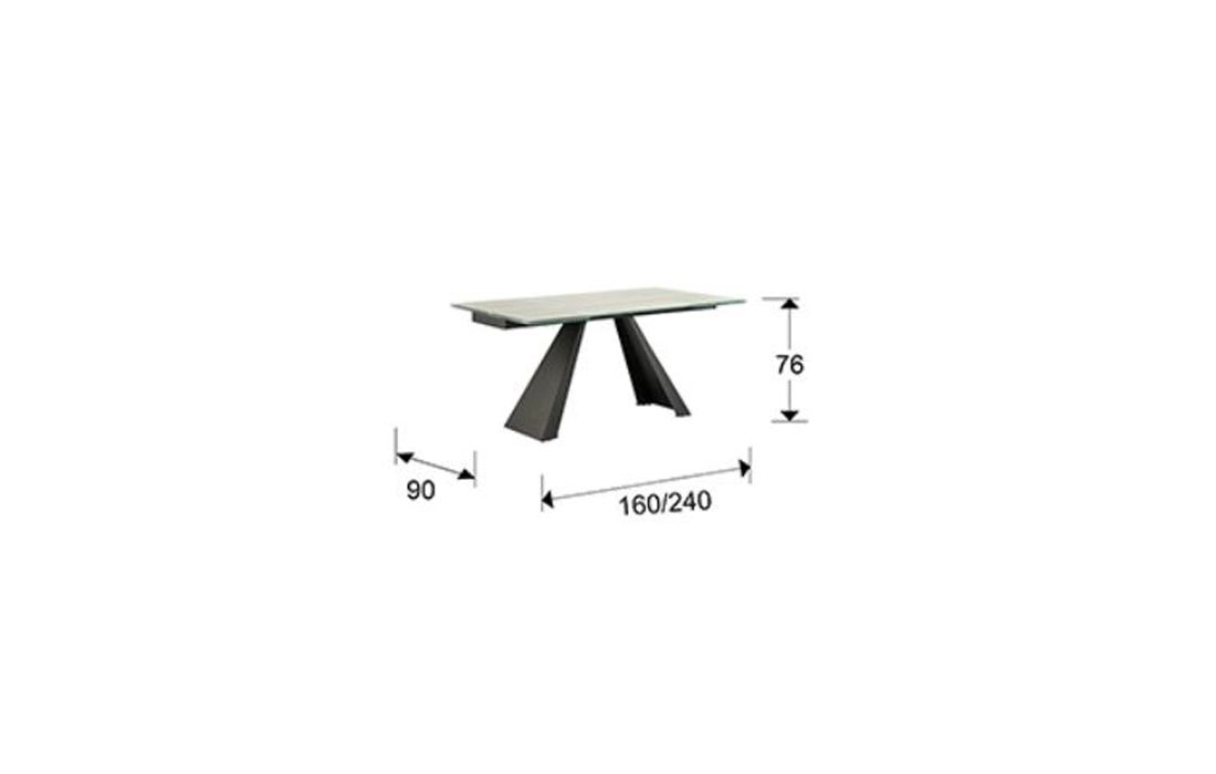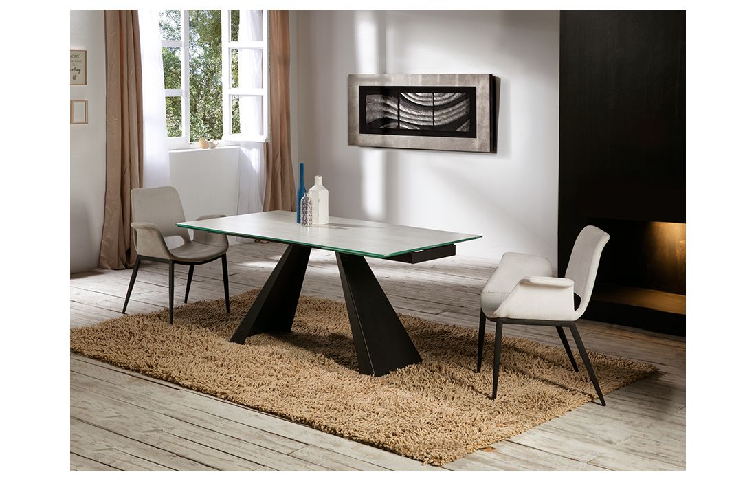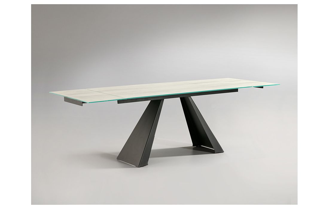 Mesa de jantar extensível com estrutura em metal com acabamento preto mate e tampo de vidro temperado de 10 mm, impressa com textura branca com veios e acabamento de alta resistência. Duas tábuas extensíveis de 40 cm.