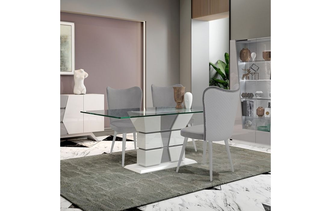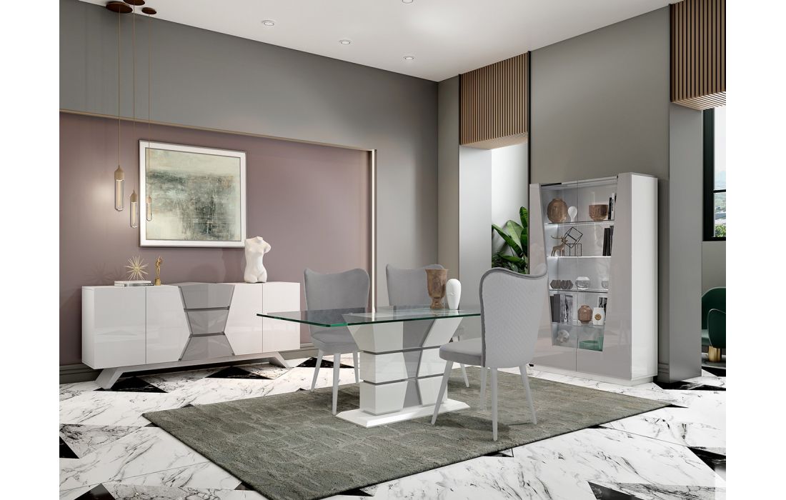 Acabamento igual à imagem: Lacado branco mate com pormenores em lacado cinza mate e tampo em vidro
