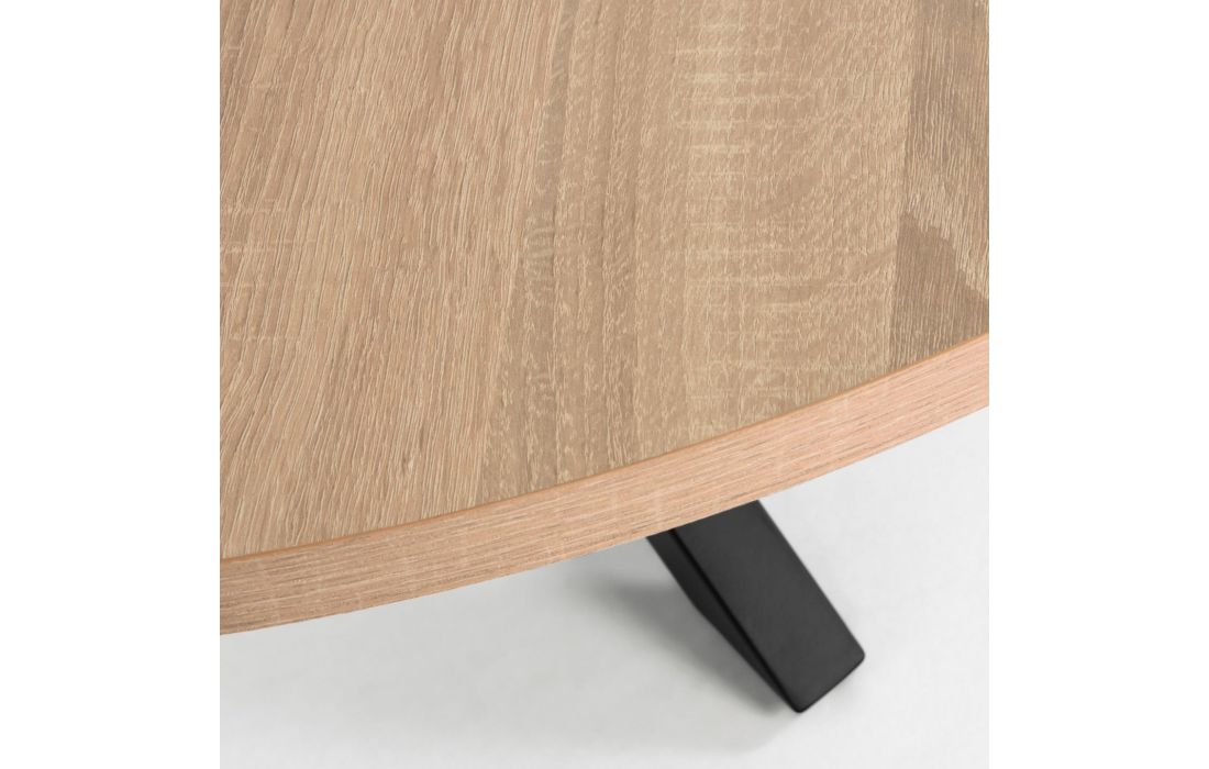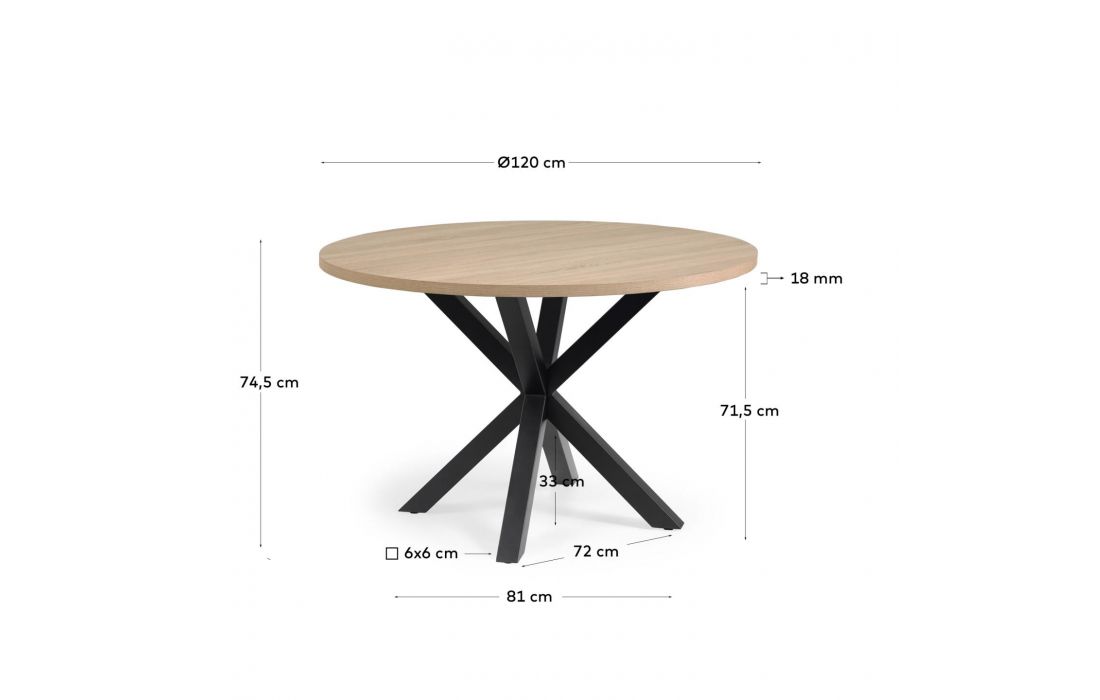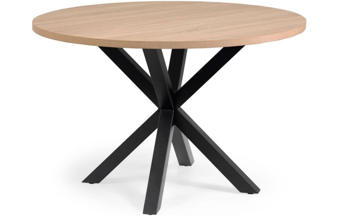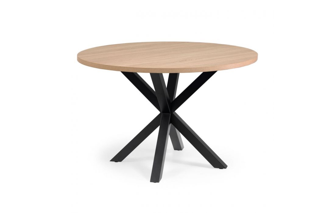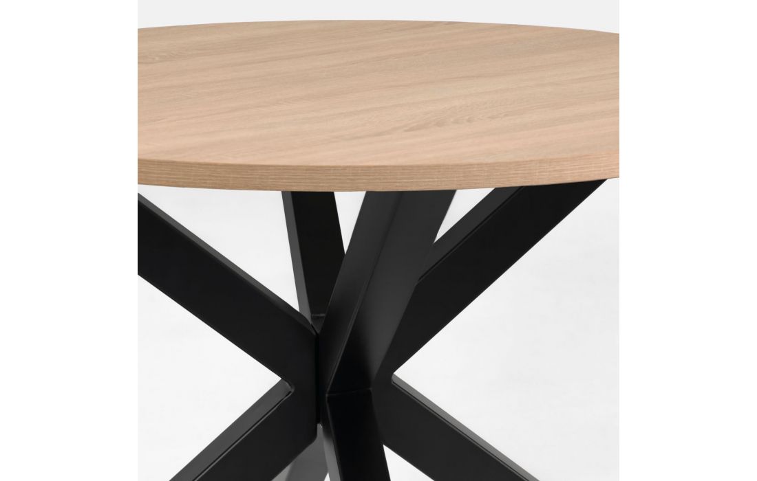 Mesa de refeições redonda com estrutura em metal preto, com tampo de espessura 18mm em Aglomerado na cor natural.