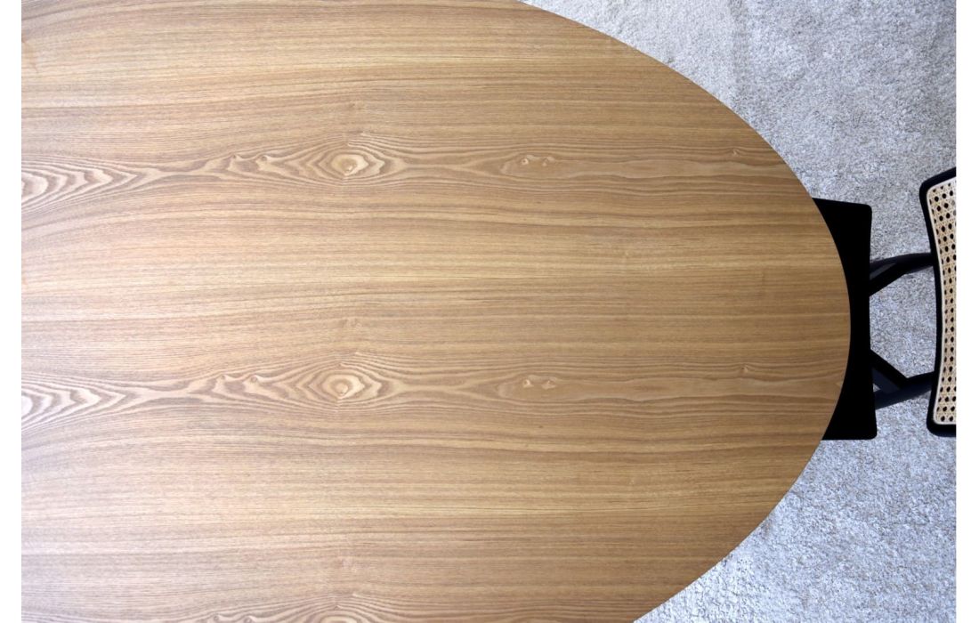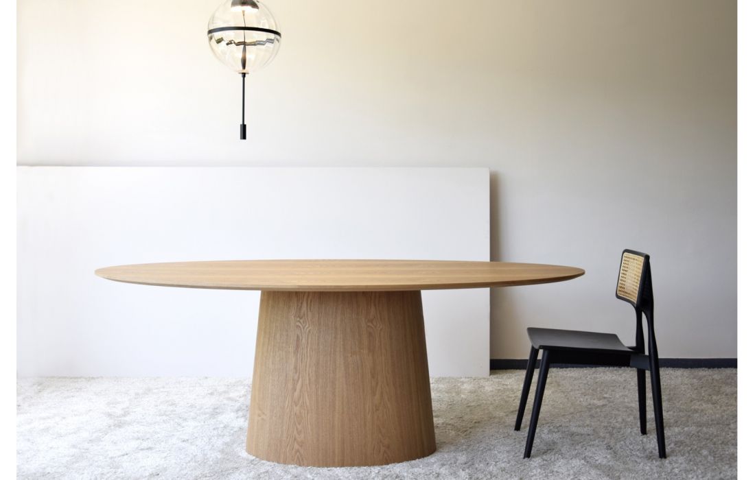 Mesa de jantar com tampo oval e base central com estética oval em acabamento natural