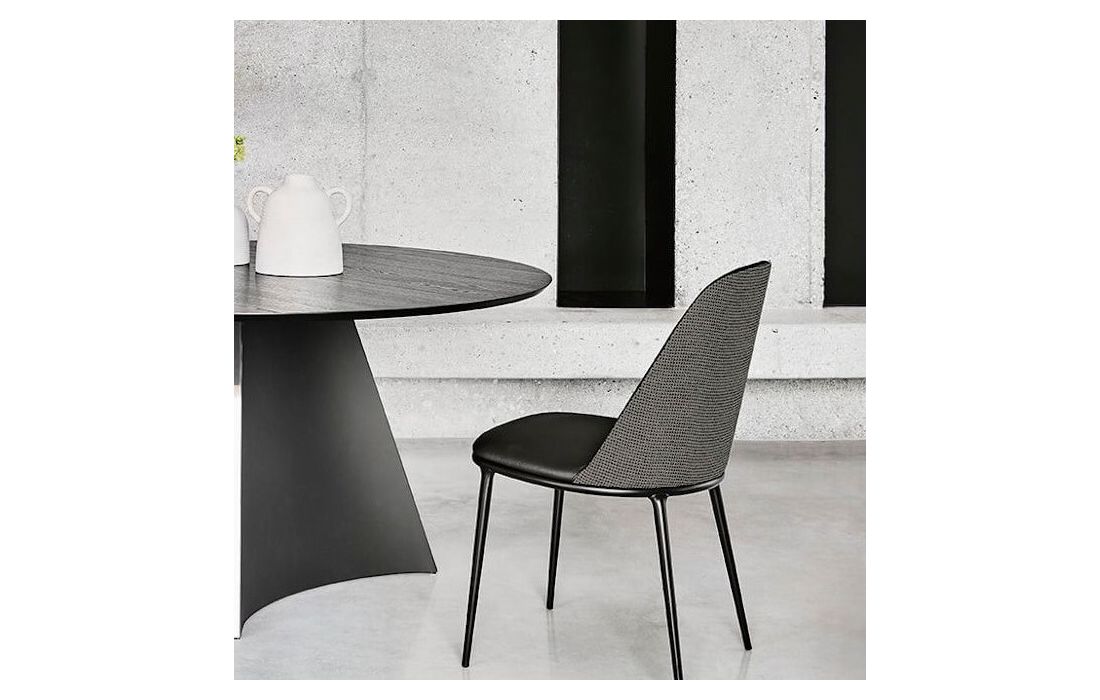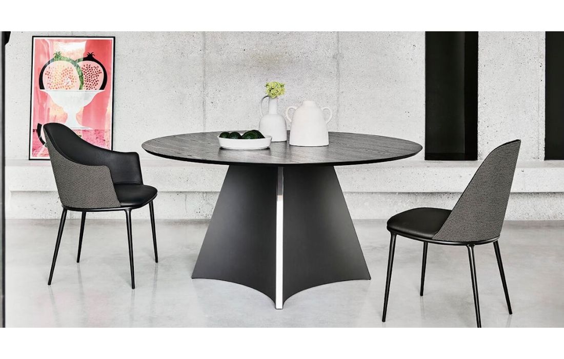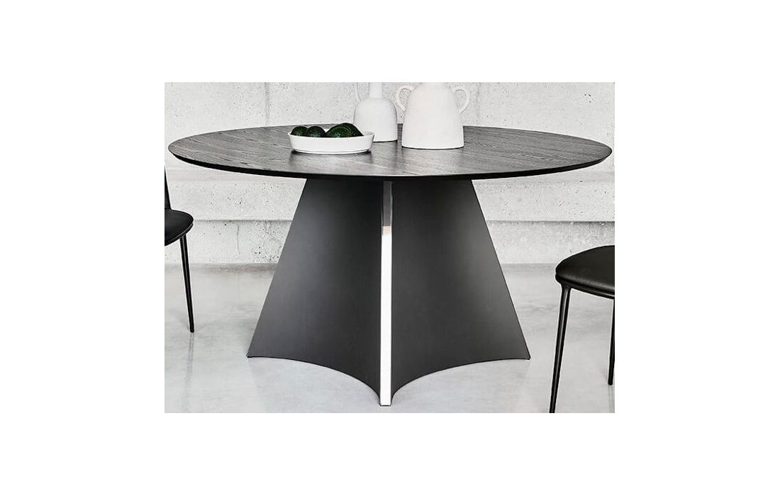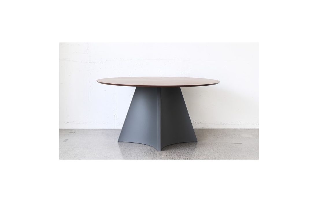 Mesa redonda com tampo em madeira e base em metal, disponível nas várias cores de estrutura e acabamentos.