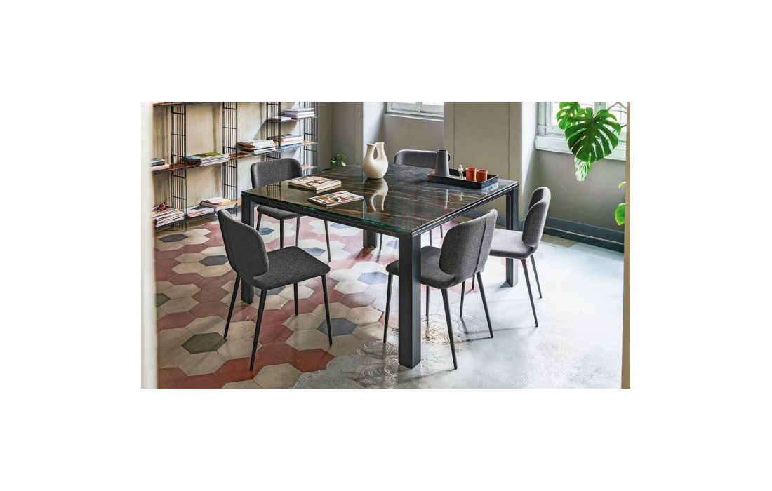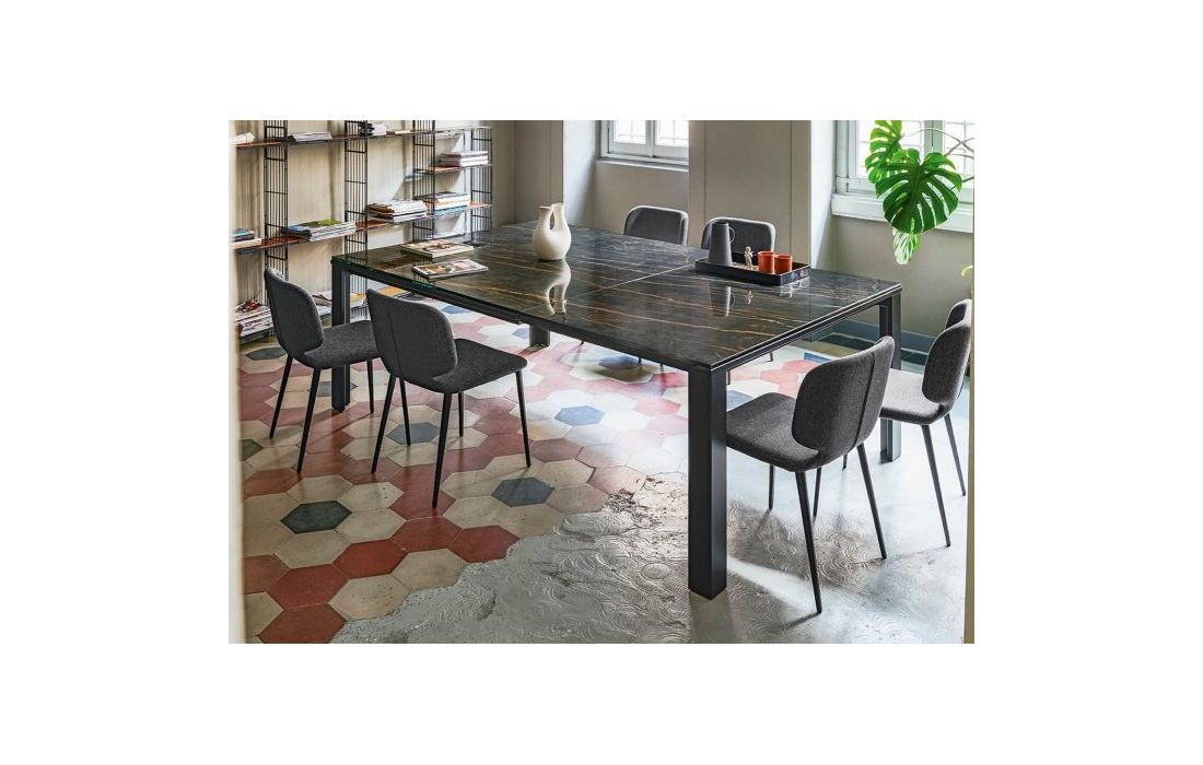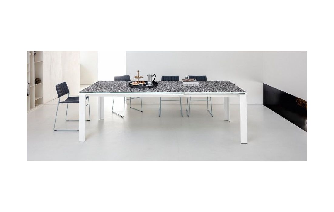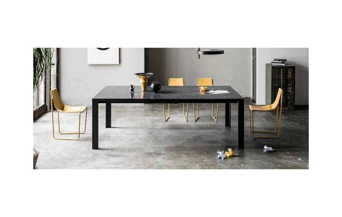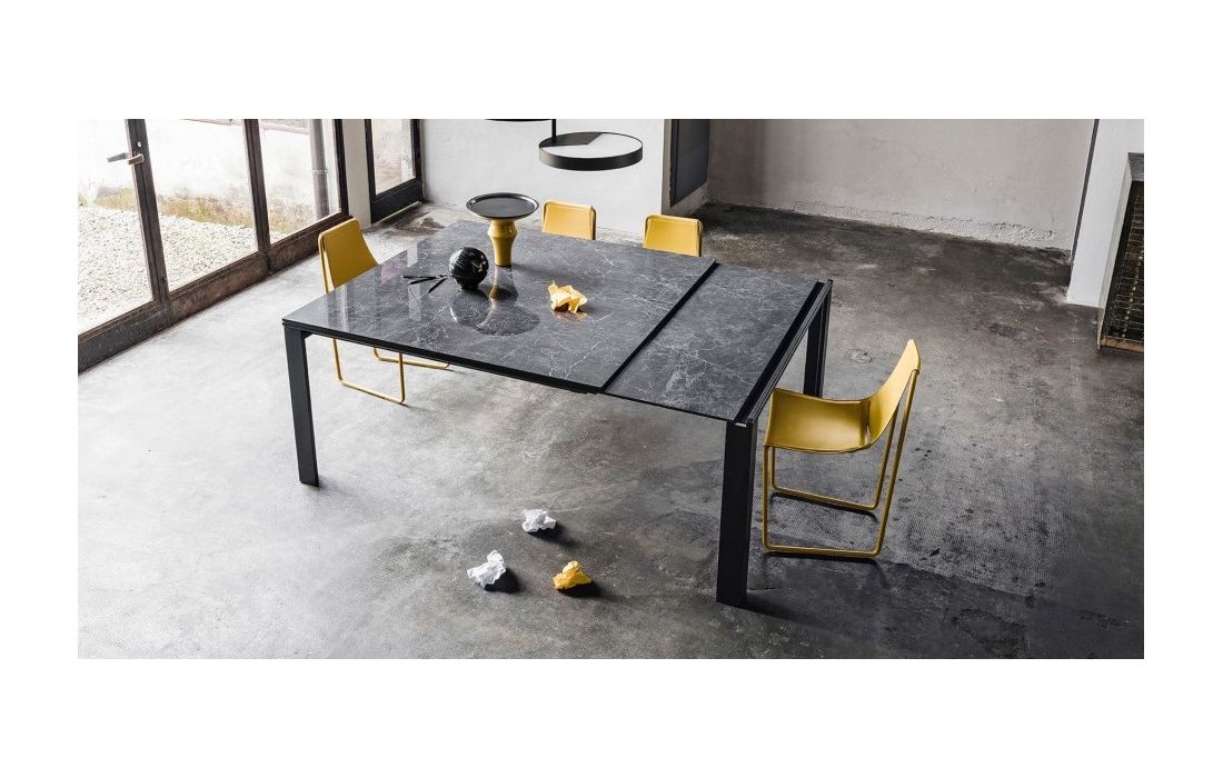 Mesa extensível c/ tampo em cerâmica e estrutura em metal, disponível em três acabamentos com possibilidade de várias cores de estrutura.