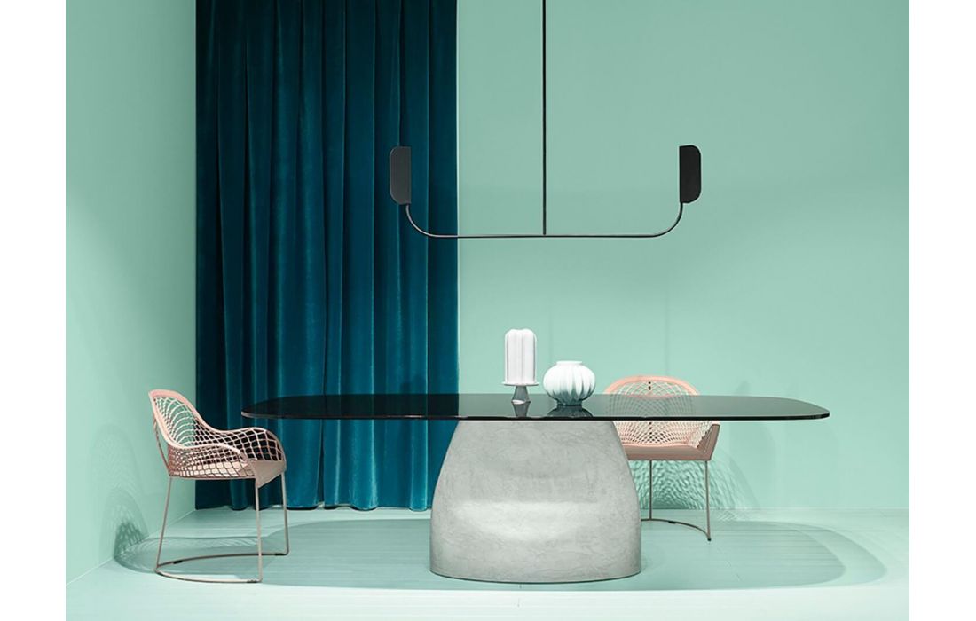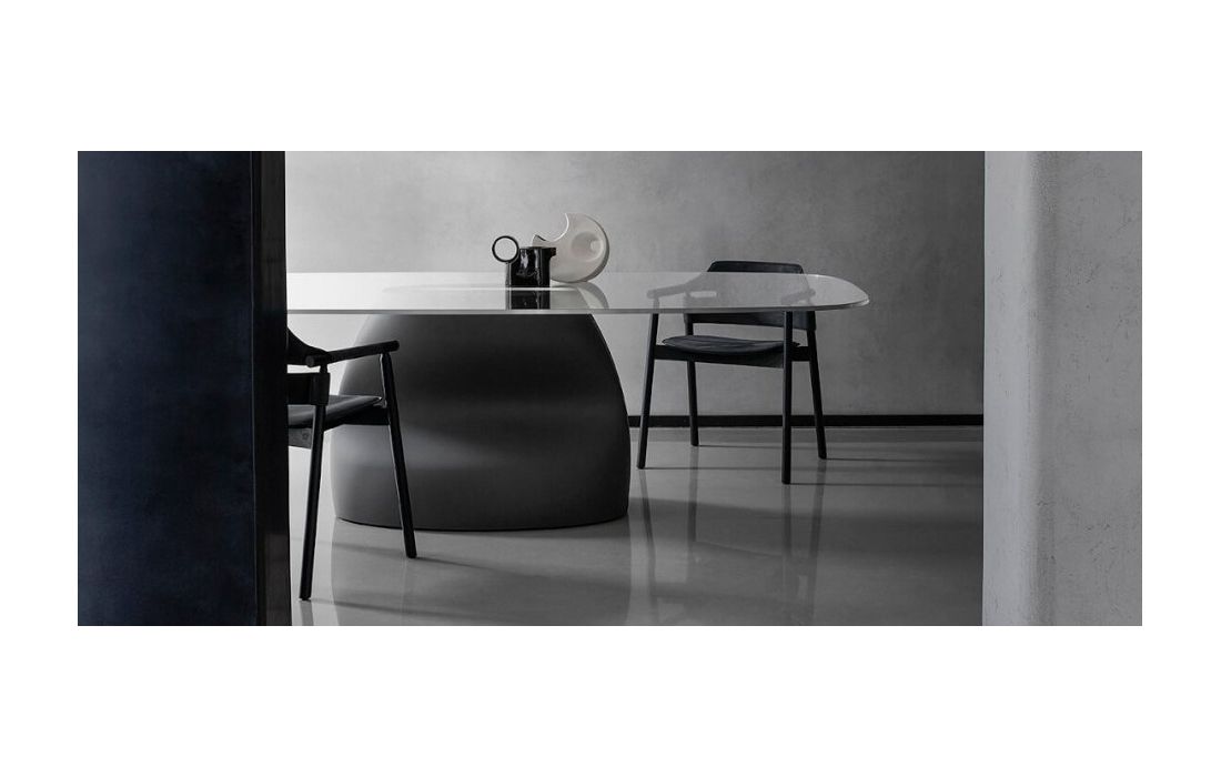 Mesa com tampo em vidro e base em poliuretano Baydur, disponível nas várias cores de estrutura e acabamentos.