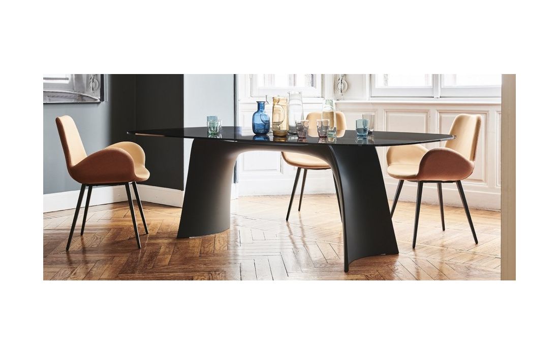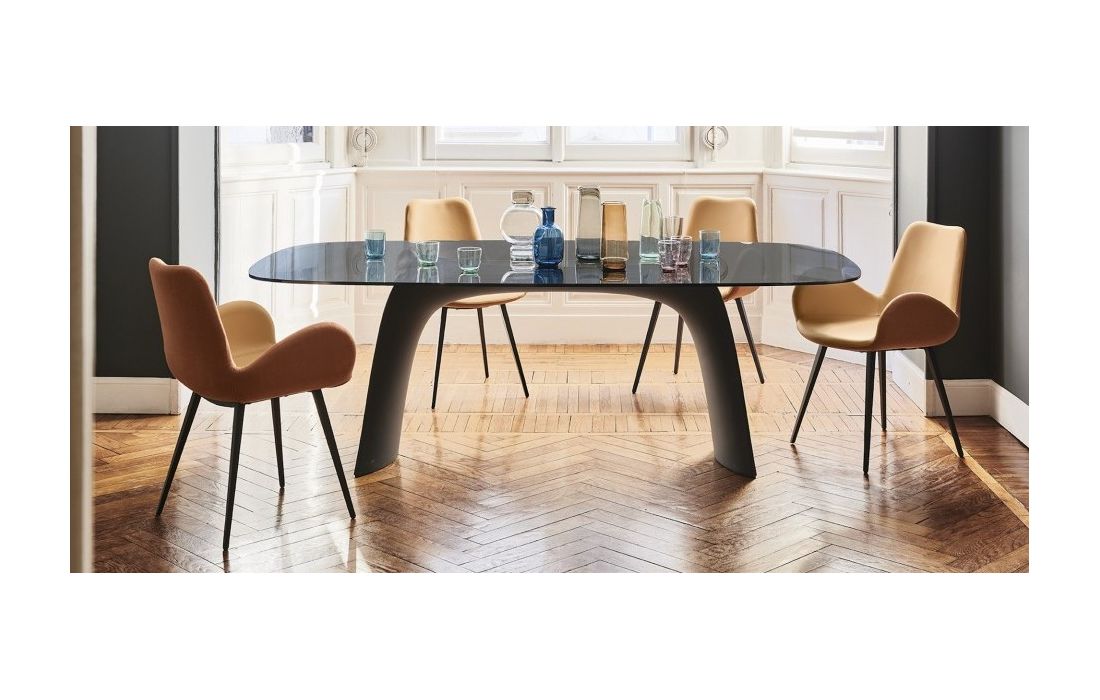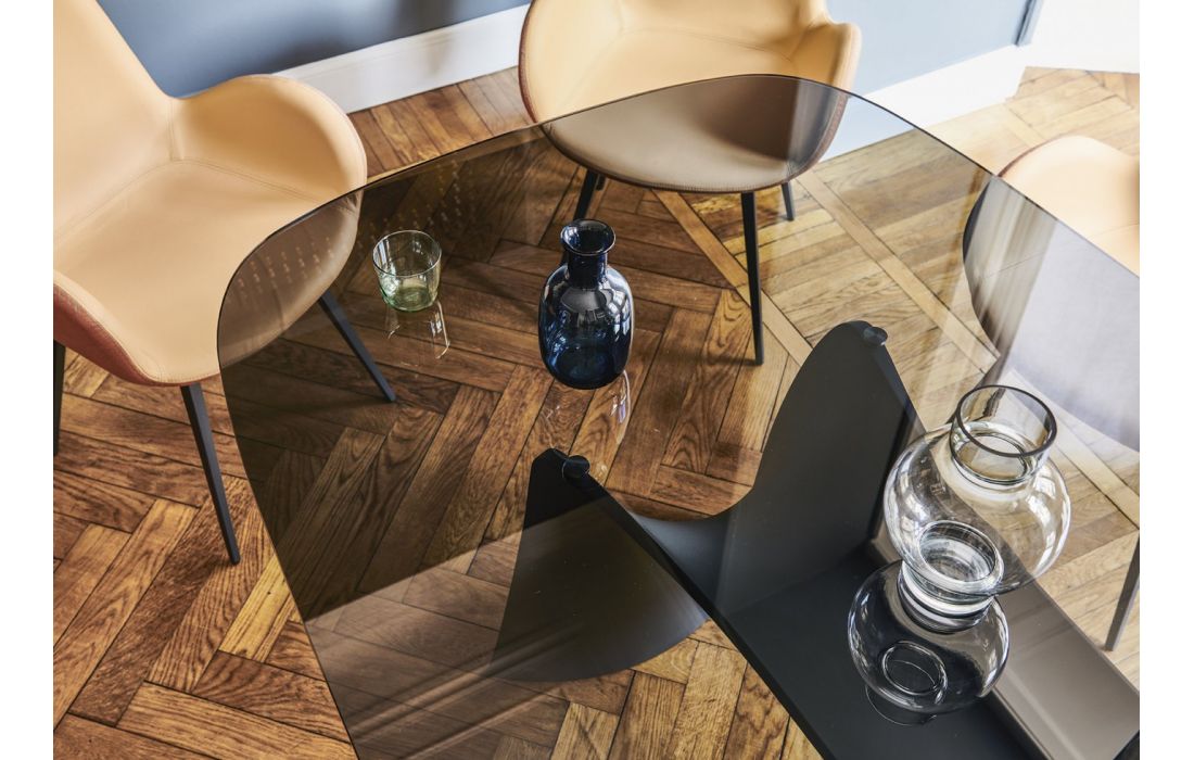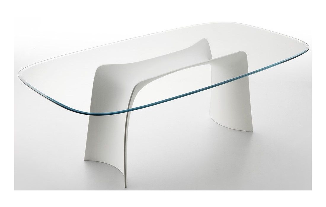 Mesa com tampo em vidro EXTRA CLEAR TRANSPARENT J01 e base em poliuretano Baydur, disponível em duas cores de estrutura.