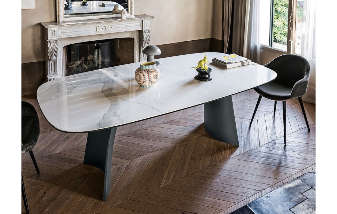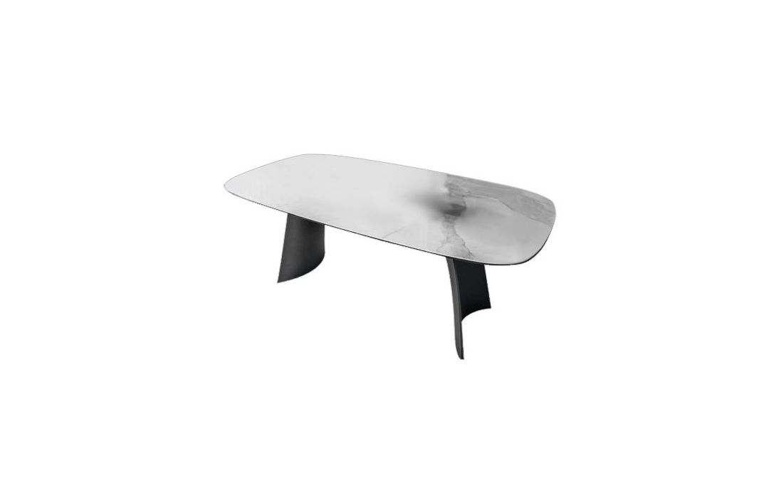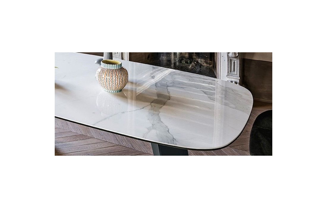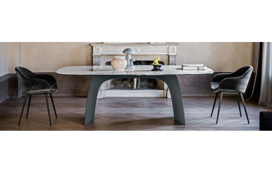 Mesa com tampo em cerâmica e base em poliuretano Baydur, disponível nas várias cores de estrutura e acabamentos.