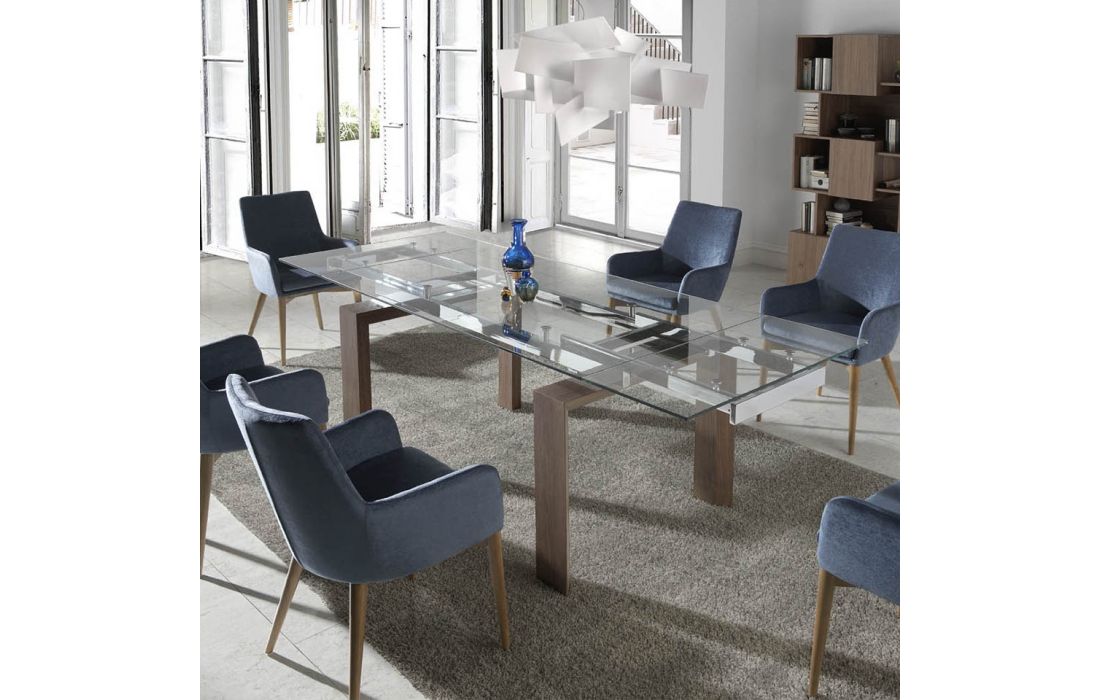 Mesa de jantar extensível com tampo de vidro temperado e base em folha de madeira de nogueiraDestinatário :