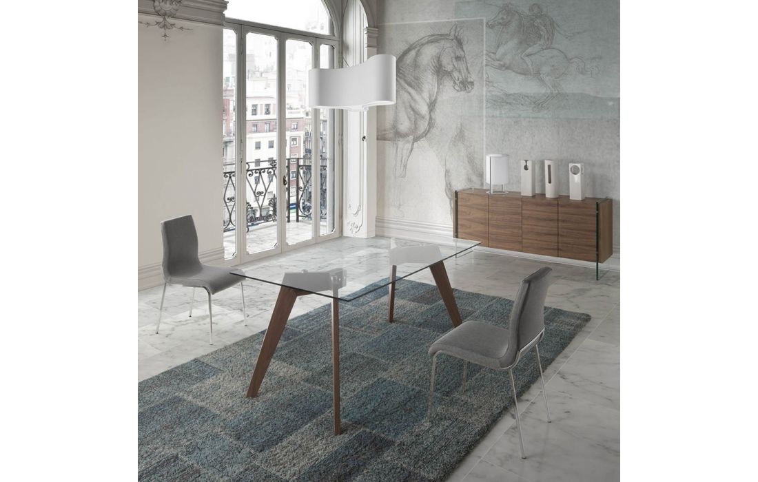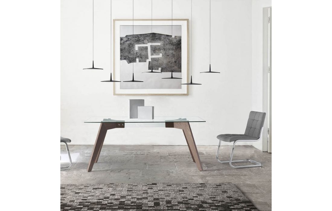 Mesa de jantar com tampo de vidro e base em folha de madeira de nogueiraDestinatário :