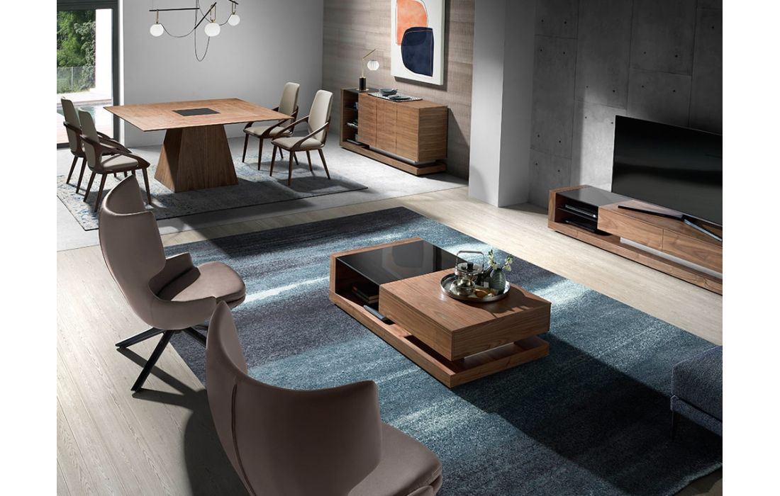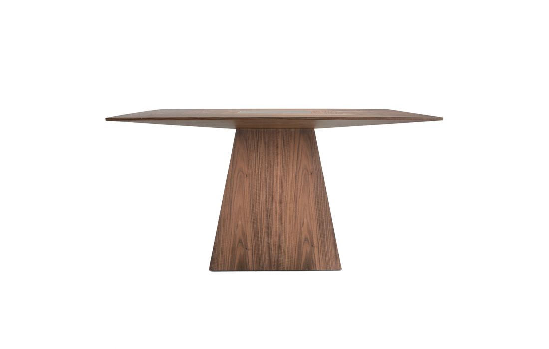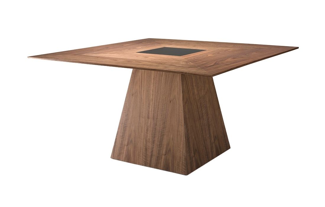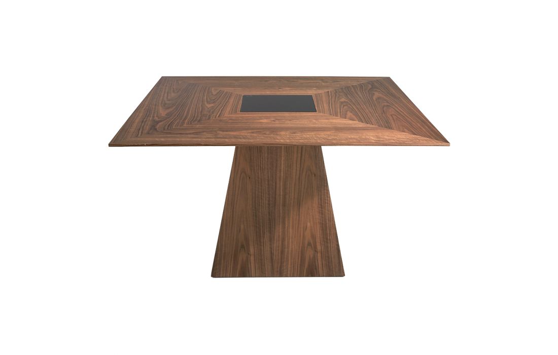 Mesa de jantar quadrada em madeira folheada a nogueira natural e detalhe central em vidro escurecidoDestinatário :