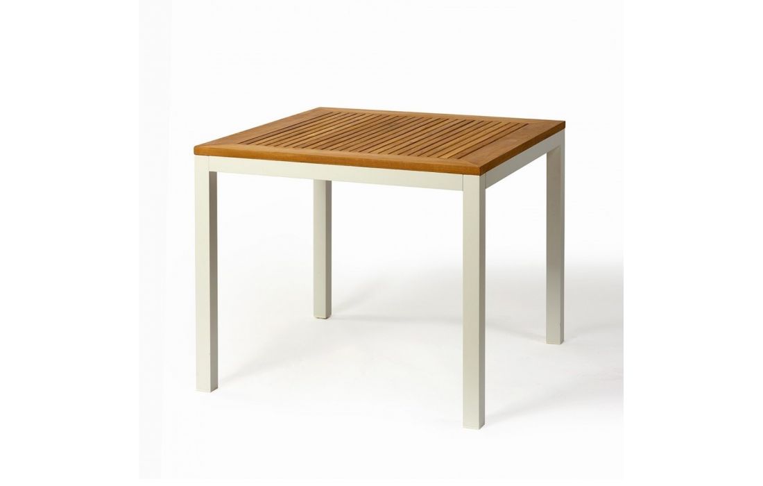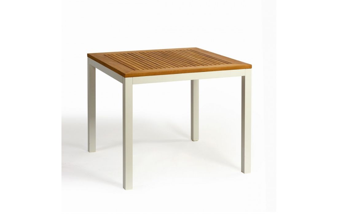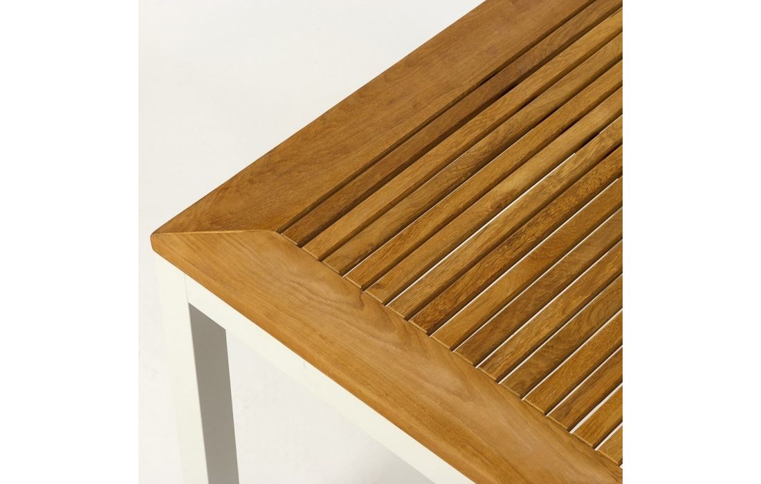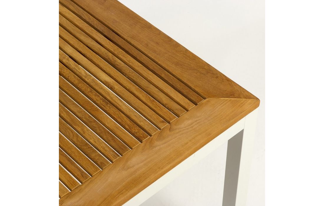 Mesa de alumínio com tampo de madeira teca.