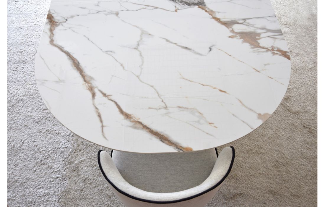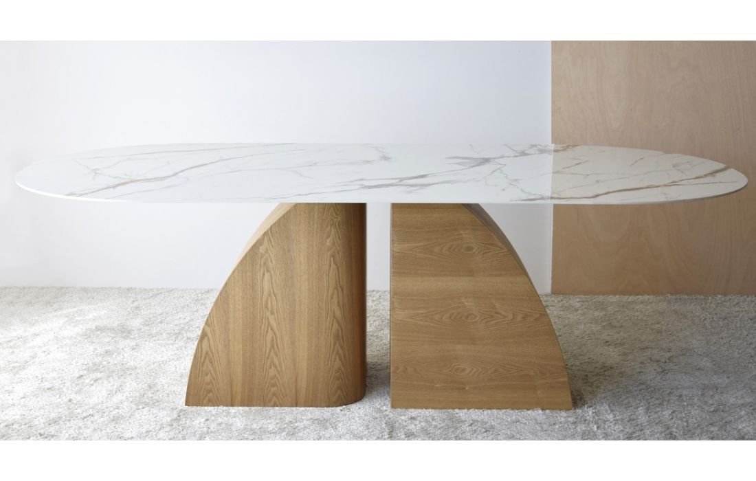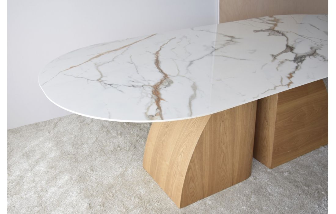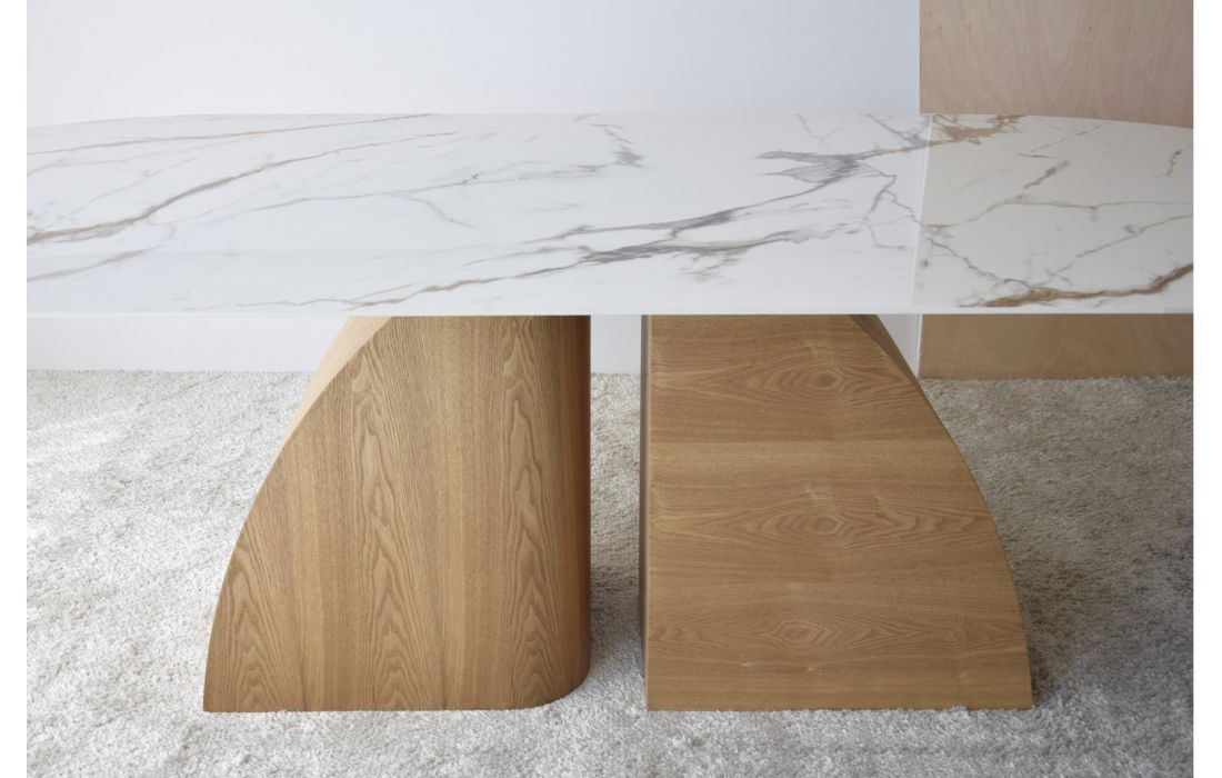 Mesa de jantar com tampo em pedra sinterizada de 12mm de espessura com acabamento em mármore branco veiado em tons de cinza e laranja ocre. A base é formanda por duas peças de design feita em MDF folheado em freixo natural.