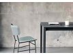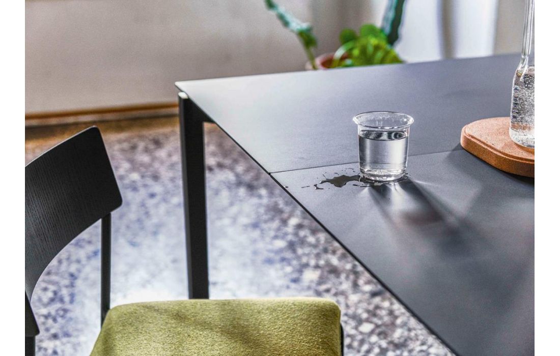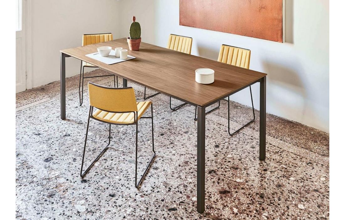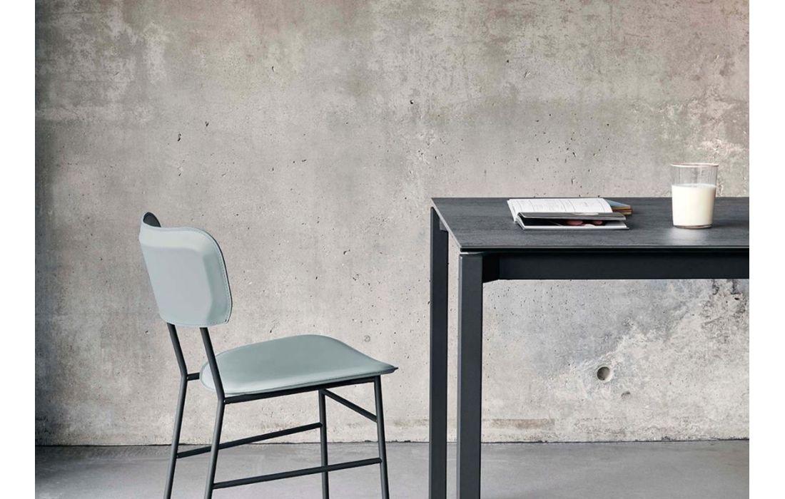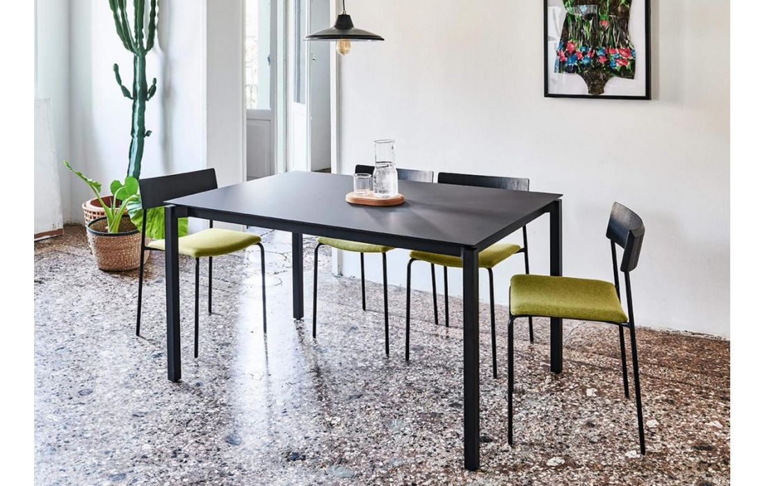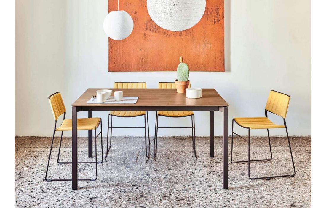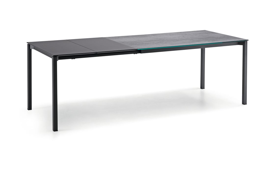 Mesa de jantar extensível com base de quatro pés em metal e tampo em vidro ou cerâmica.