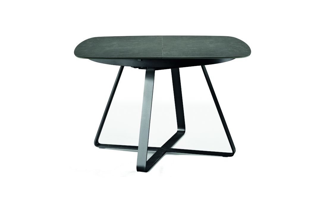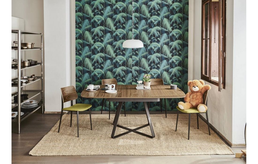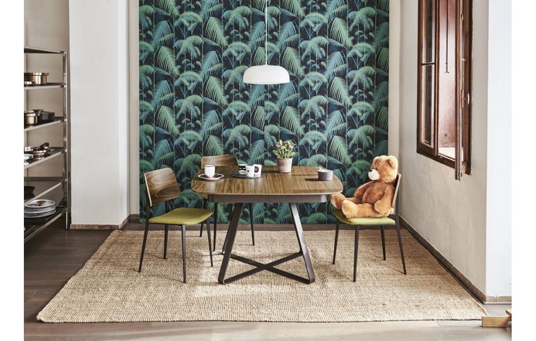 Mesa de jantar extensível com base metálica. Tampo em madeira ou cerâmica