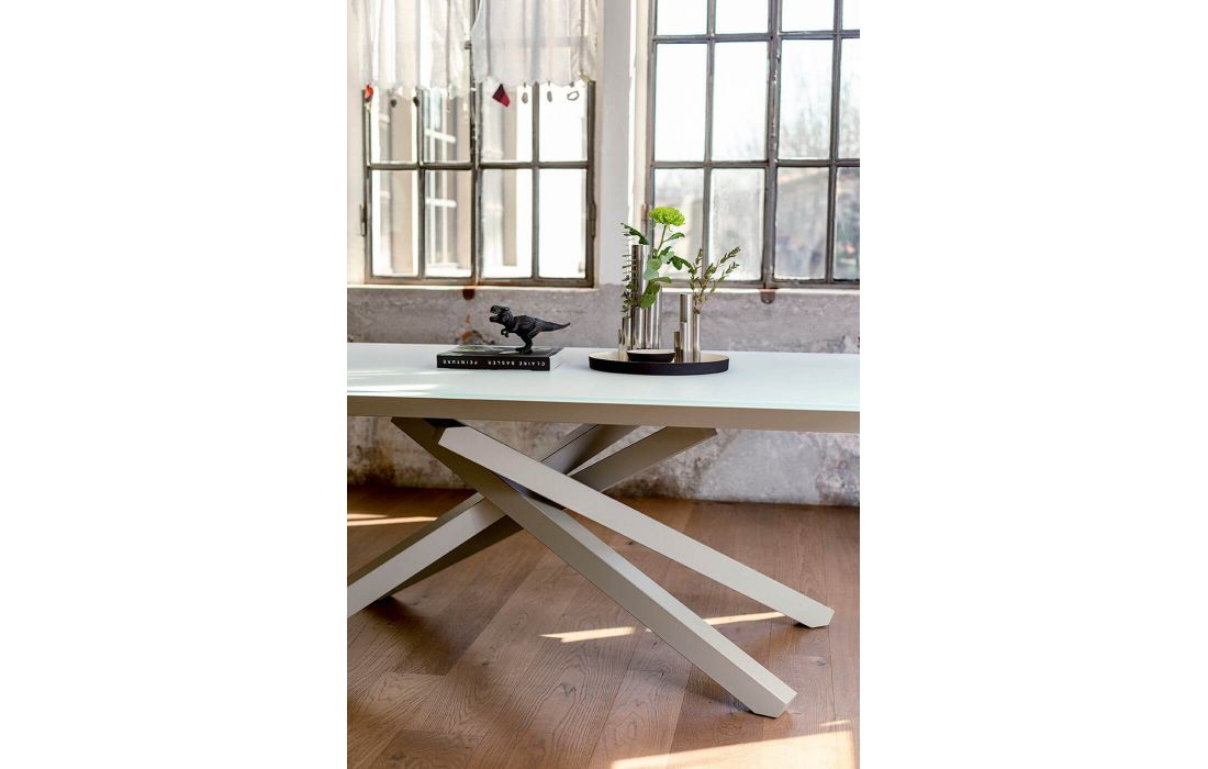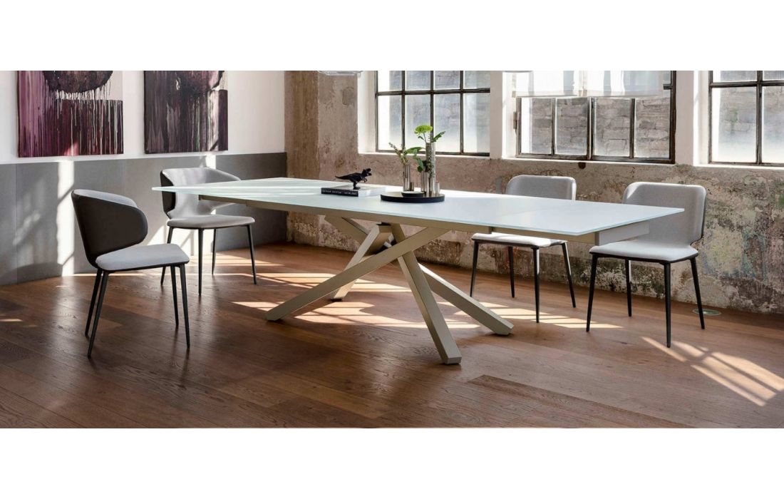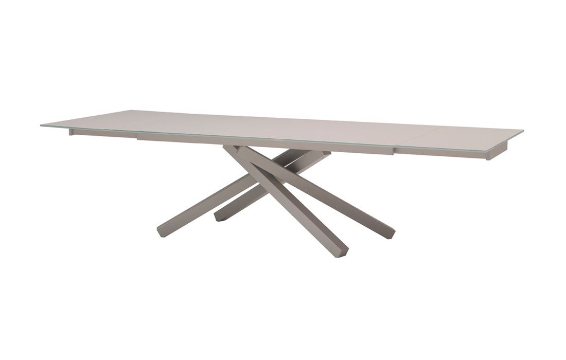 Mesa de jantar extensível, base metálica lacada e tampo em vidro
