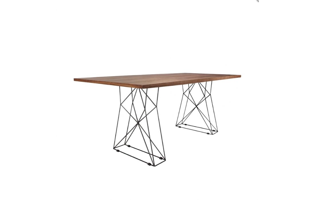 Mesa de jantar retangular com tampo fixo em madeira folheada a nogueira natural. Estrutura das pernas em aço inoxidável epóxi preto.