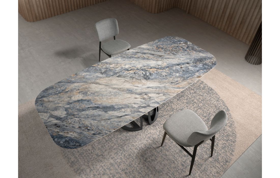 Mesa de jantar oval com tampo fixo em mármore com acabamento brilhante e pés em aço inoxidávelDimensões em cm