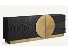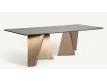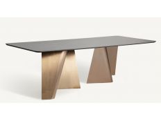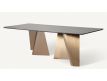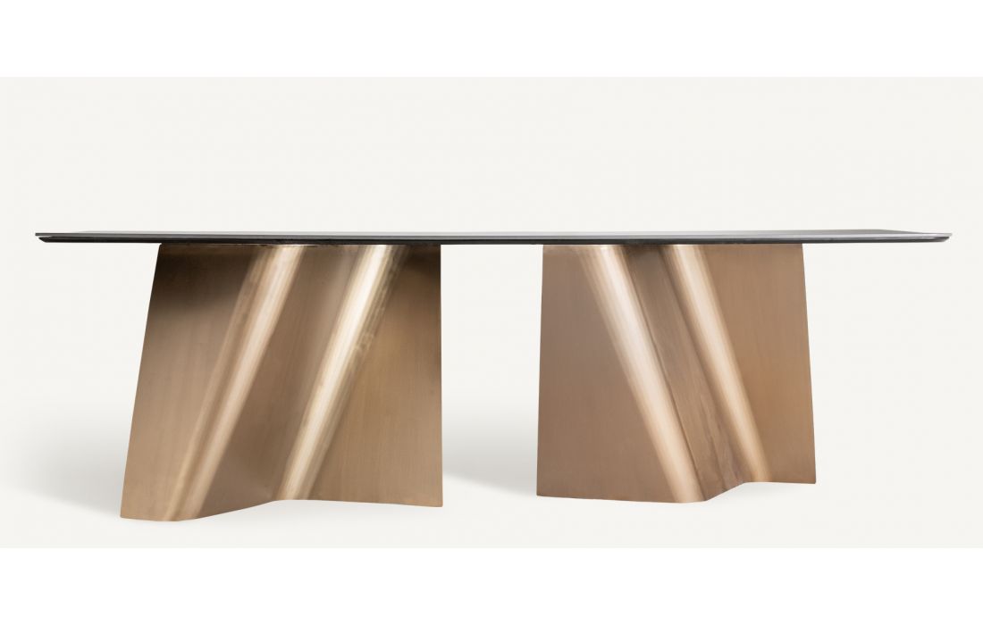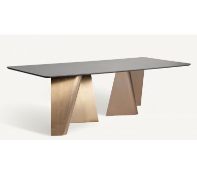 Mesa de jantar com estrutura de aço dourado e tampo em porcelana cor preta