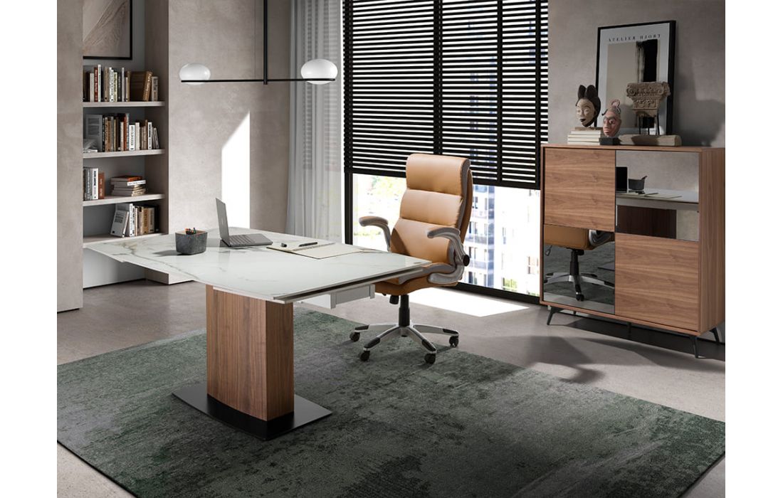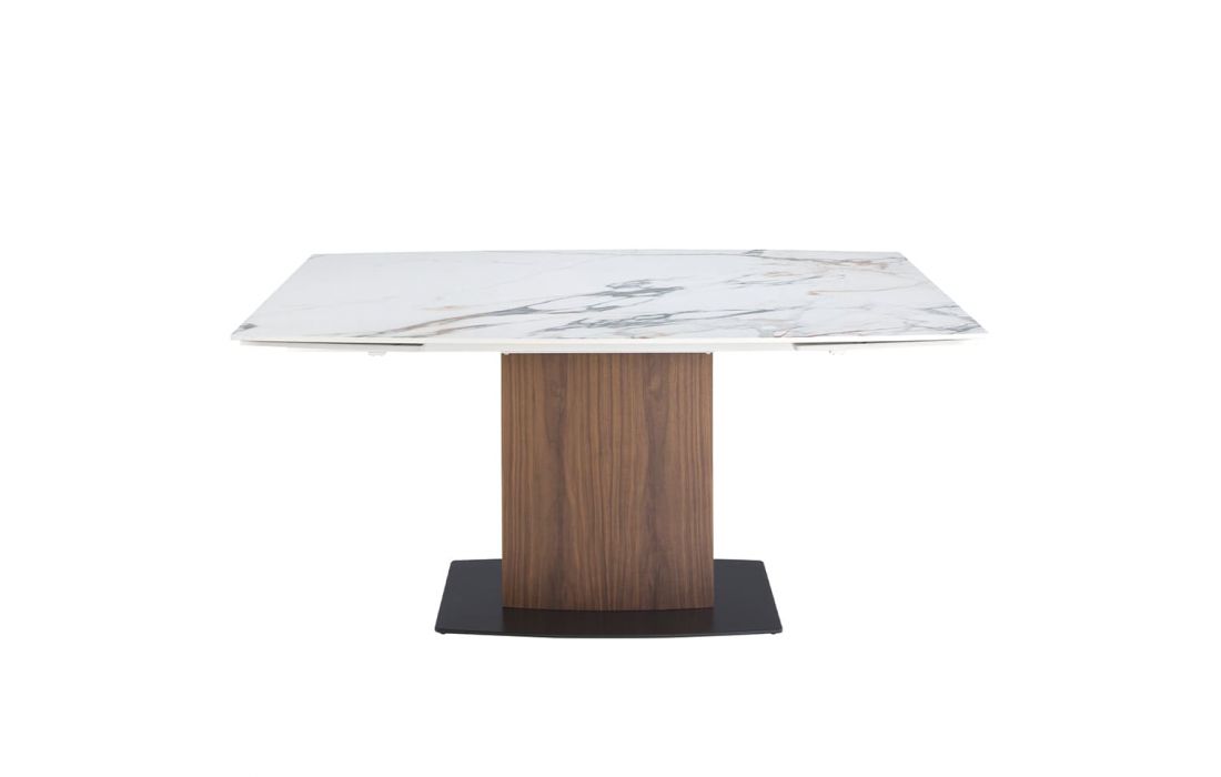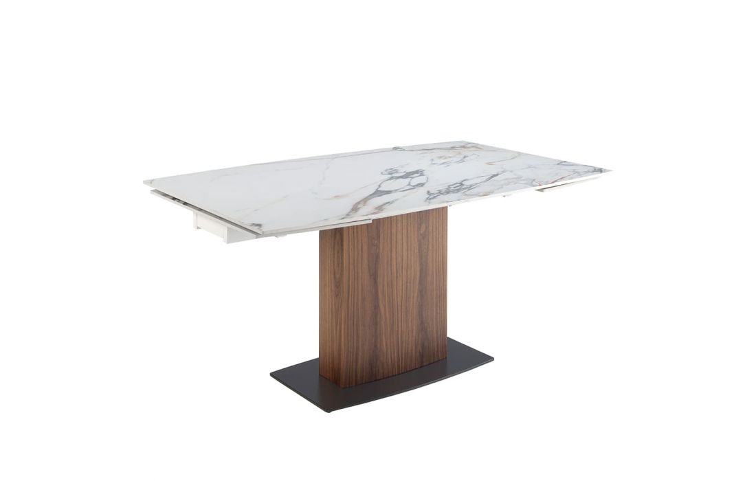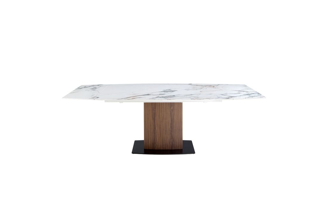 Mesa de jantar extensível oval com tampo em mármore com acabamento brilhante e pés em madeira folheada a nogueira juntamente com a sua base em aço inoxidávelDestinatário :