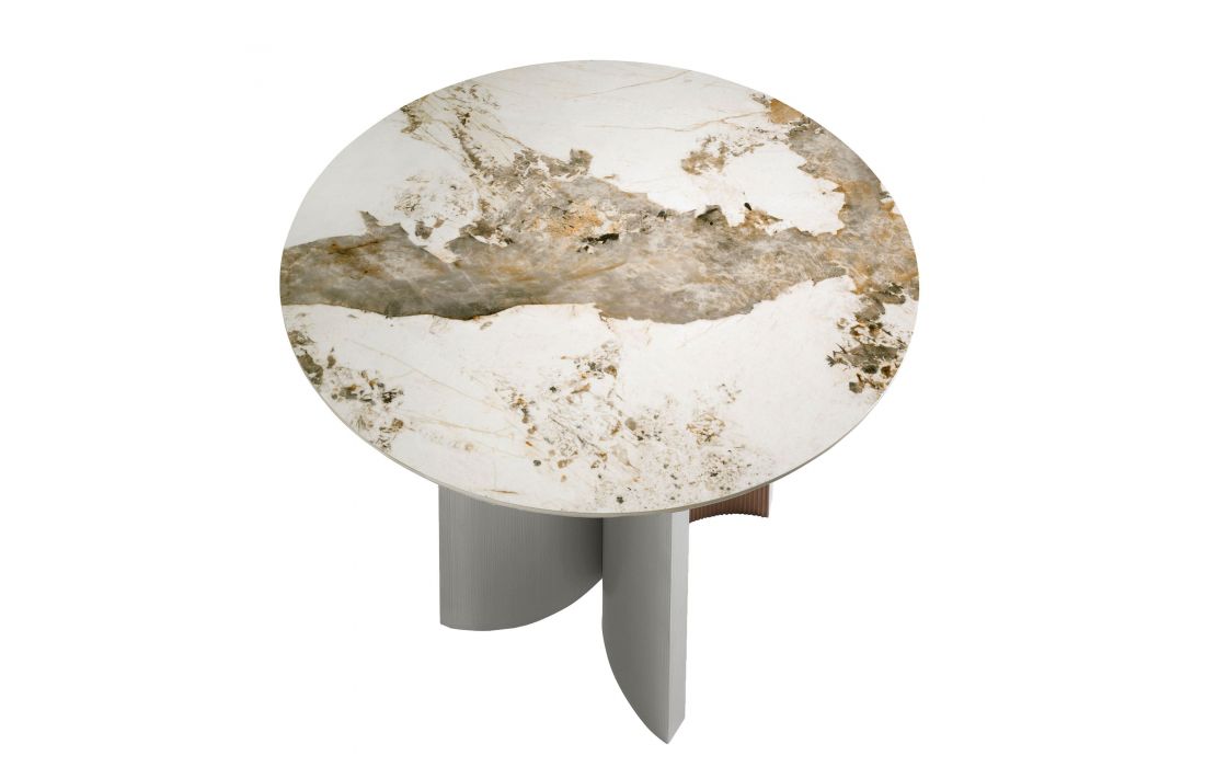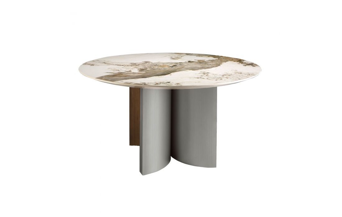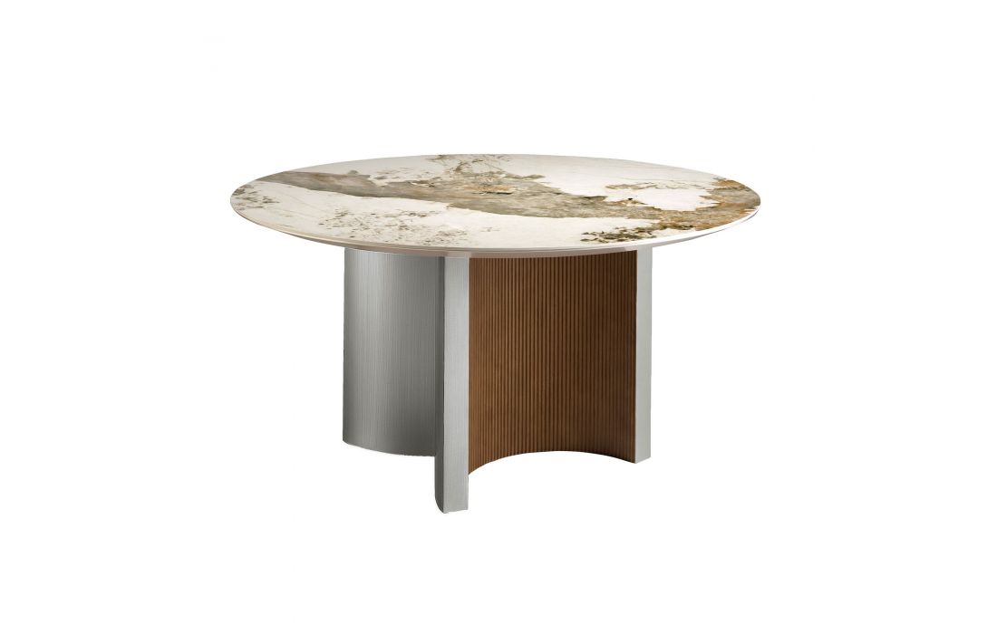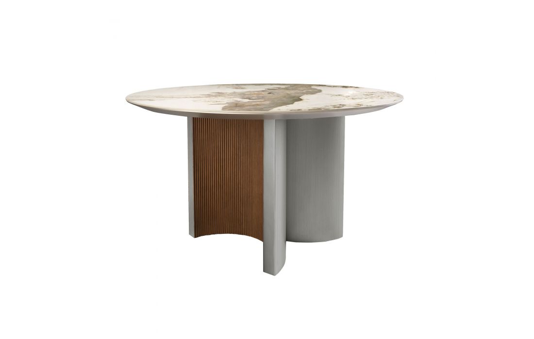 Mesa de jantar redonda com tampo fixo em mármore com acabamento brilhante, pés em madeira cor de nogueira e a madeira MDF lacada prateadaDestinatário :