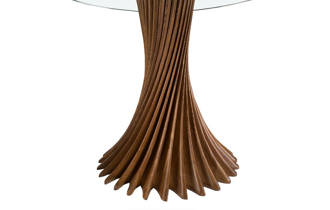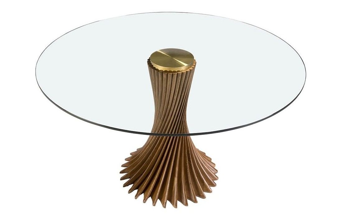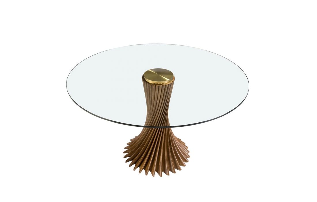 Mesa de jantar redonda com tampo fixo de vidro temperado, pés em madeira cor de nogueira