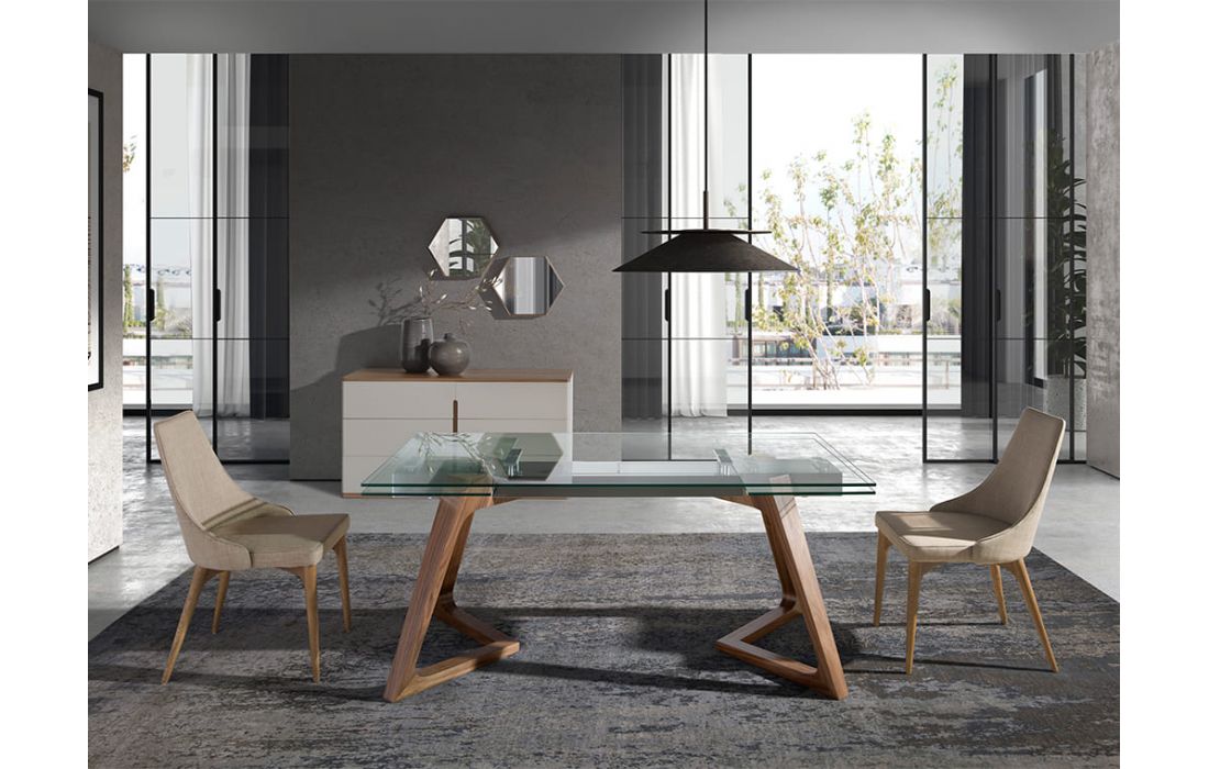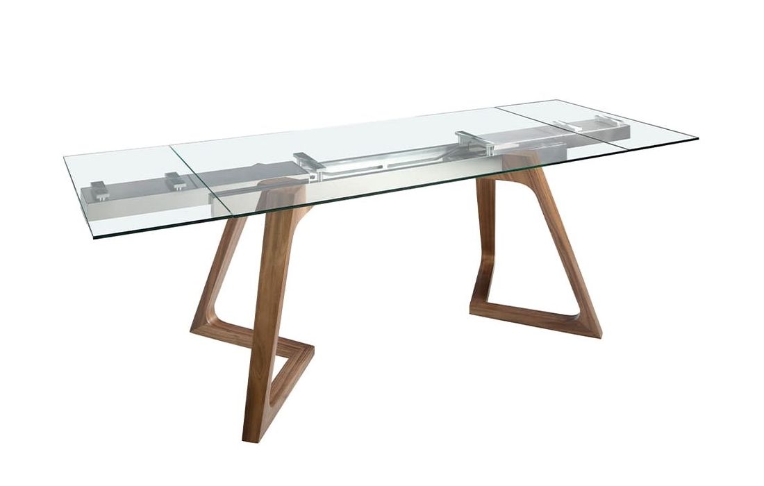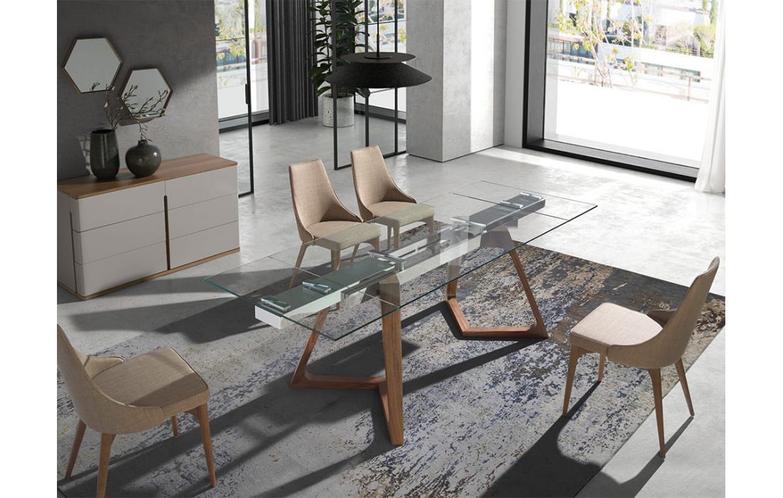 Mesa de jantar extensível retangular com tampo de vidro temperado e pés em madeira folheada a nogueira naturalDestinatário :