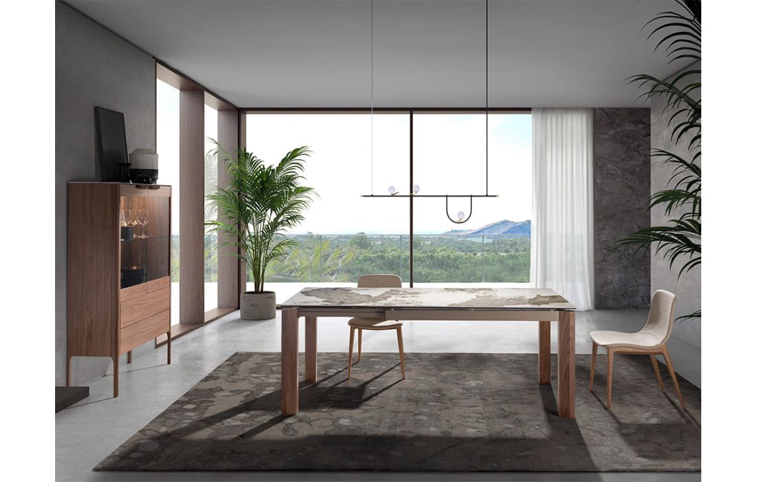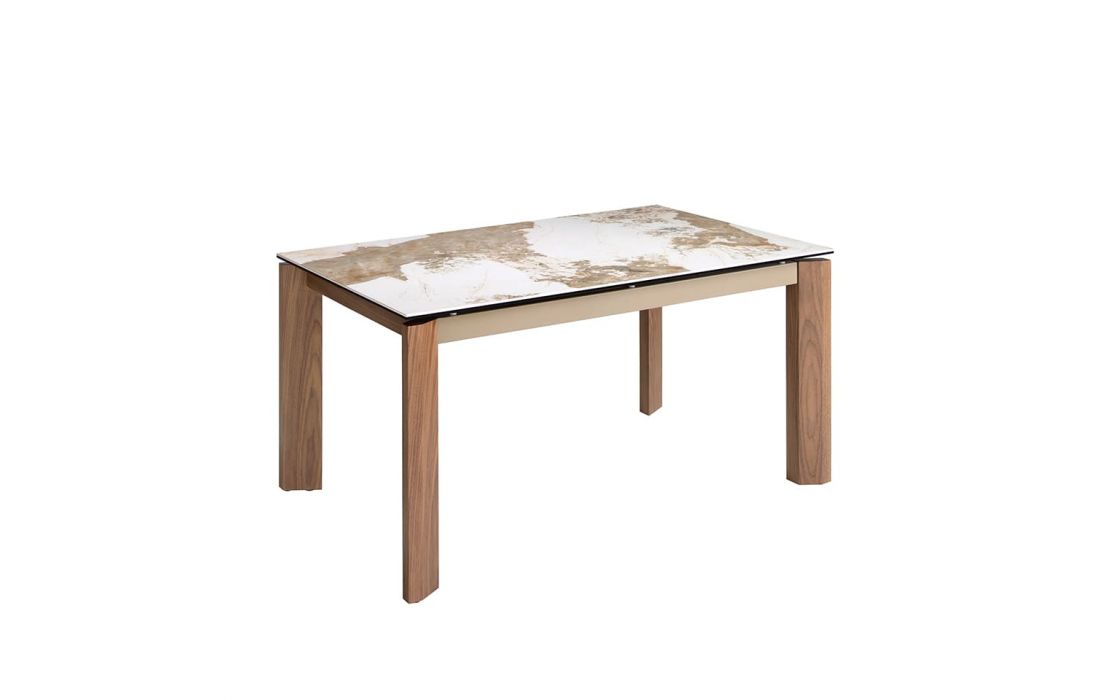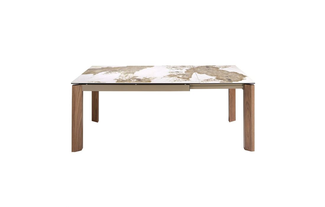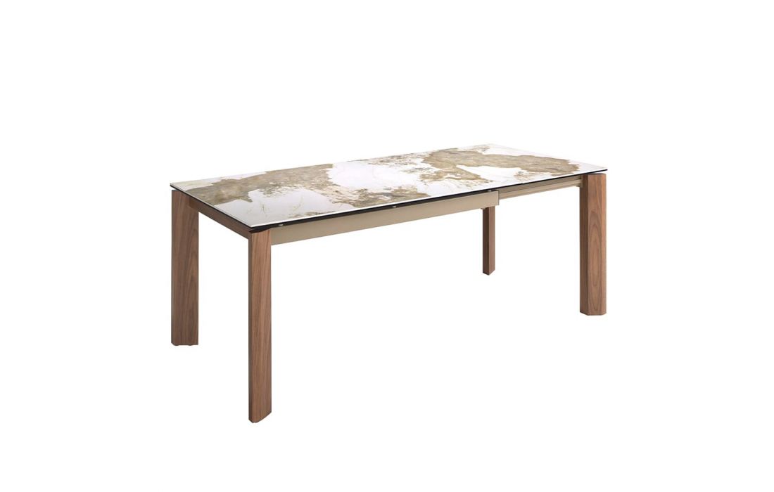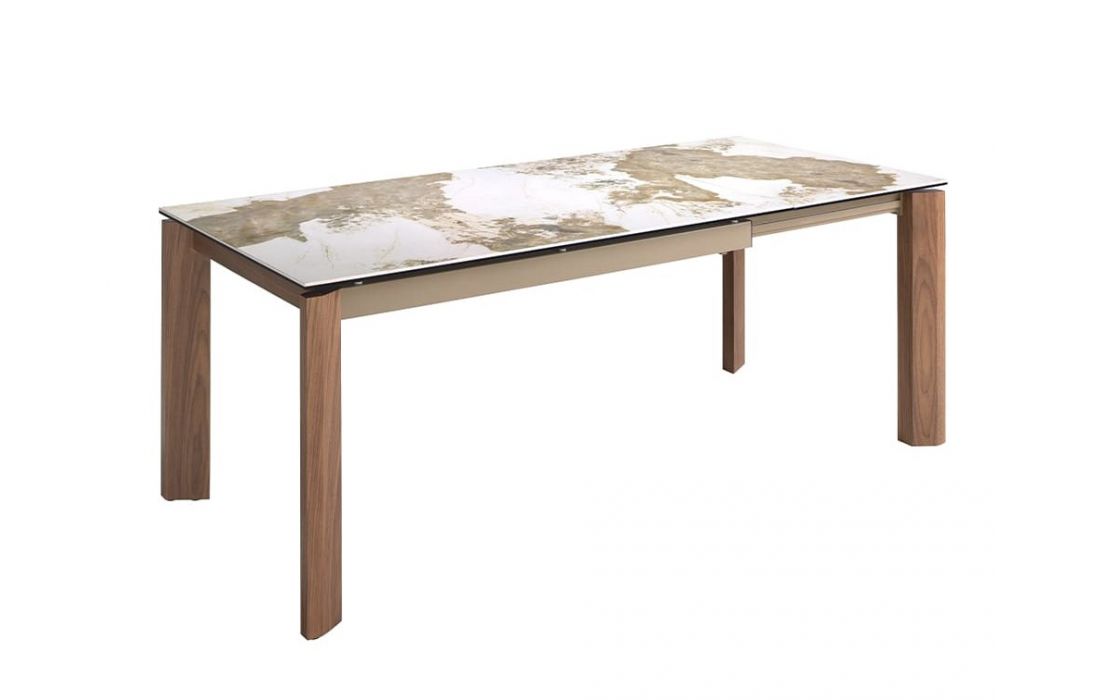 Mesa de jantar extensível retangular com tampo em mármore com acabamento brilhante e pés em madeira folheada a nogueiraDestinatário :