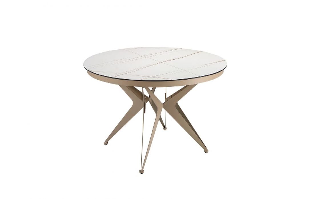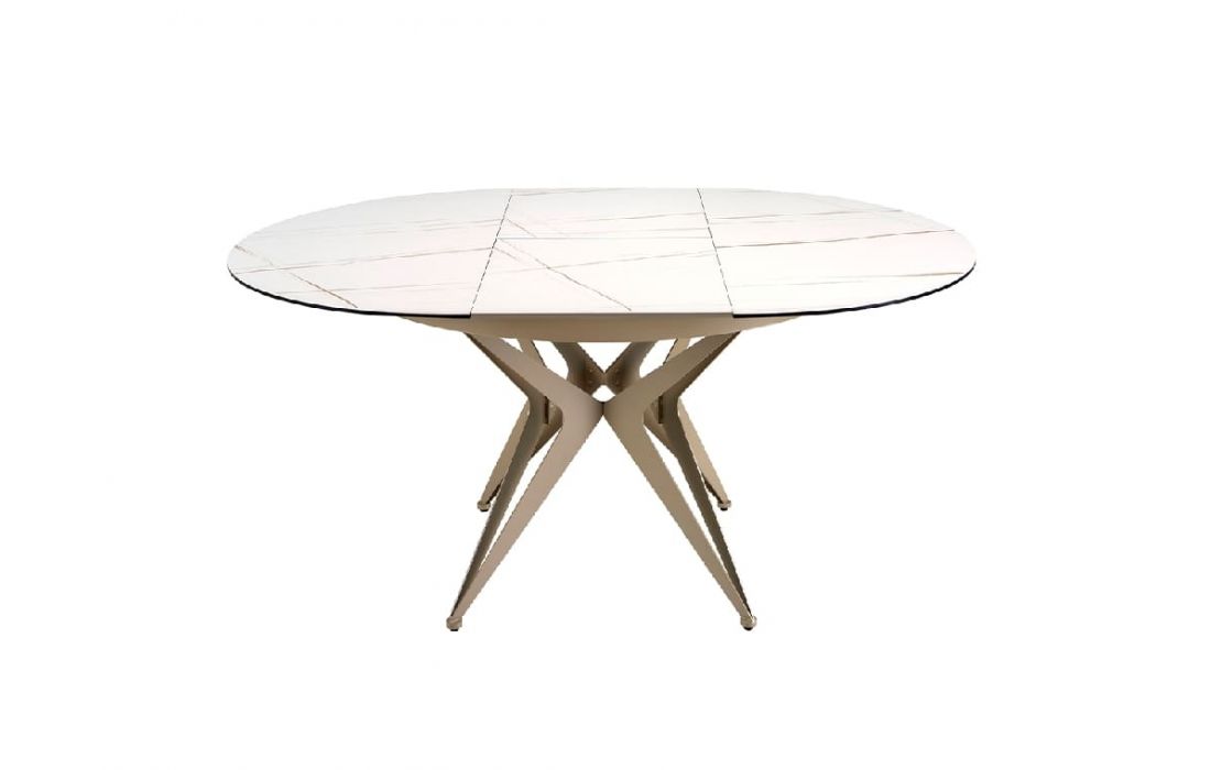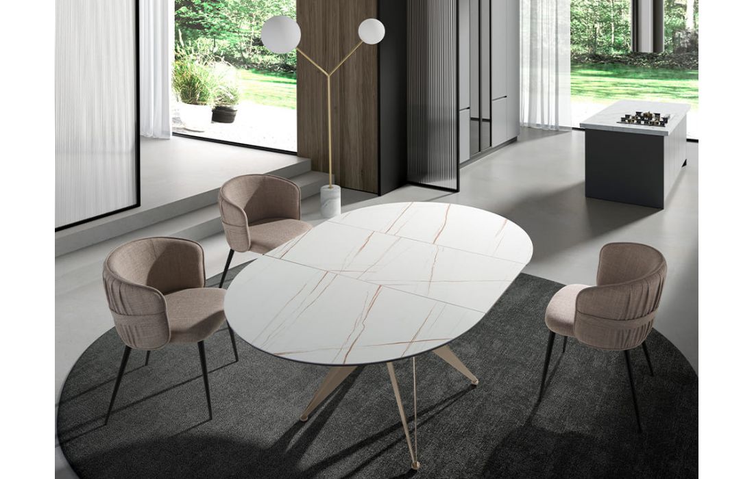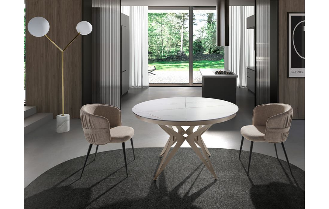 Mesa de jantar extensível redonda com tampo em mármore mate e pés em aço inoxidávelDestinatário :