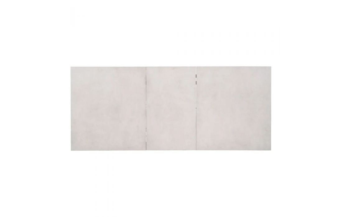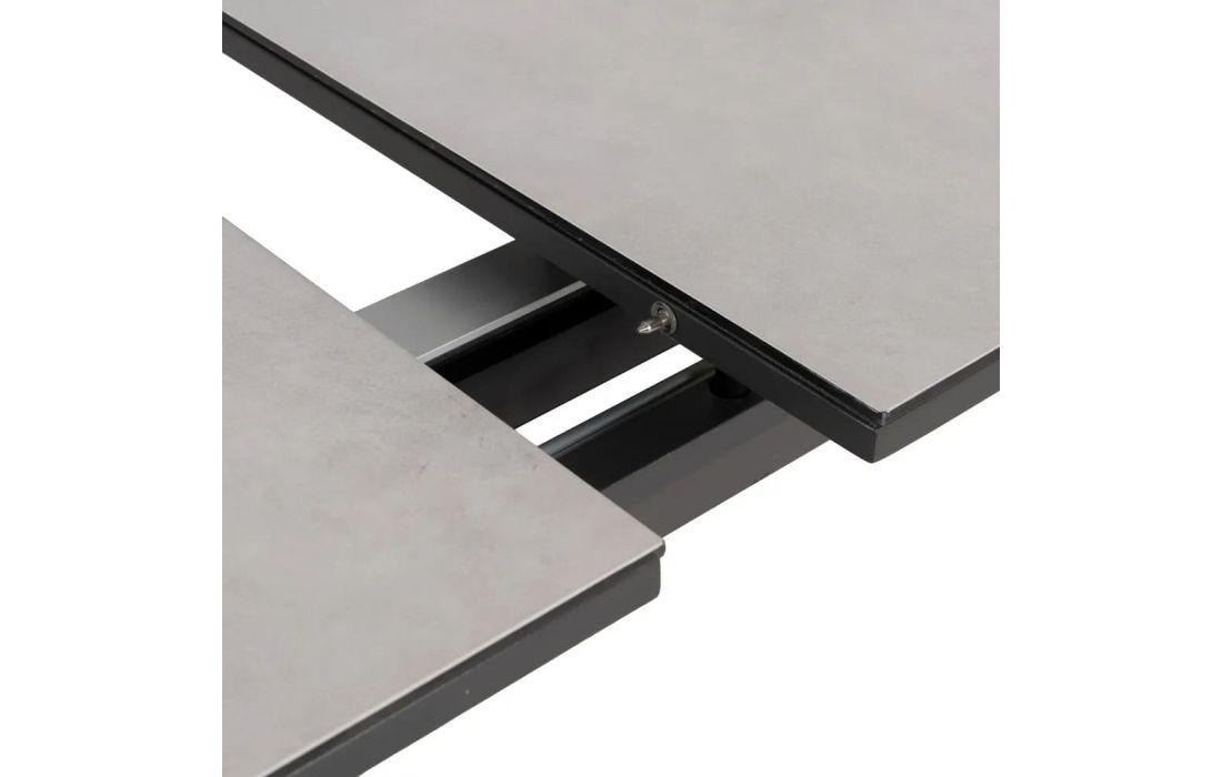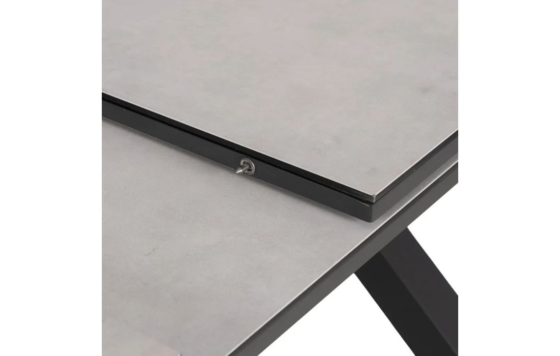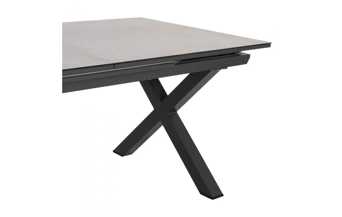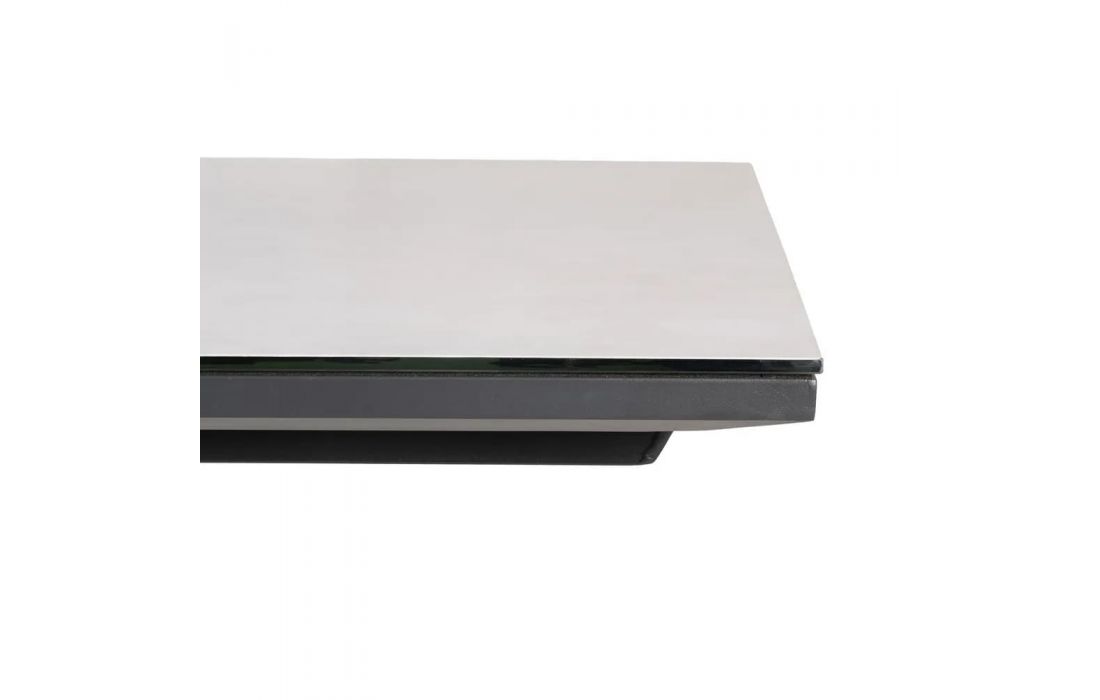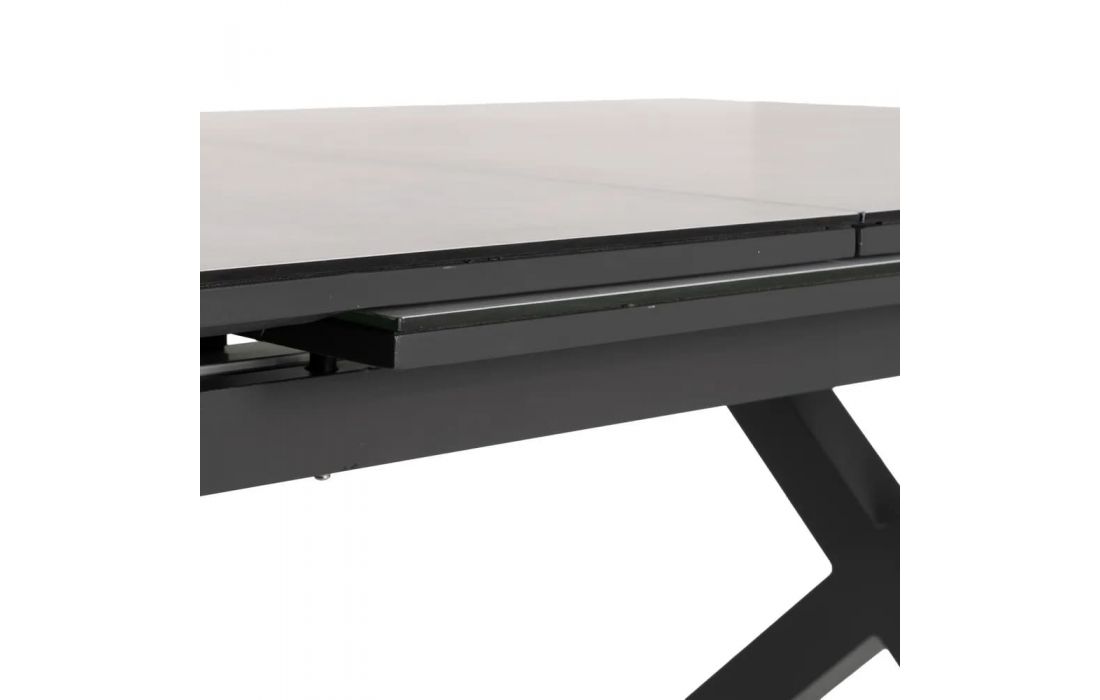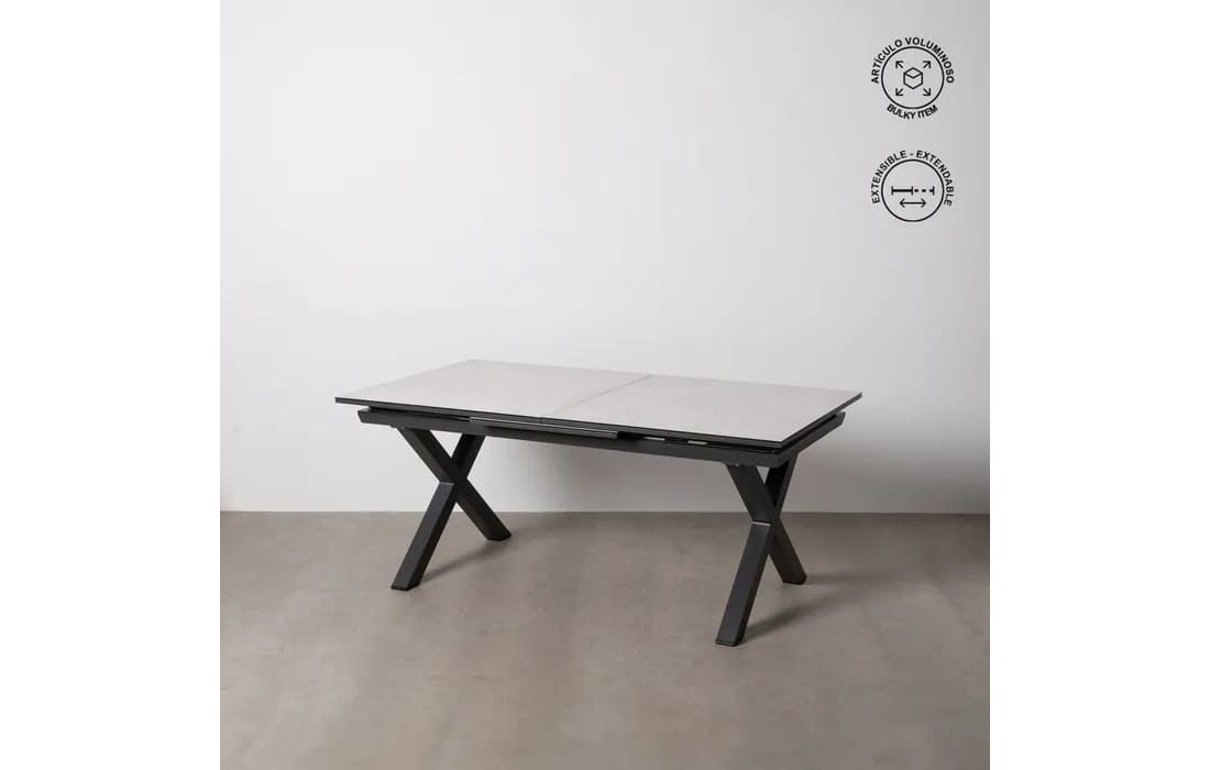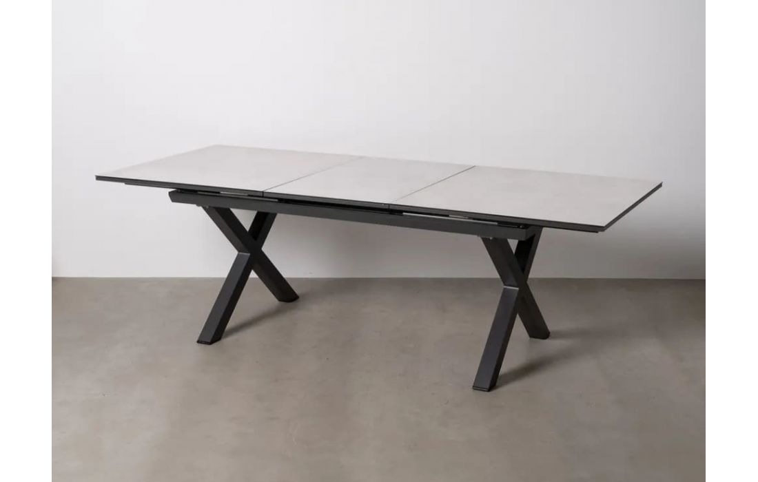 Mesa de jantar com estrutura em vidro, cerâmica e alúminio.