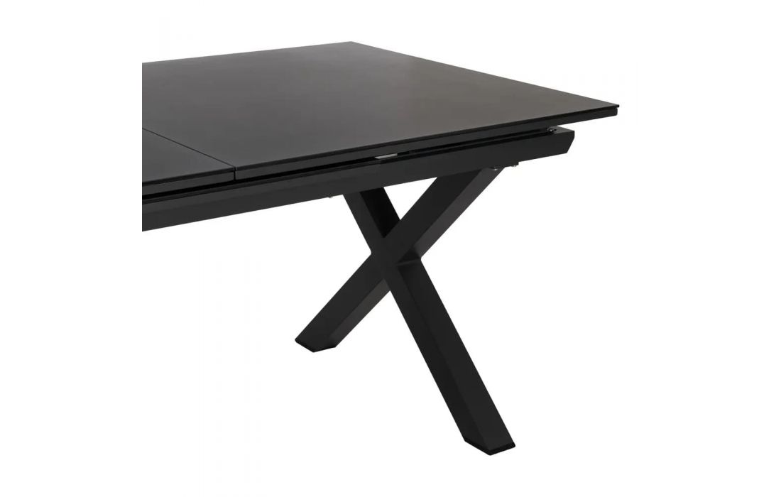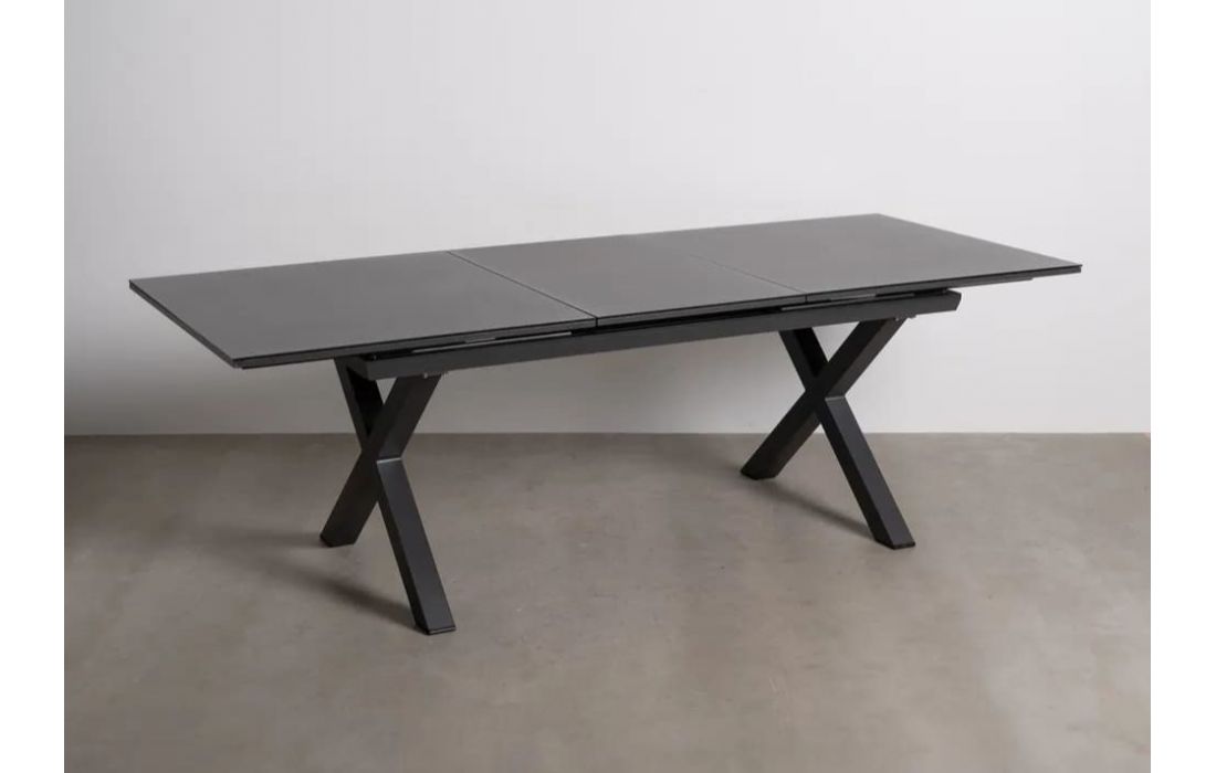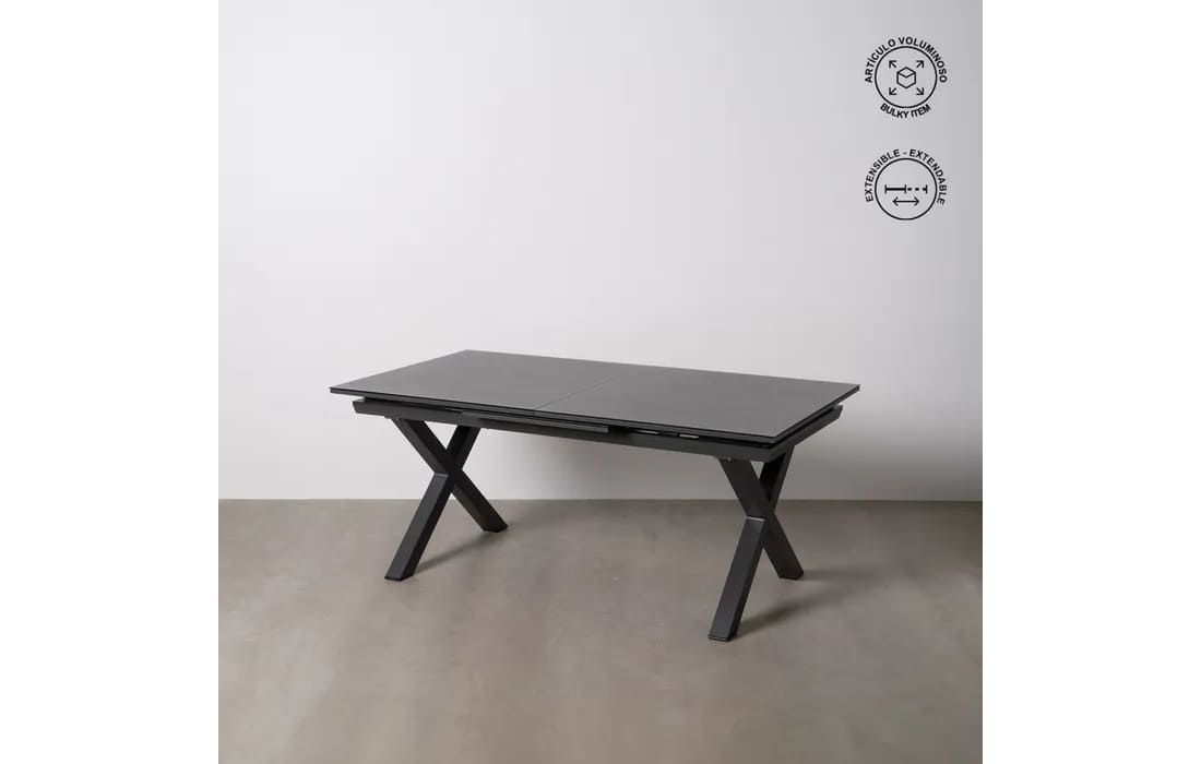 Mesa de jantar com estrutura em vidro, cerâmica e alúminio.