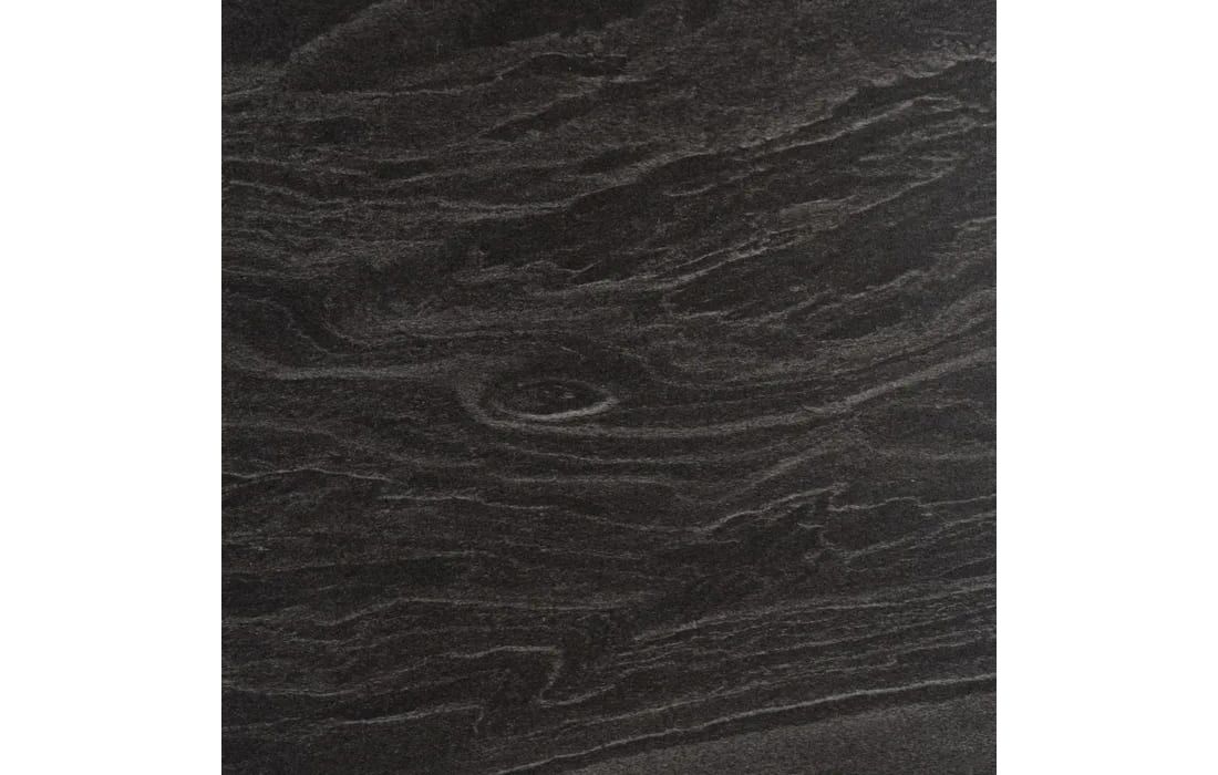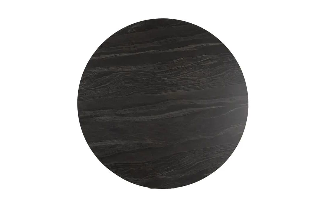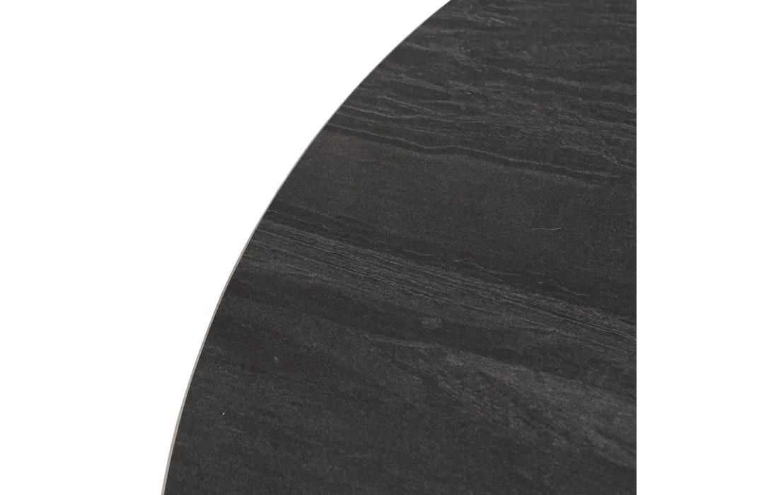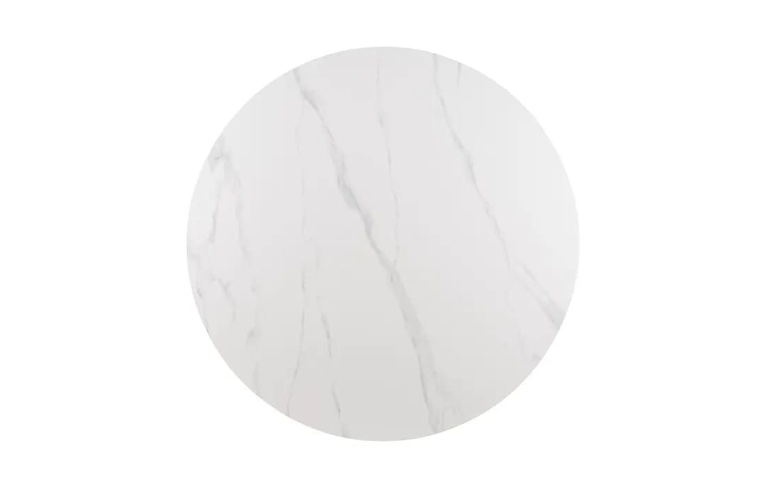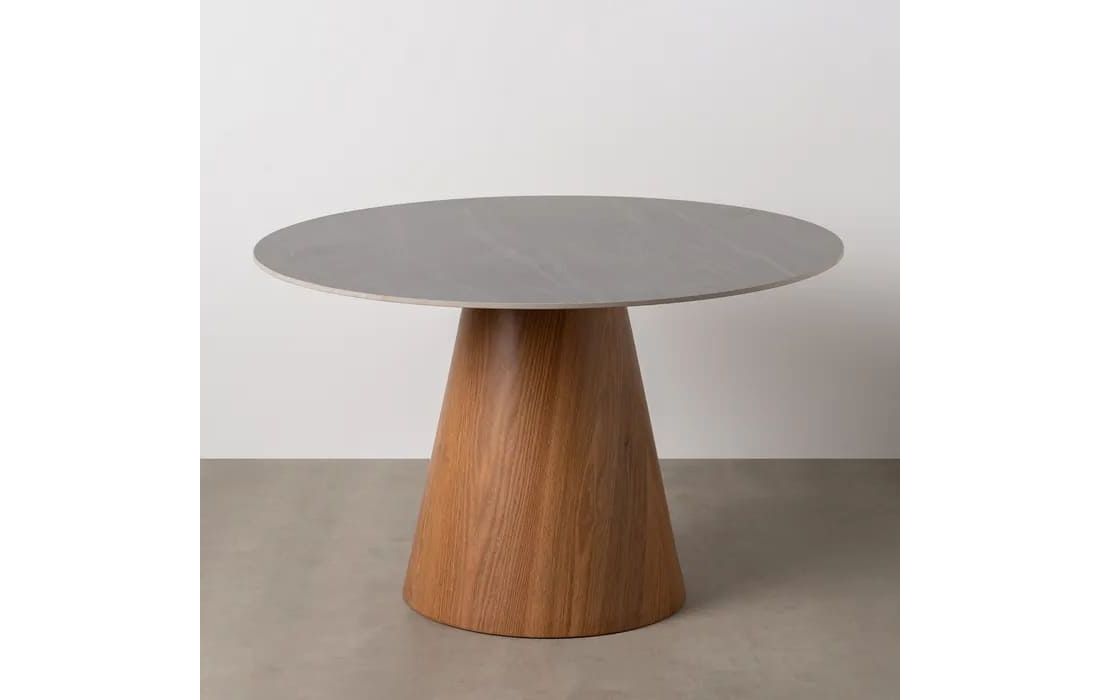 Mesa de jantar com estrutura em metal e tampo em mármore.