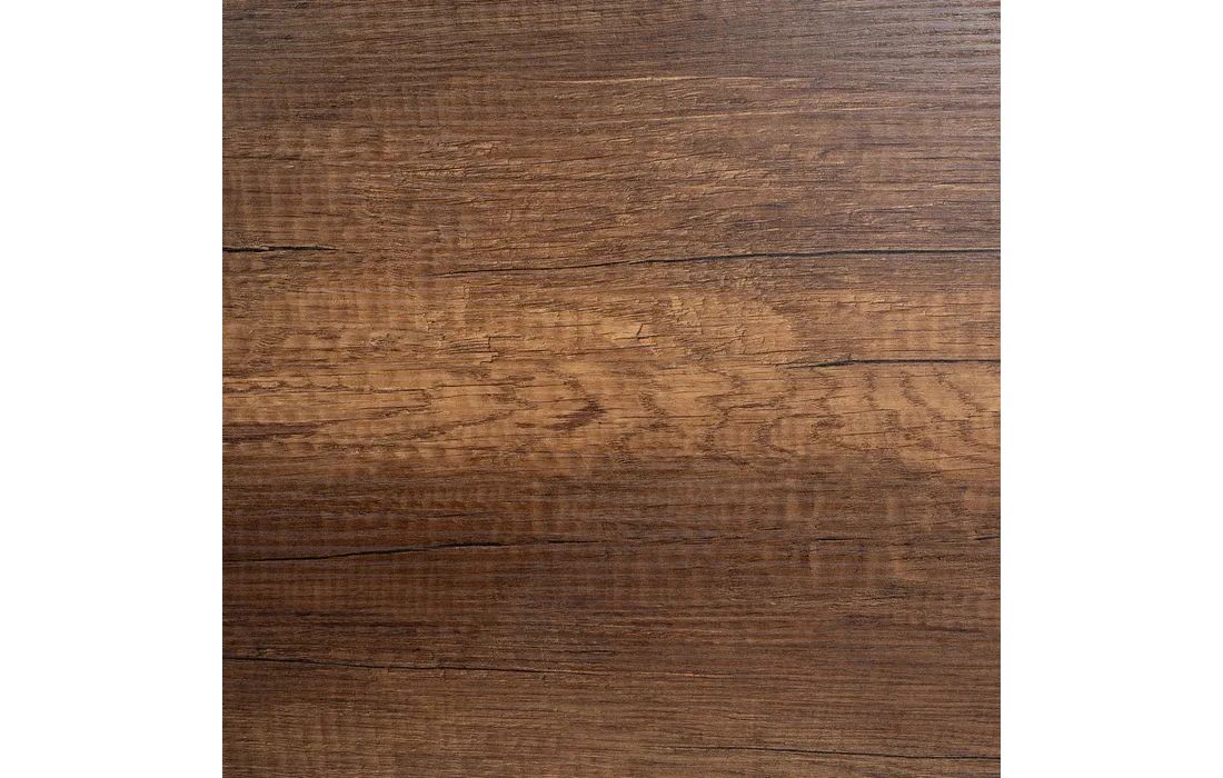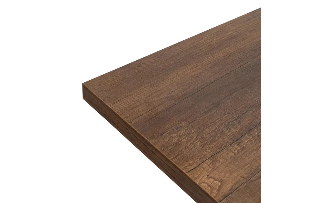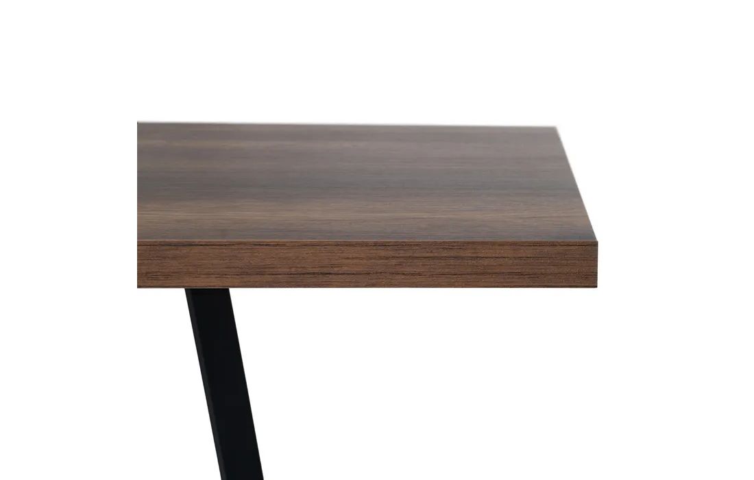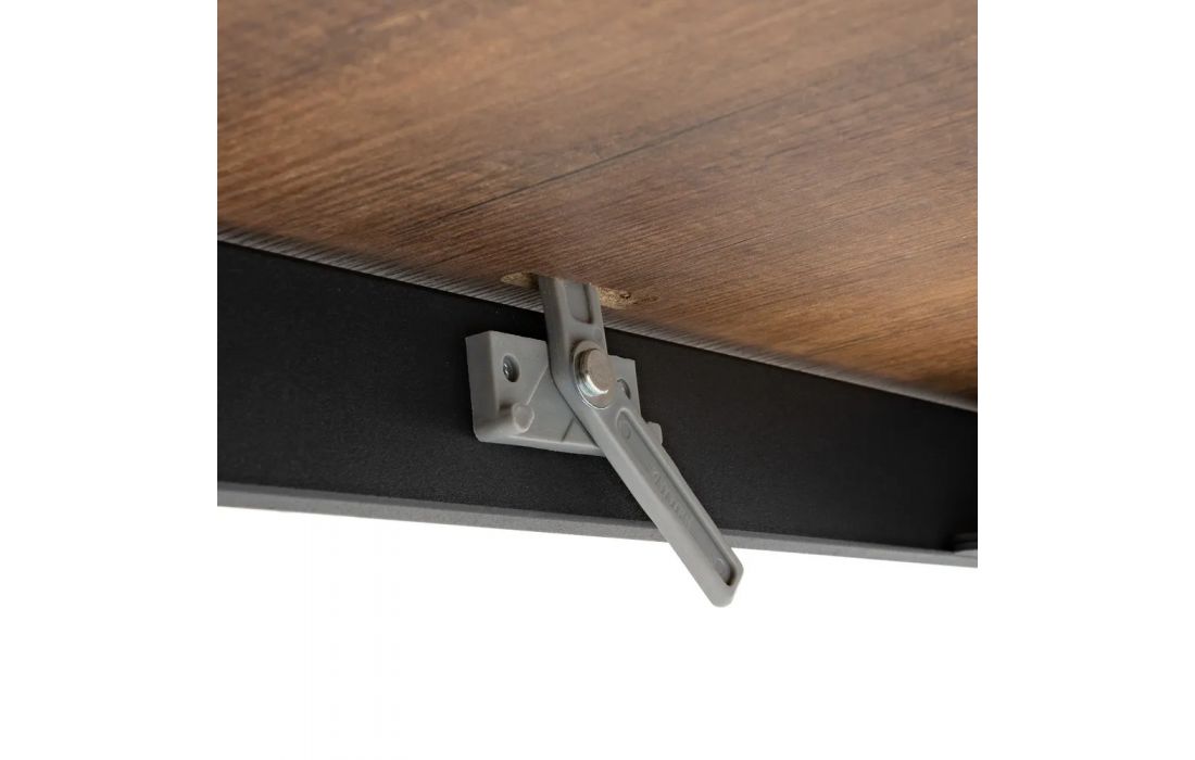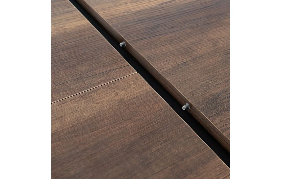 Mesa de jantar extensível com pés em ferro e tampo em madeira.