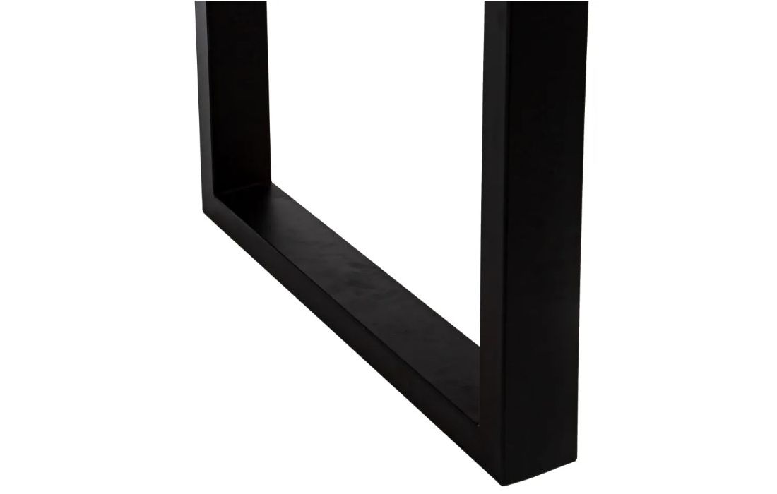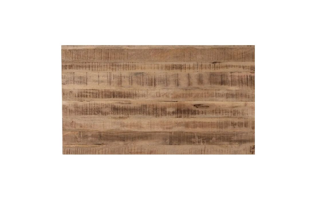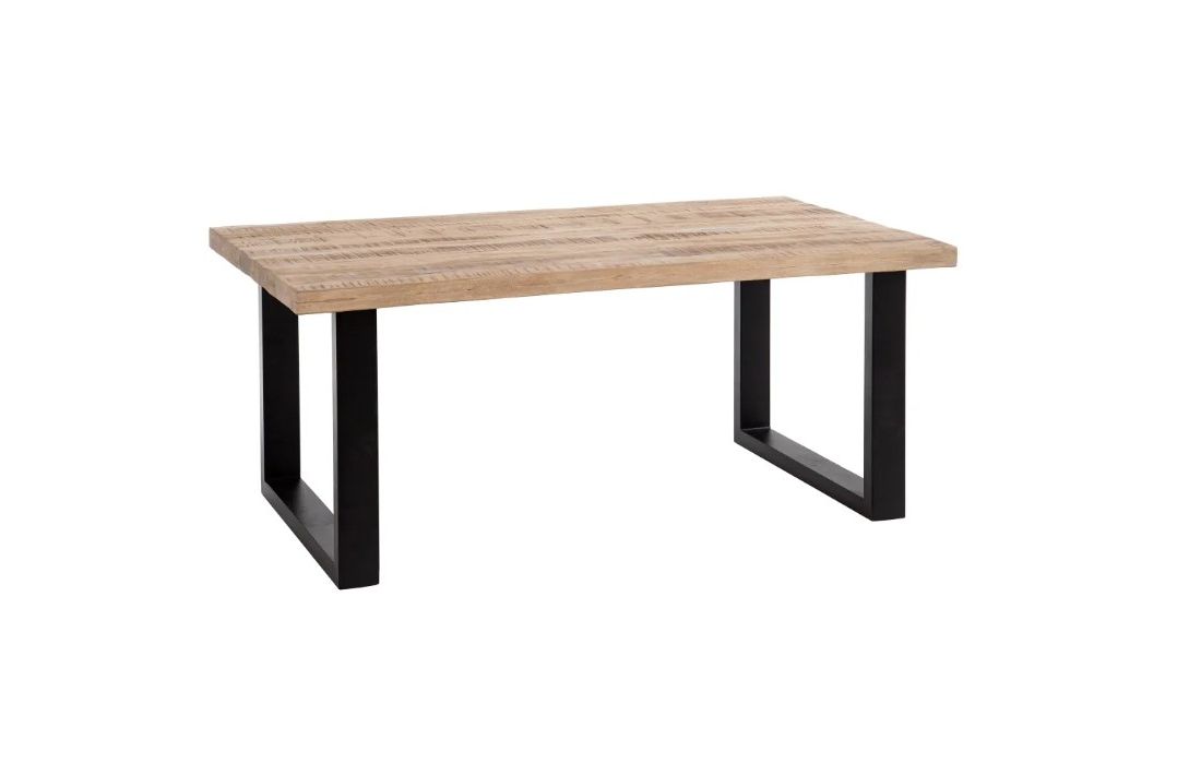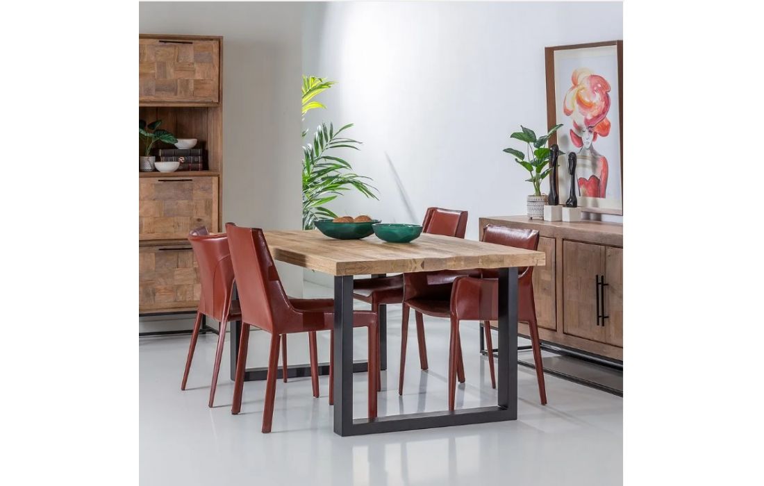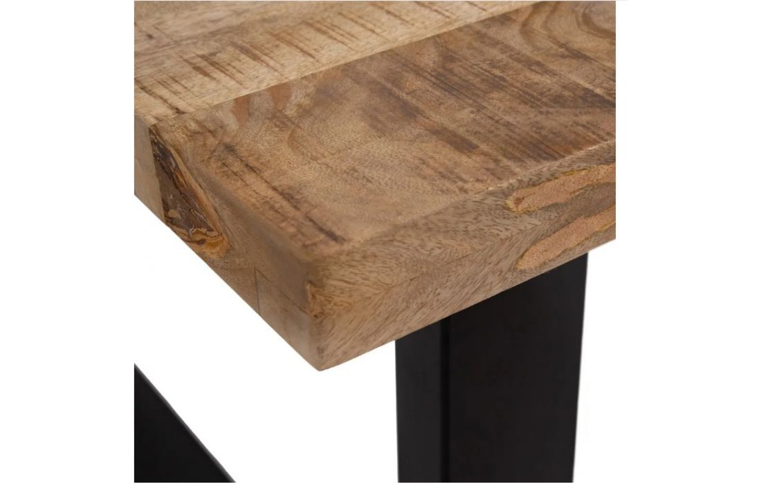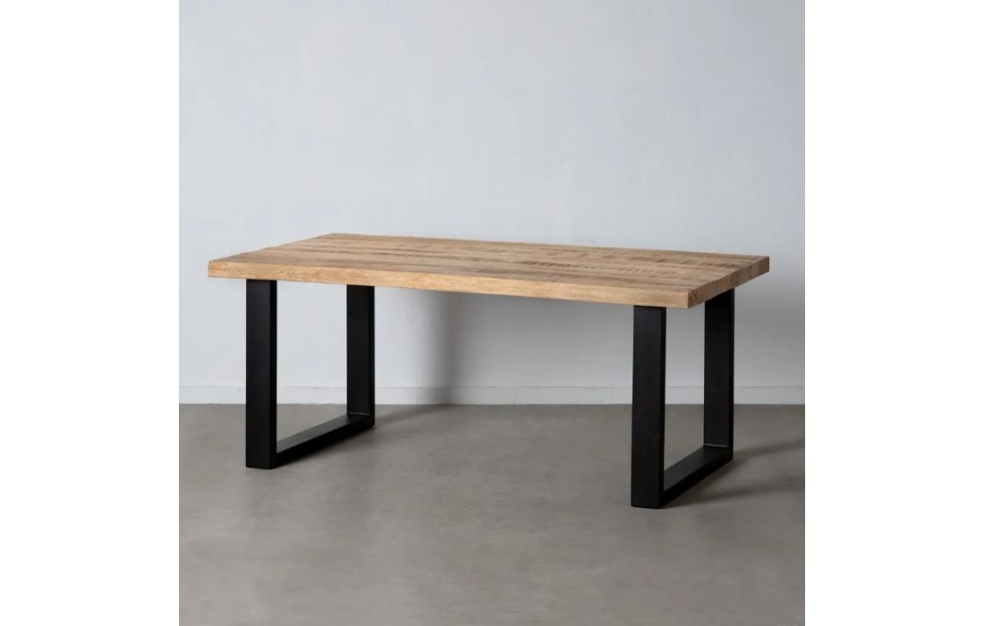Mesa de jantar de madeira de manga com pernas de ferro.
