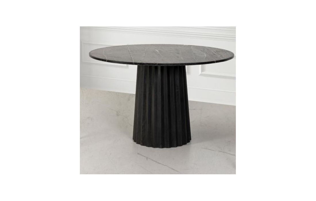 Mesa de jantar redonda com estrutura em madeira com tampo em mármore.