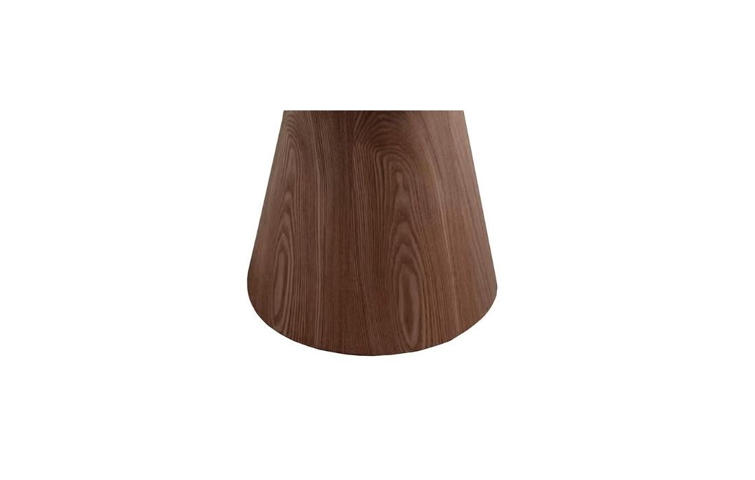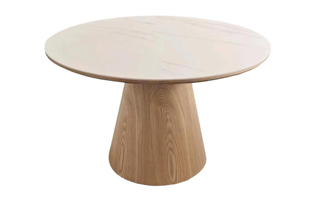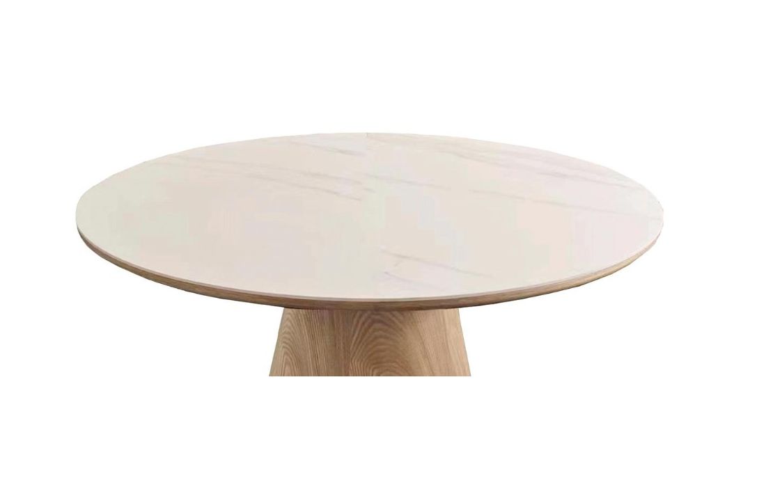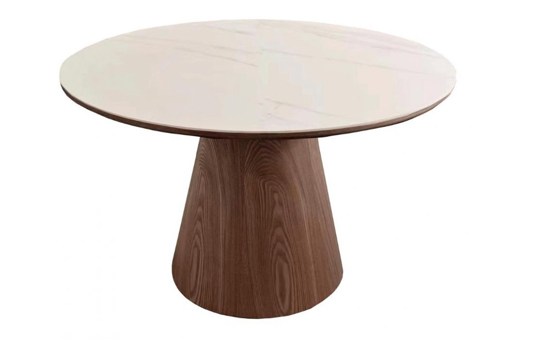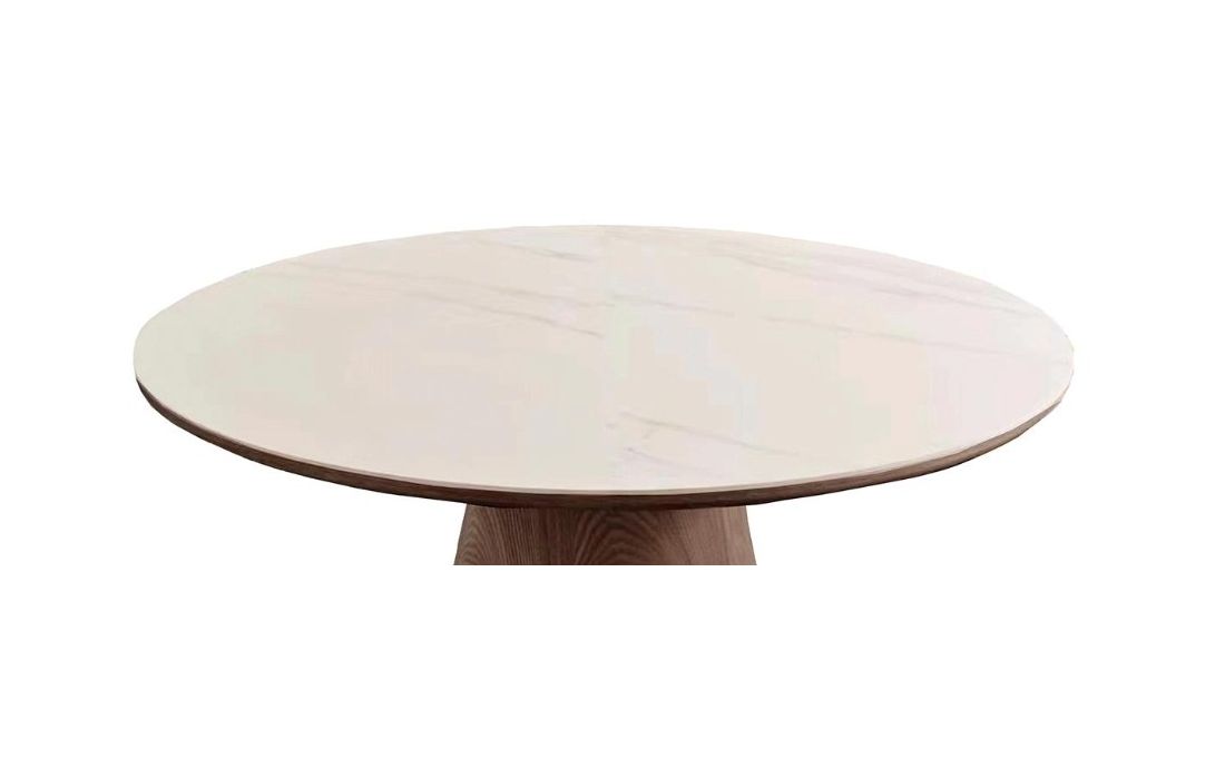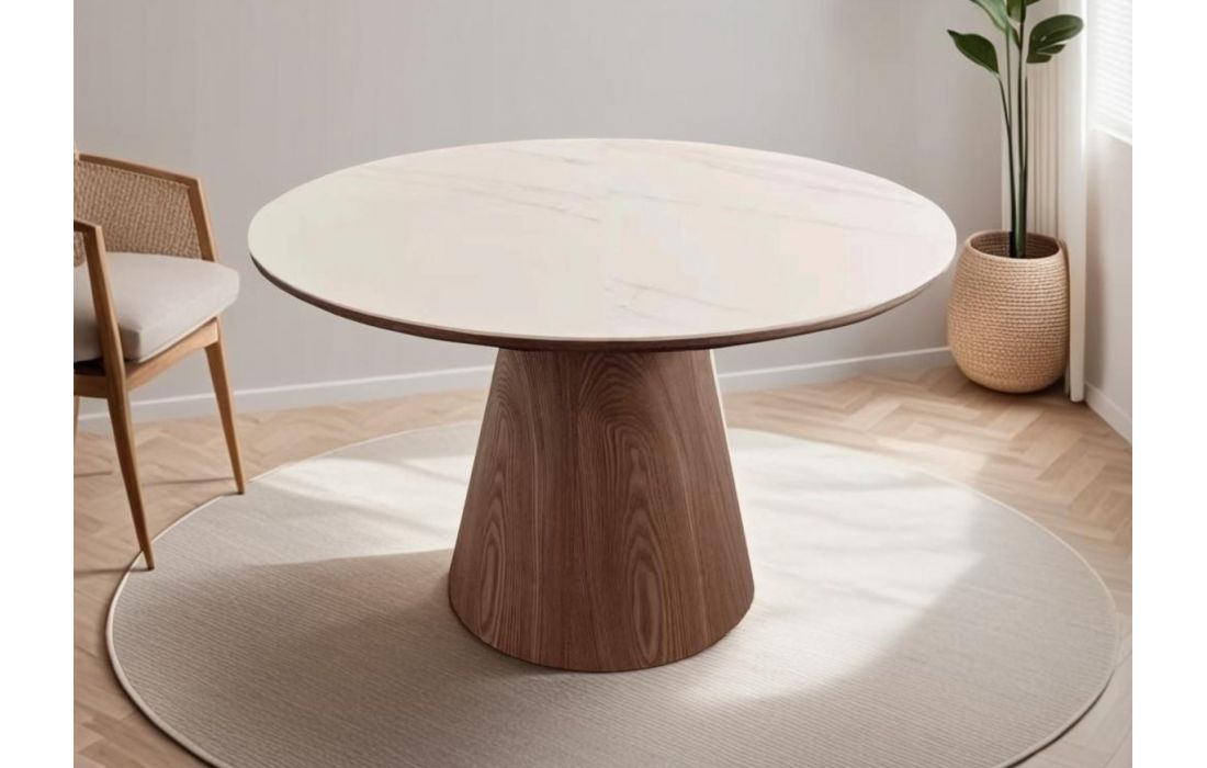Mesa de jantar redonda com estrutura em folha de carvalho e negueira com tampo em porcelana.