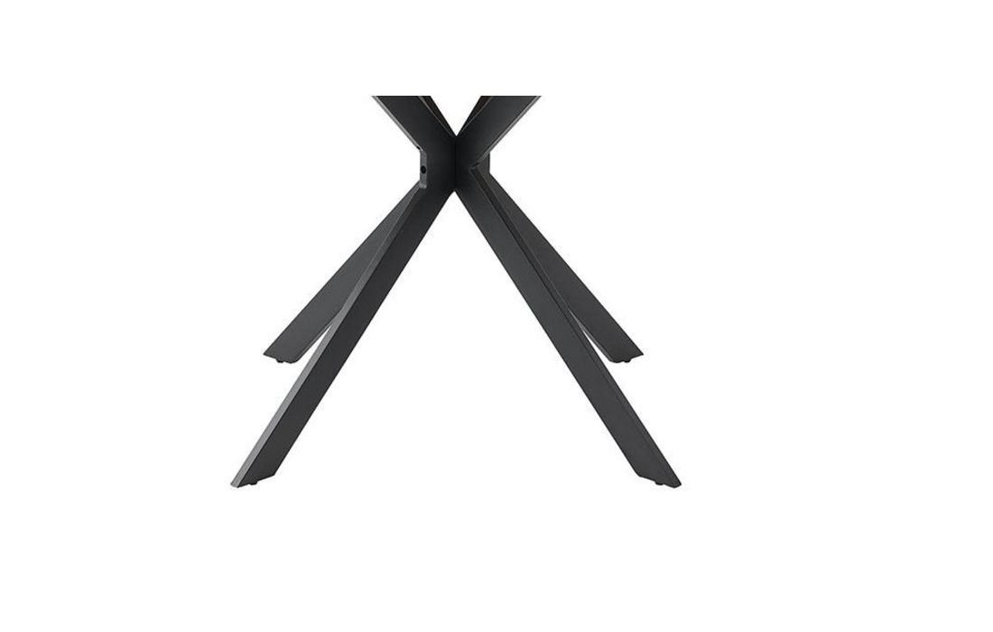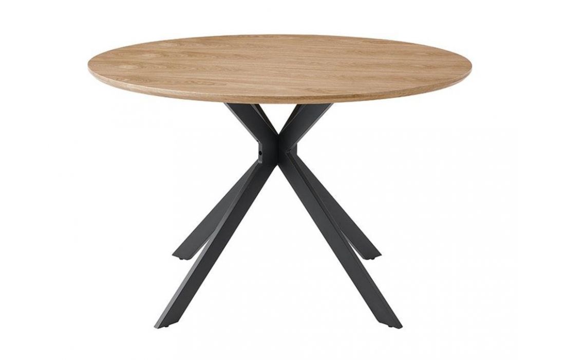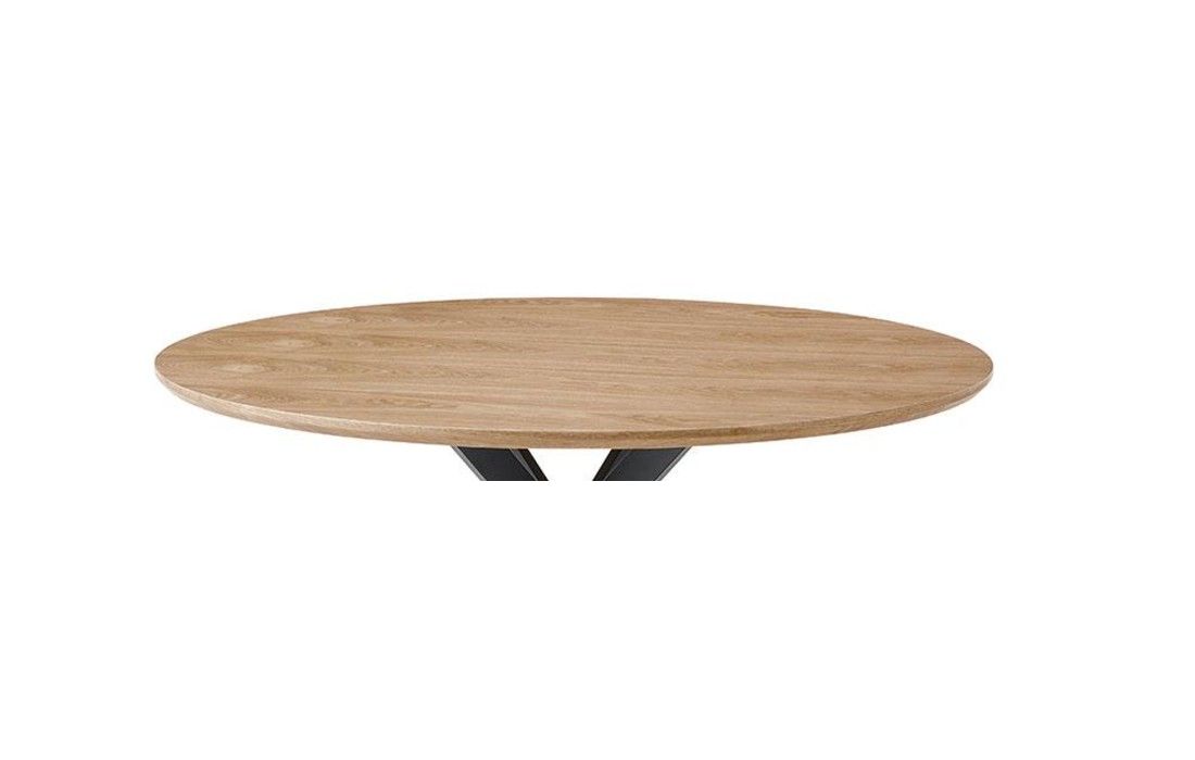 Mesa de jantar redonda com estrutura em metal com tampo em folha de carvalho.