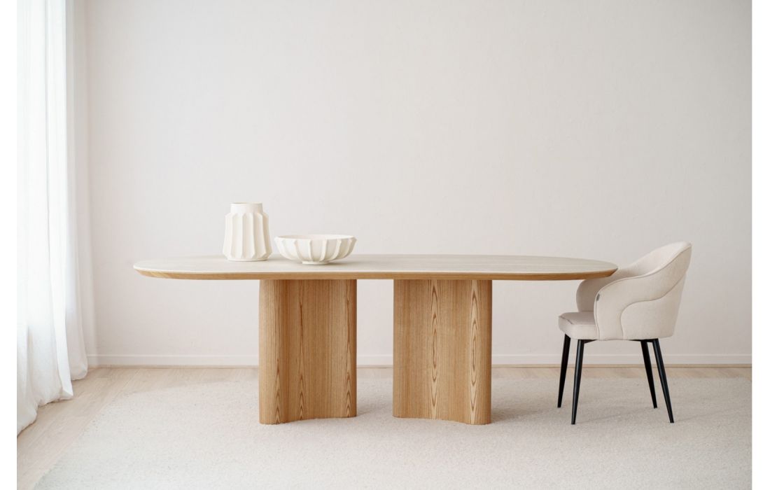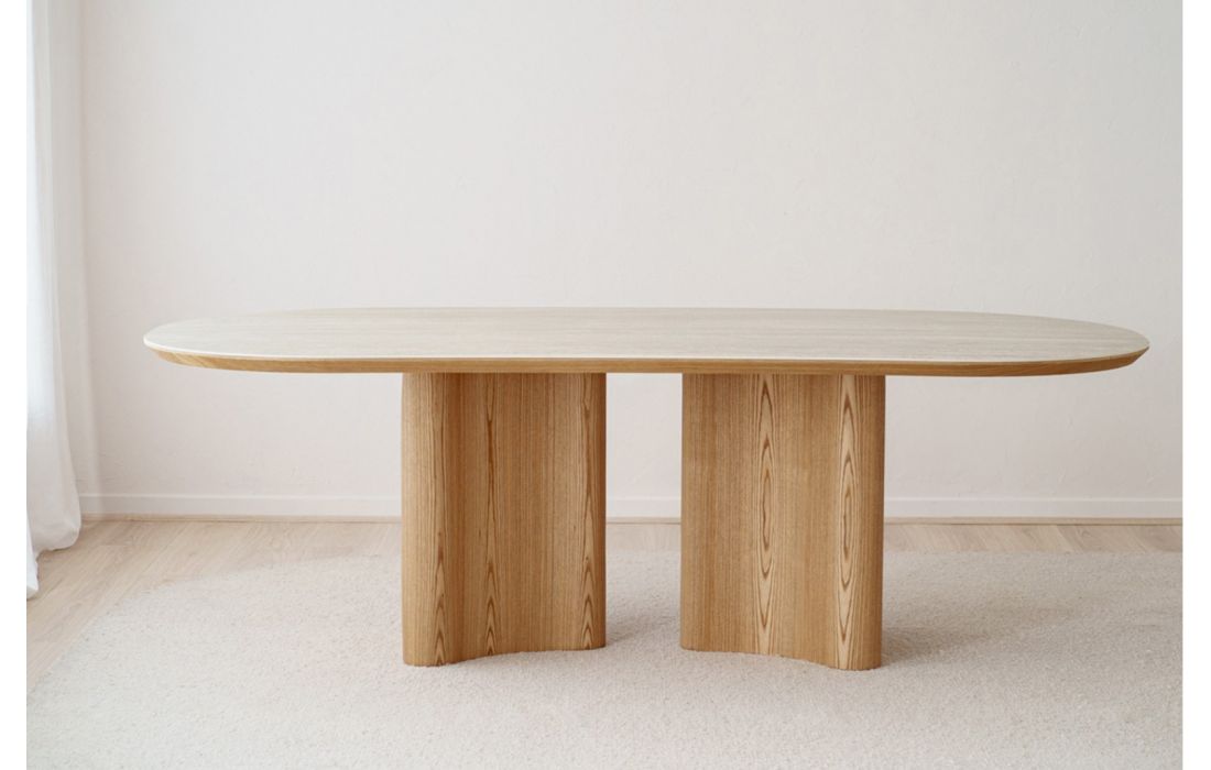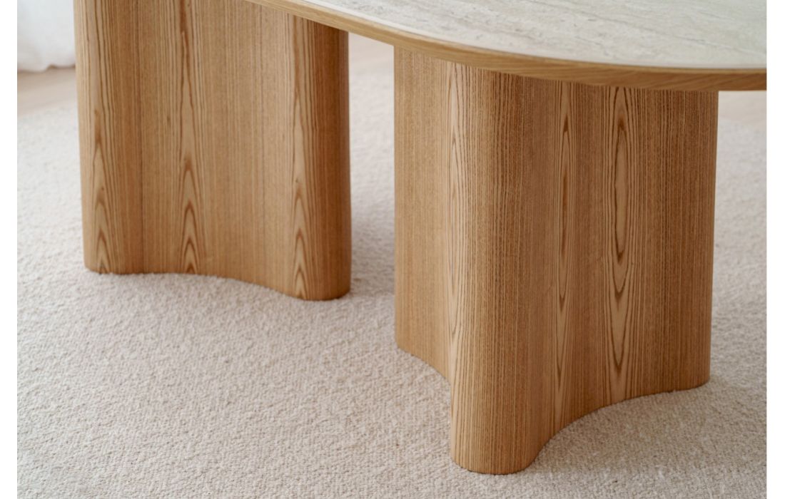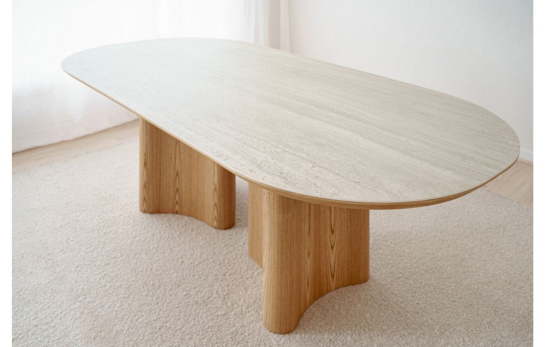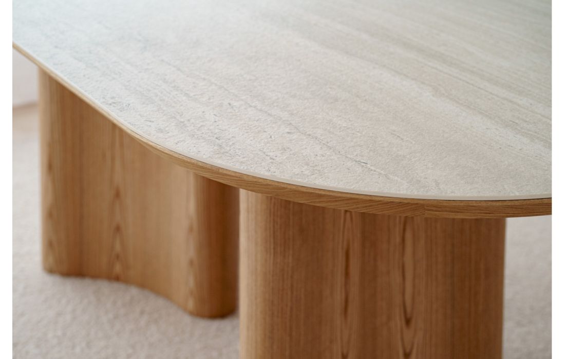 Mesa de jantar em madeira de freixo com tampo em cerâmica.